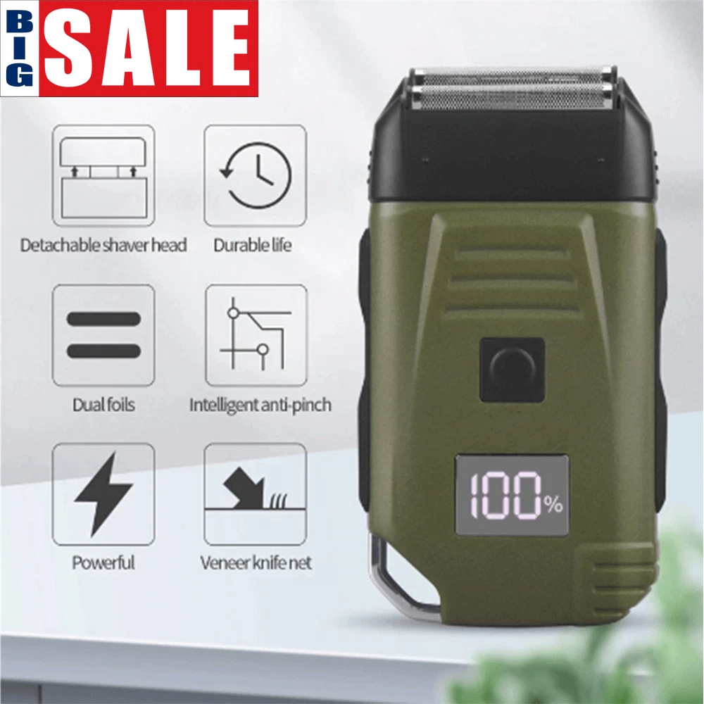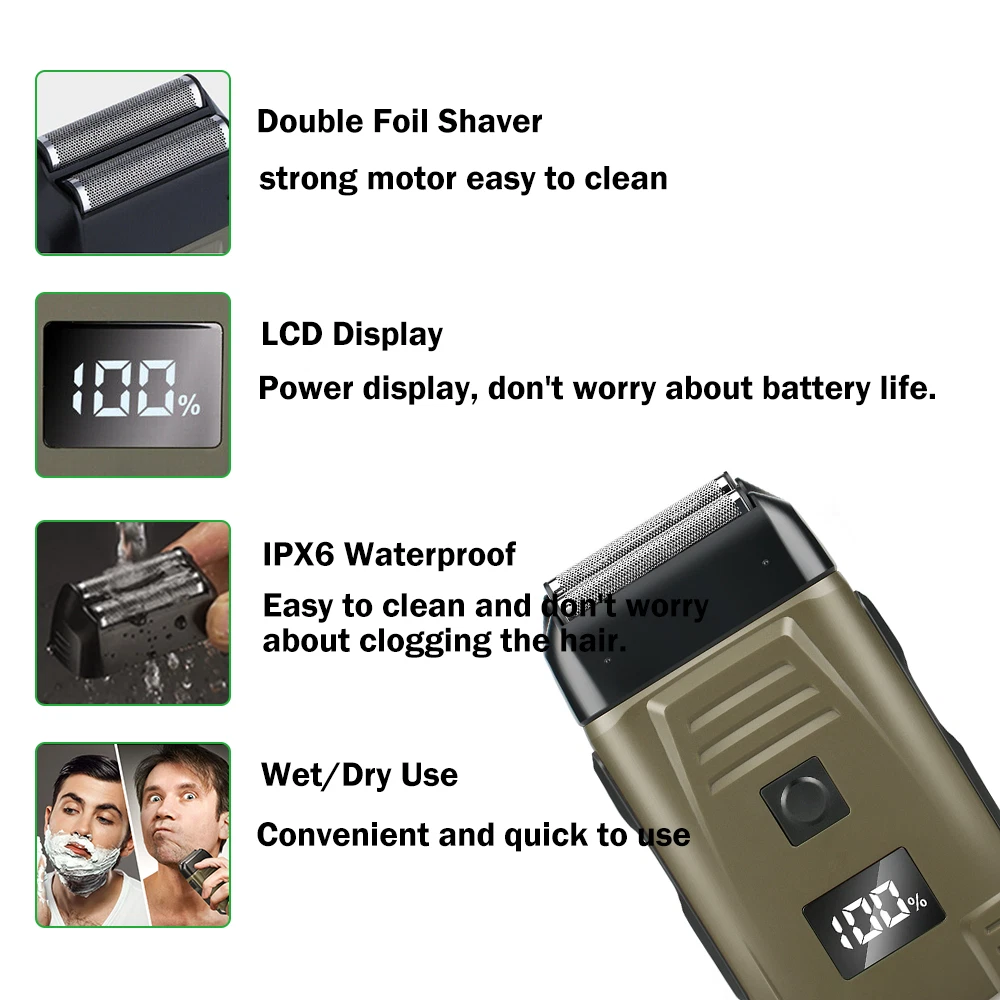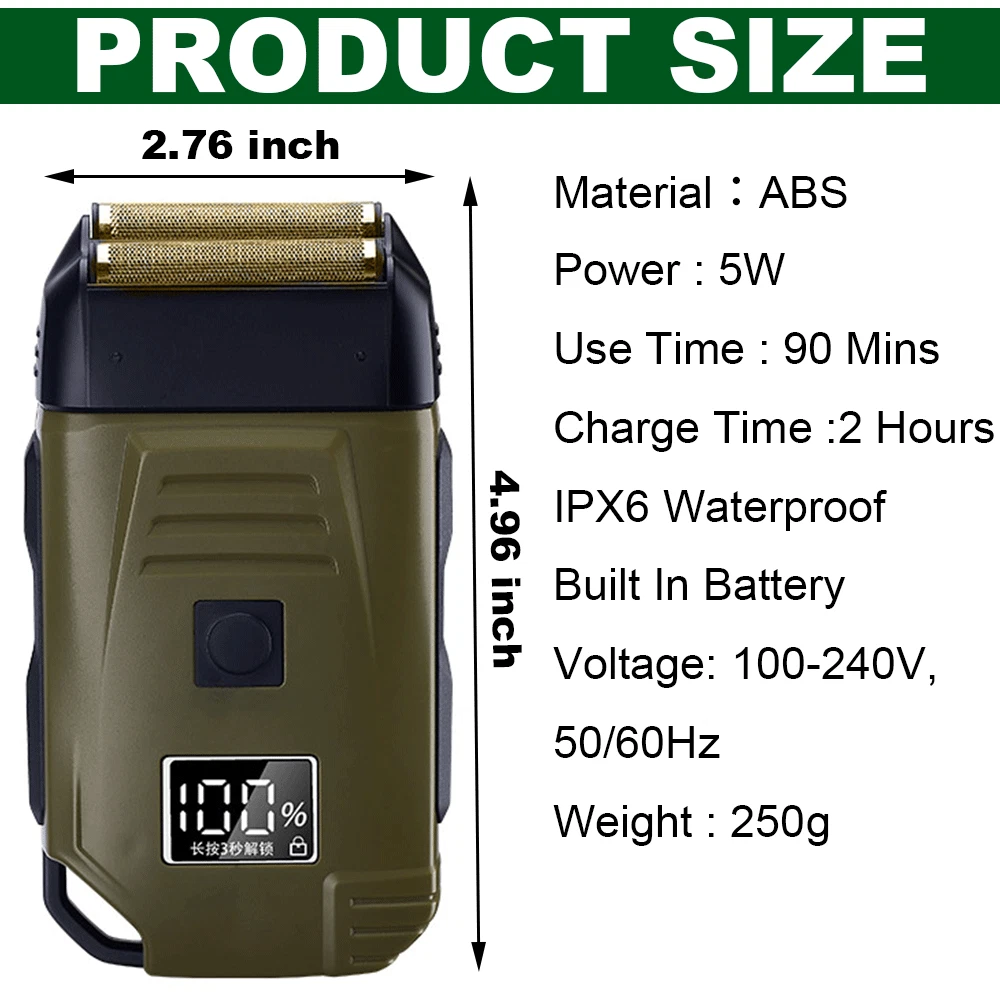 Specification Feature: Newly designed army green double-edged shaver, a machine to solve the problem of hair and beard, LCD display to check the battery at any time, IPX6 body waterproof performance, lightweight design and easy to carry. Work:Cord/cordless Type: USB Rechargeable Usage Time: 90 mins Charging Time: 2 hours Voltage: 100-240V,50/60Hz Material: ABS Weight : 250g Color : Army Green Machine Size : 4.96*2.76*1.4inch Package Size : 15.2*9.*4.5cm/6.1*3.7*1.7inch Package Included: 1* trimmer 1* Protective cover 1*charger 1* Cleaning brush 1* Manual NOTE: Due to transportation reasons, all our haircut products are not equipped with oil bottles, please understand the inconvenience