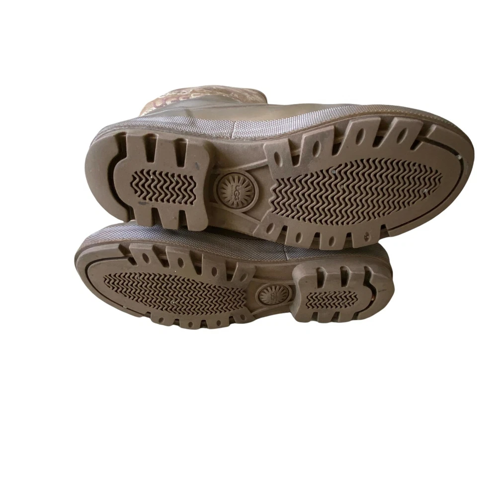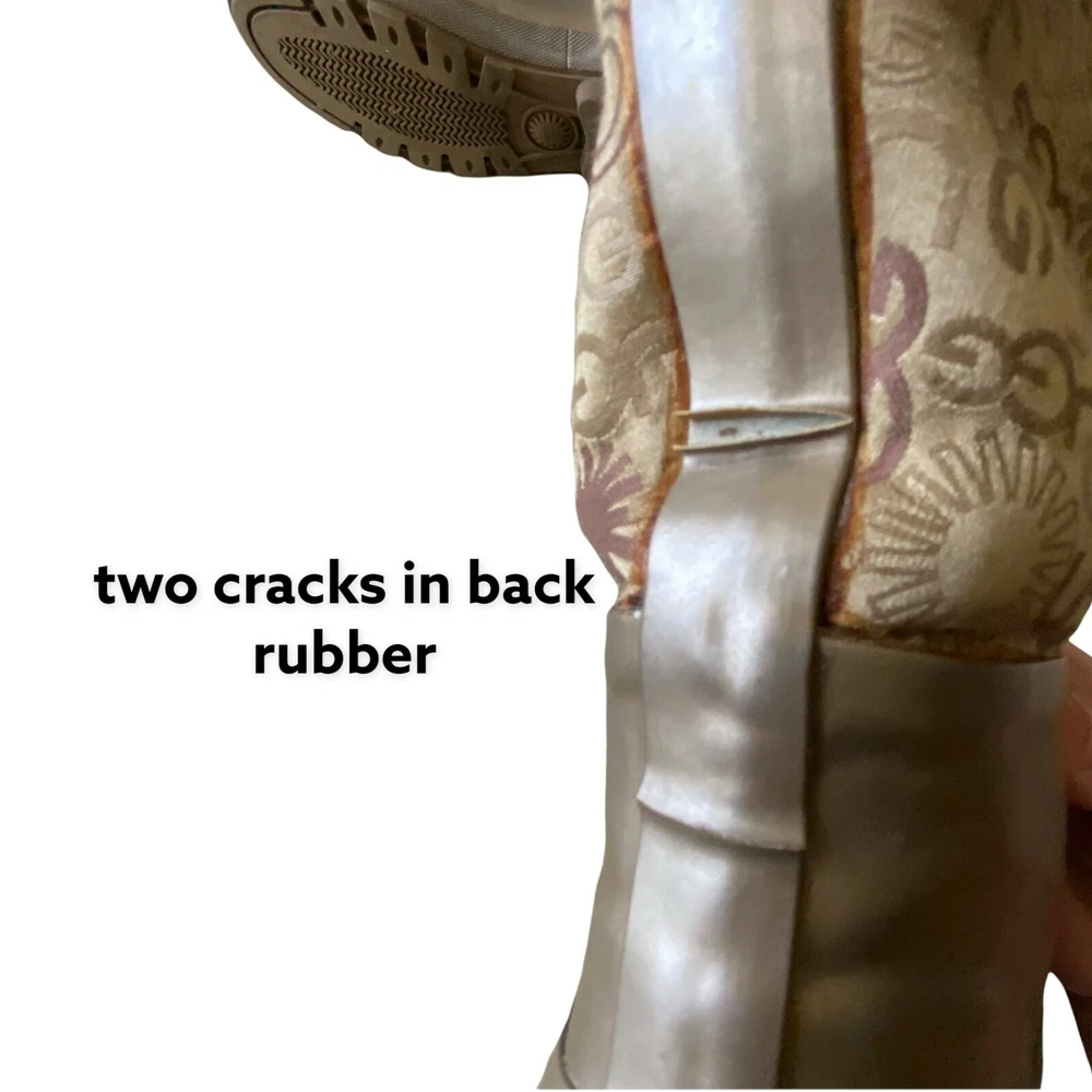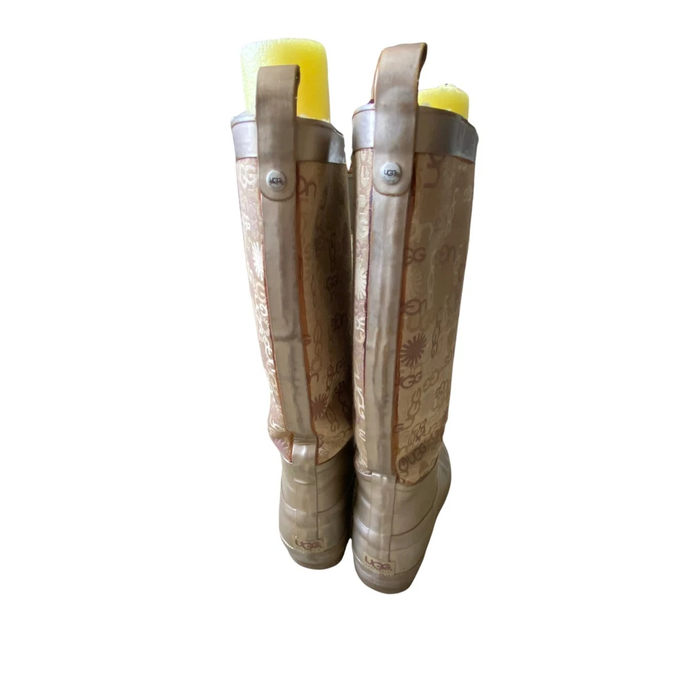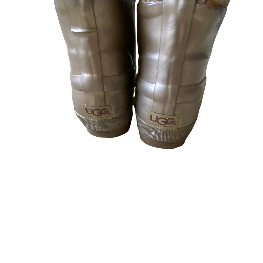 Vintage Ugg Women's 5700 Gold Rubber Textile Round Toe Knee High Rain Boots Sz 7 Brand: Ugg Department: Women MPN: 5700 Type: Boot Style: Rain Boot Color: Gold US Size: US 7 UK Size: UK 5.5 Pattern: Solid Closure: Pull On Theme: Classic Features: Comfort, Breathable Occasion: Casual Season: Fall, Winter Shoe Shaft Style: Knee High Toe Shape: Round Toe Country/Region of Manufacture: China Condition: Pre-owned, Some glue showing. Two cracks in rubber at back of boot. See photos. Can be worn as is. Still great boots with some wear/scuffing to rubber.