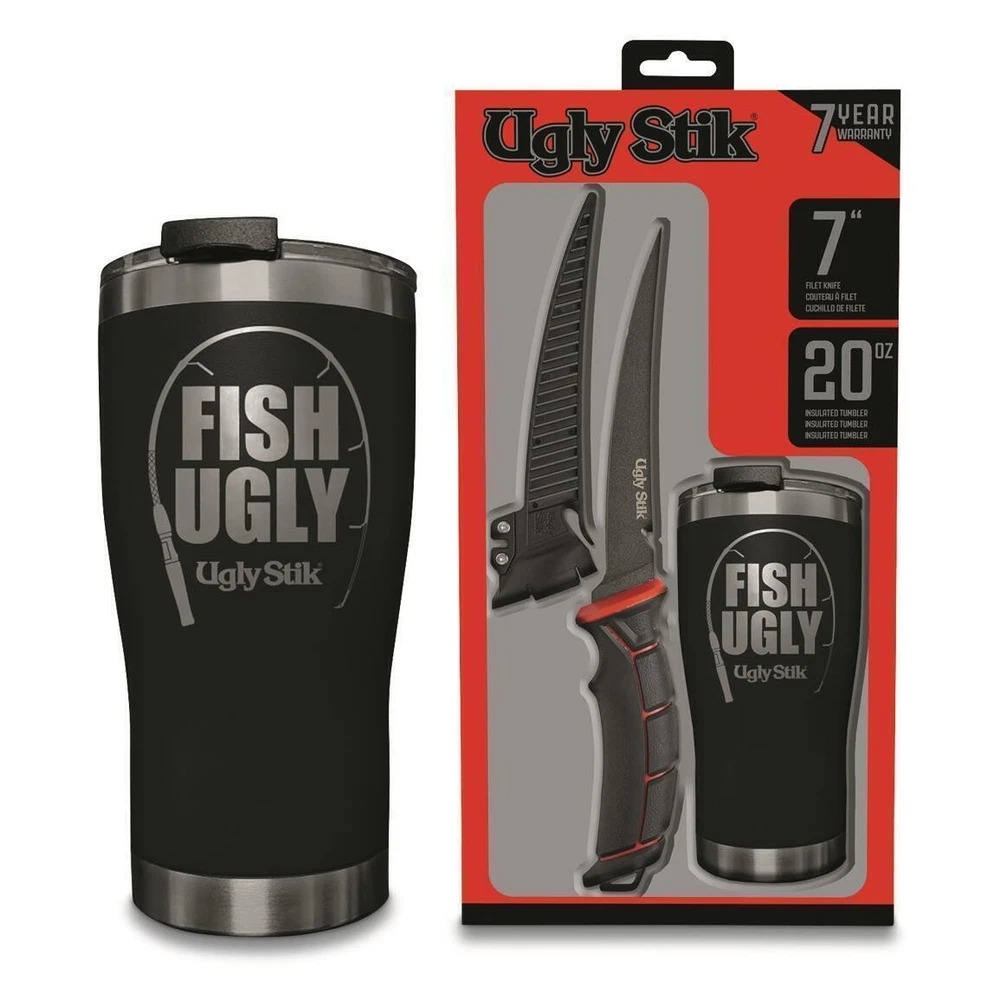 Ugly Stik Fillet Knife with Sheath/Sharpener 7" Knife Ugly Tools are designed with the angler and outdoor conditions in mind. Robust non-slip handles give the angler more control in any condition and rugged metals with hardy coatings ensure that fillet blades will not corrode or pit. This giftable set includes an authentic Ugly Stik 7" fillet knife with a protective sheath and an Ugly Stik 20oz Stainless Steel insulated tumbler ideal for taking your hot coffee with you on an early morning fishing expedition! 7" Filet Knife With Sheath Fish Ugly Vacuum Insulated, Stainless Steel Tumbler Warranty: It is the buyer's responsibility to return the goods to the place of purchase for a warranty assessment. Payment: For a fast transaction we recommend Paypal, otherwise we accept Direct Deposit and local pickup. Contact: If you have any questions or queries about our products, please do not hesitate to send us a message. Ugly Tools are designed with the angler and outdoor conditions in mind; Robust non-slip handles give the angler more control in any condition and rugged metals with hardy coatings ensure the fillet blades will not corrode or pit. The kit includes: 7" SERRATED KNIFE 7" TAPERRED KNIFE 7" GENERAL UTILITY KNIFE KNIFE ROLL CARRYING CASE Warranty: It is the buyer's responsibility to return the goods to the place of purchase for a warranty assessment. Payment: For a fast transaction we recommend Paypal, otherwise we accept Direct Deposit and local pickup. Contact: If you have any questions or queries about our products, please do not hesitate to send us a message.