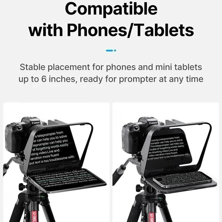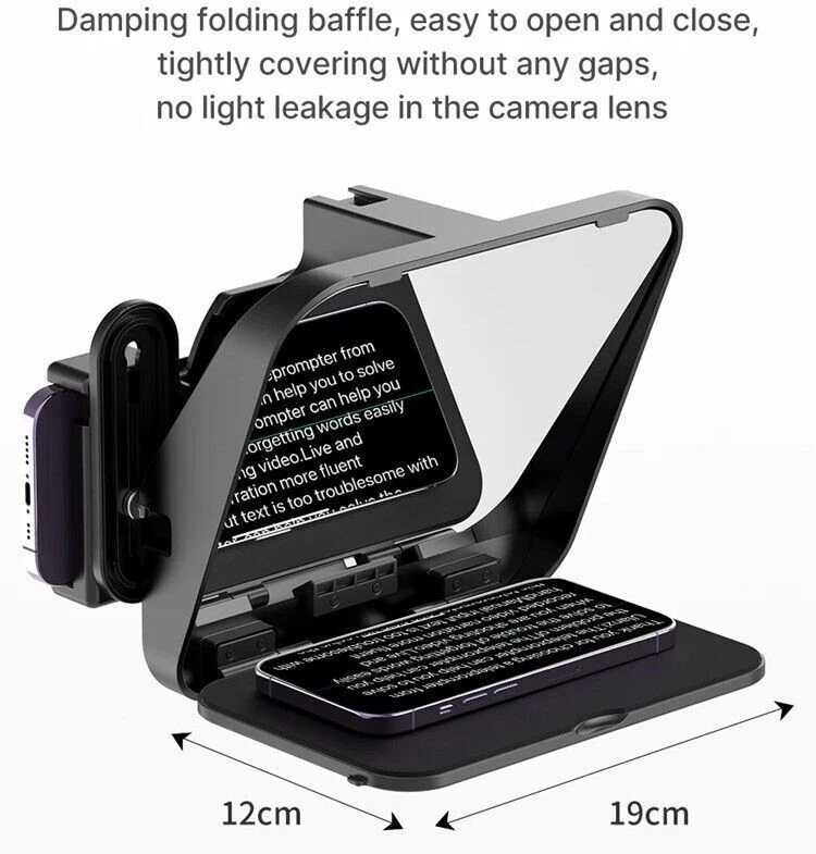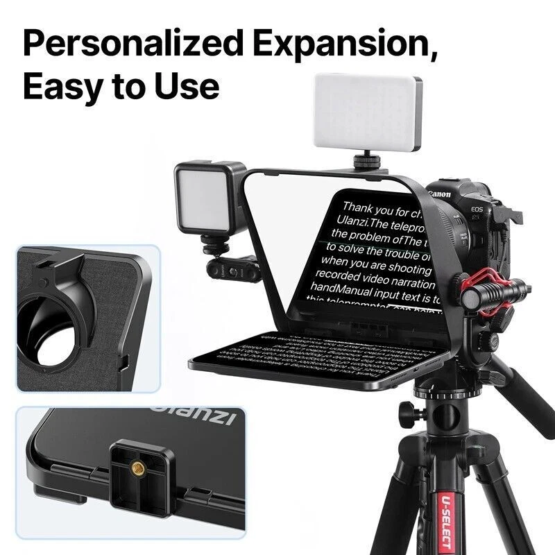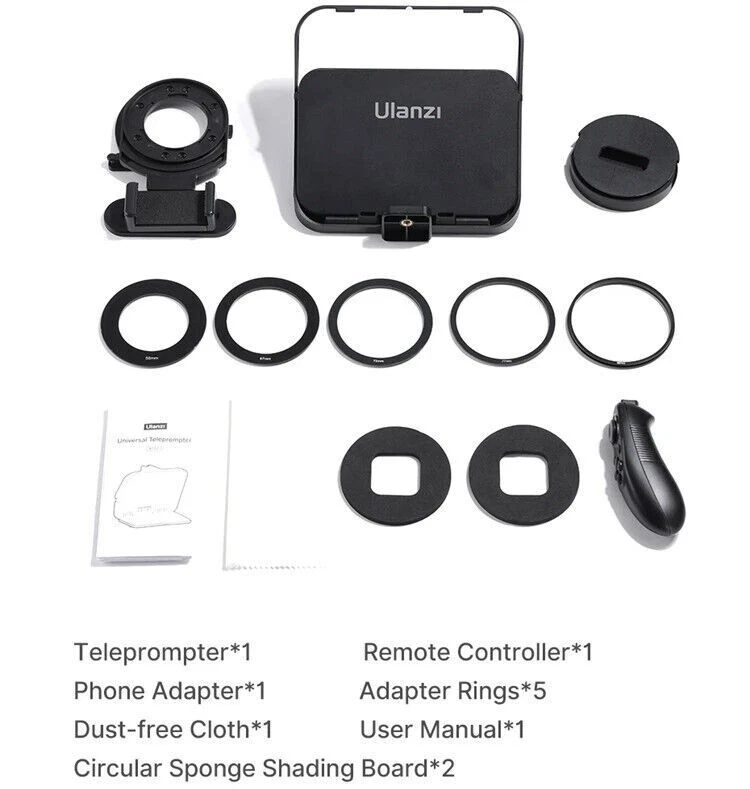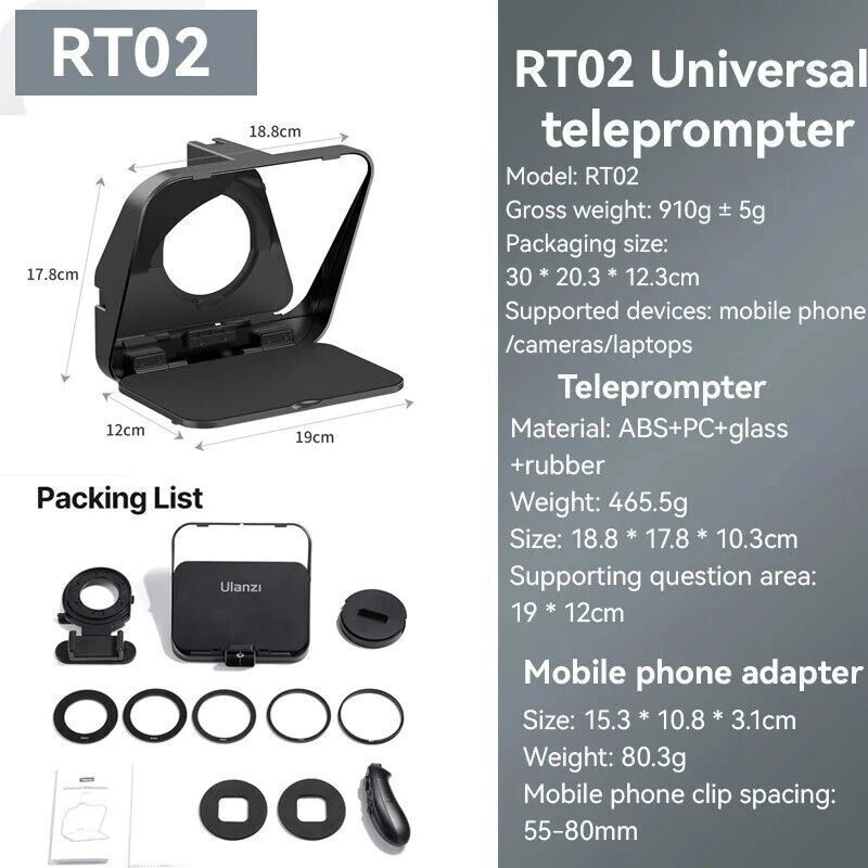 Ulanzi RT02 Teleprompter Video Prompter for Camera DSLR Smartphone With Remote Ulanzi RT02 Big Screen Prompter Professional Interview Foldable Teleprompter for Smartphone DSLR Camera Live Video Recording Stable placement for phones and mini tablets up to 6 inches, ready for prompter at any time Large Foldable Baffle, No Light Leakage Damping folding baffle, easy to open and close, tightly covering without any gaps, no light leakage in the camera lens 1. Thickened Anti-slip Silicone Pad, Stabilized Prompting without Dropping 2. Back Adhesive Material, Simple and Elegant Design 3. Clean with Dust-free Cloth, Glass Panel Resists Fingerprints Note: Glass panel is fragile , please hold it gently when using it 3-in-1 Versatile Compatibility Maintain eye level and lens alignment for different devices , comfortable and natural shooting, steady eye contact Quick Release Phone Clip, Efficient Switching Press and release the button , remove the outer cover of the mounting port, align and click to switch to phone mode Come With Camera Lens Adapter Ring Equipped with 58 / 67 / 72 / 77 / 82mm adapter, rings , suitable for most camera lens sizes Wide-angle Shooting, No Vignetting Support wide-angle lens shooting, wider field of view complete and full shooting without vignetting * Camera lens focal length and wide-angle have differences, some lenses may have vignetting below 35 focal length , please adjust the focal length to avoid vignette blocking Personalized Expansion, Easy to Use Cold shoe mount for fill light , microphone 1/4 " screw port for desktop stand tripod Bluetooth handle, Control with Ease With the APP teleprompter, Bluetooth controller allows remote operation, page turning, speed adjustment , font and background color changes browsing conveniently and quickly Teleprompter App Compatible with ios / Android systems or phones and mini tablets , easy to use Various Scenes, Easy to Handle Clear prompter function , no need to memorize smooth and natural presentation, outstanding results Packing List Teleprompter *1 Remote Controller*1 Phone Adapter *1 Adapter Rings* 5 Dust-free Cloth * 1 User Manual *1 Circular Sponge Shading Board *2 Payment Delivery details Terms of sales About us Contact us Payment Warning : every international Order will have inport Tax problem with Customs ,Please clear customs by buyer,we will lower the declare price on invoice Please do not open the Return directly ,any order problem You can send message to us first ,we will solve it very fast ,thank you 1.We accept payment via T/T, PayPal for USD dollars .Alipay and Wechat payment for RMB 2.We will deliver your goods within 20days after payment. 3.We will pack the goods well with exporting packages and bubble wrap to make sure all goods in a good condition during storage and delivery. 4.We usually use express delivery like DHL, UPS, FedEx, TNT and EMS, as we enjoy perfect discount in these companies. 5.We have well-trained and professional sales & after-sale services persons who can speak English fluently. Delivery details Each international package will have inport Tax problem with Customs ,Please clear customs by buyer Terms of sales 100% Official and official product About us China mainland super top seller wholesale company about video studio photography Camera equipment cargo .100% brand original and official Contact us Please send ebay message for asking product , we will reply you in 24 hours ,thank you