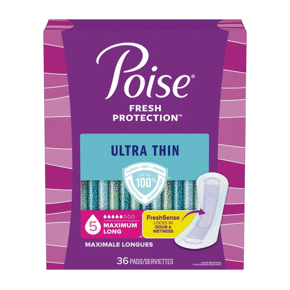 Feel confident with our thinnest incontinence pad, Poise Ultra Thin Incontinence Pads. Poise pads are designed to offer protection specifically against light bladder leaks, unlike period pads, which are meant for menstrual needs. Each bladder control pad has a Dry-Touch layer that rapidly locks away 10x more* wetness for a clean feel and offers up to zero leaks. Plus, our disposable incontinence pads are made with Leak-Block sides for dryness and outstanding protection. As our thinnest protection, our incontinence pads have a Thin-Flex design that holds its shape for all-day comfort. These women’s pads for incontinence are made with breathable materials that let fresh air in to help eliminate dampness and keep you feeling clean and fresh. Poise incontinence pads are available in light, moderate and maximum absorbencies. For lighter absorbency needs, check out Poise Daily Liners. Shop for Poise discreetly by having it shipped directly to your door or pick up curbside. Poise adult incontinence products are HSA/FSA-eligible in the US. (*vs. leading period pads, 24 ml of fluid) POISE ULTRA THIN INCONTINENCE PADS: 36 incontinence and postpartum bladder leak pads, 5 drop maximum absorbency, long length (36 pads total) OUR THINNEST PROTECTION: Poise Ultra Thin Pads have a Thin-Flex design that holds its shape for all-day comfort DESIGNED TO KEEP YOU DRY: Our ultra thin incontinence pads have a Dry-Touch layer that rapidly locks away 10x more* wetness for a clean feel (*vs. leading period pads, 24 ml of fluid) UP TO ZERO LEAKS: These Poise pads deliver up to zero leaks and feature Leak-Block sides for outstanding dryness and protection ODOR CONTROL TECHNOLOGY: Each incontinence pad features Poise’s FreshSense system that helps neutralize even strong bladder leak odors for up to 12 hours For all-night protection, try Poise 8 Drop Overnight Incontinence Pads for Women Poise adult incontinence products are HSA/FSA-eligible in the US; product and packaging may vary