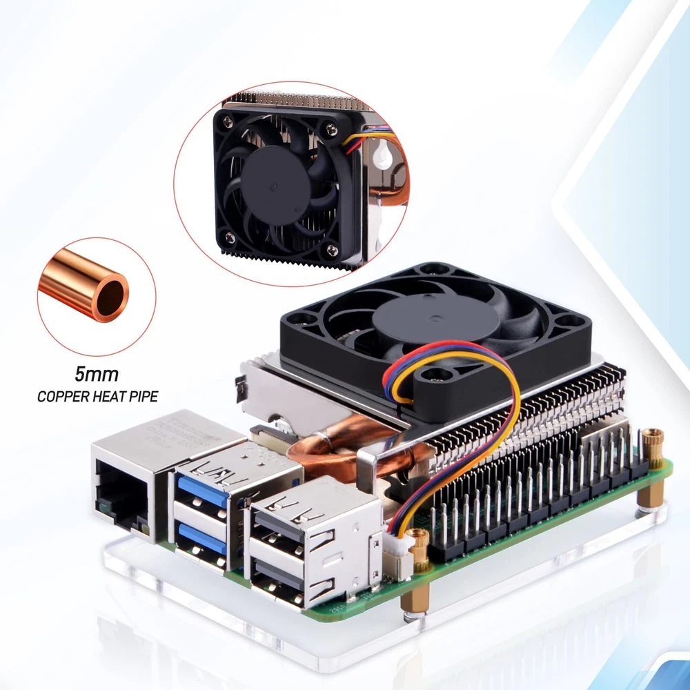 Horizontal Tower Design --- The horizontal layout of the cooler enhances heat dissipation by increasing the contact area with the ambient air, leading to more effective cooling. Ultra-Thin Fins --- The fin array is designed to be ultra-thin, which maximizes the heat dissipation area and improves the overall thermal performance. 4Pin JST Interface --- The cooler uses a 4Pin JST connector that is compatible with the Raspberry Pi's built-in fan control system, allowing for seamless integration and automatic speed regulation. Automatic Temperature Control --- The cooler is designed to automatically adjust the fan speed in response to the CPU temperature, ensuring that the device operates within safe thermal limits. Enhanced Cooling Efficiency --- The combination of the ultra-thin fin design and the automatic fan speed control mechanism results in superior cooling performance, keeping the Raspberry Pi 5 cool even under heavy workloads. Quiet Operation --- With intelligent fan speed control, the cooler operates quietly, minimizing noise disturbance while maintaining high cooling efficiency.