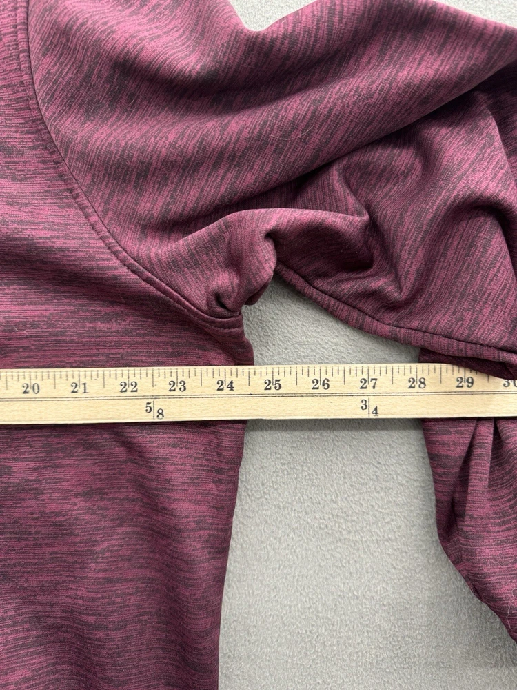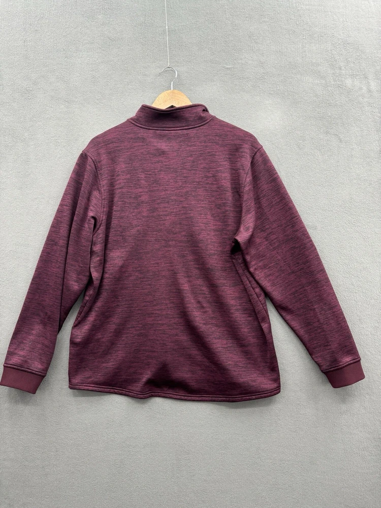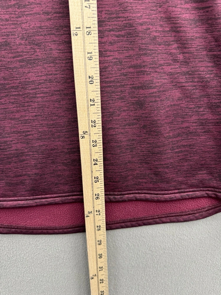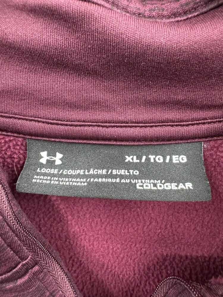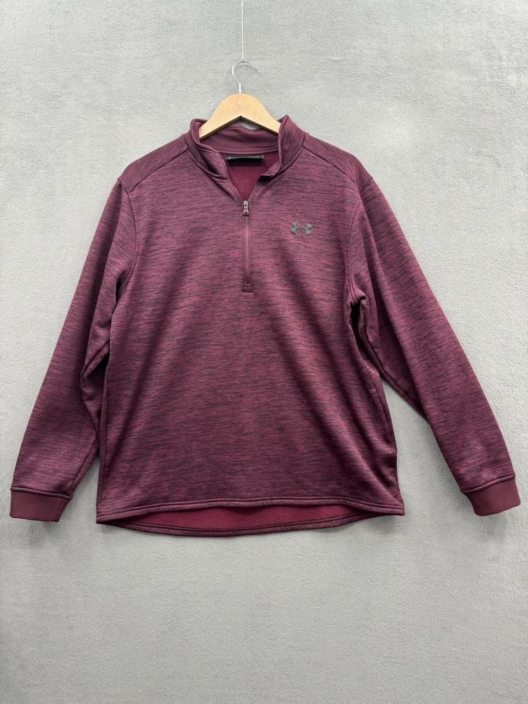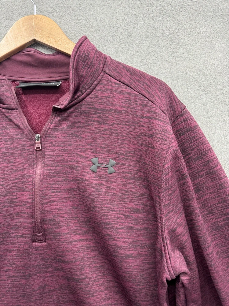 Garment has small snag on back, shown in photos. Elevate your activewear game with this Under Armour 1/4 Zip Pullover in XL size. The mock neck and long sleeves make it perfect for fall, winter, and spring seasons. The purple polyester fleece material is machine washable and features the Under Armour logo as an accent. This casual pullover is designed with a relaxed fit and is suitable for various occasions, including rugby, tennis, cycling, golf, volleyball, cross-training, basketball, netball, football, bodybuilding, hiking, squash, running, gym, training, track, and field, as well as school, CrossFit, lacrosse, and skateboarding. The 1/4 zip closure adds a touch of convenience, making it an ideal addition to your activewear collection.