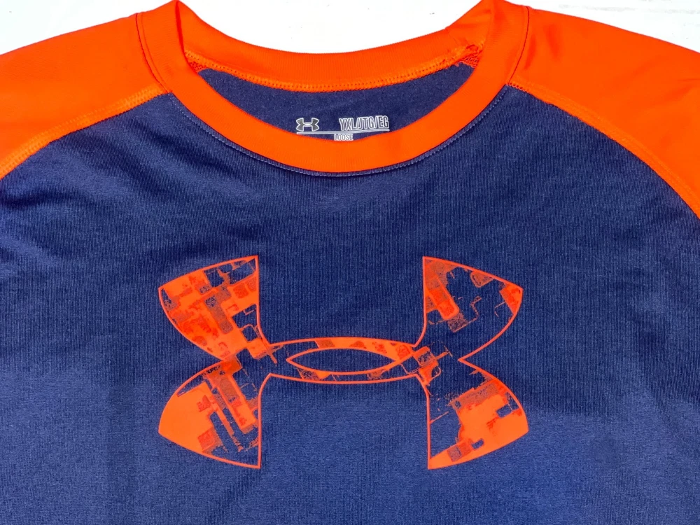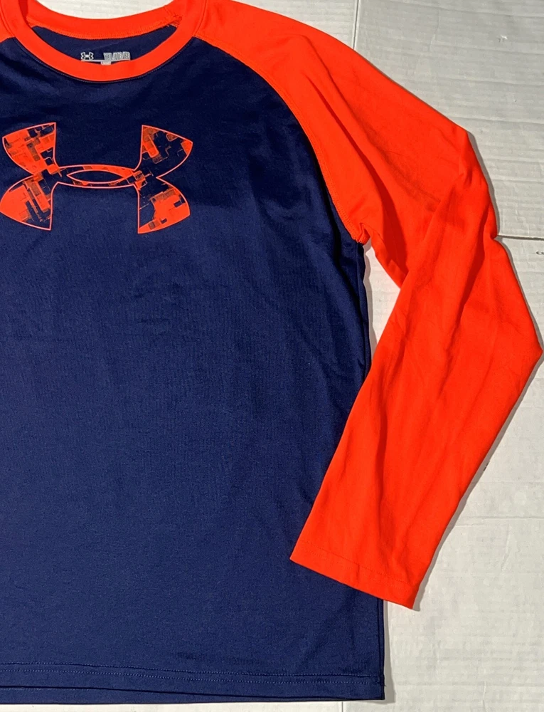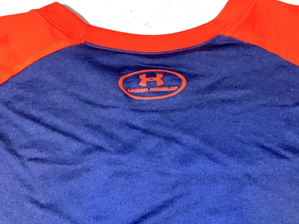 Under Armour Blue Orange Long Sleeve Heat Gear Loose Fit Athletic Shirt Top ~ Youth Boy's Size YXL = Youth XL. Measures: 20" flat across the front from underarm to underarm unstretched and 25.5" from shoulder to bottom hem.