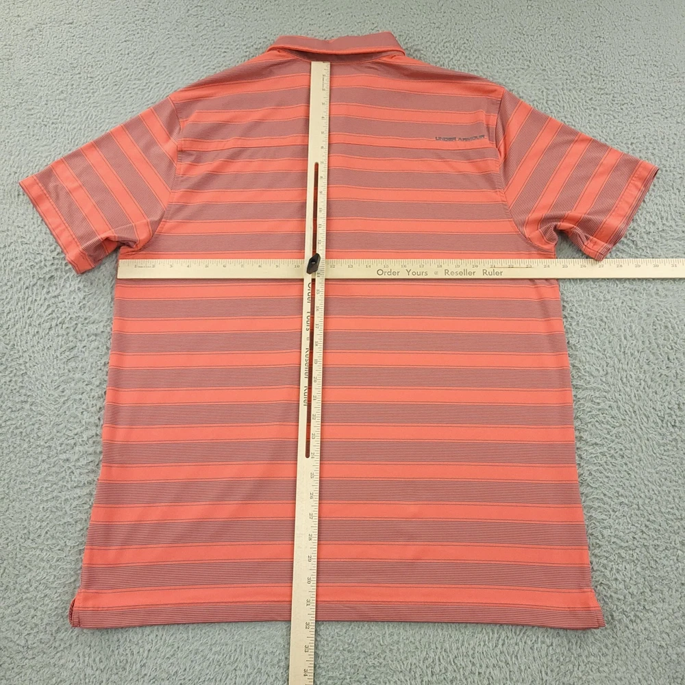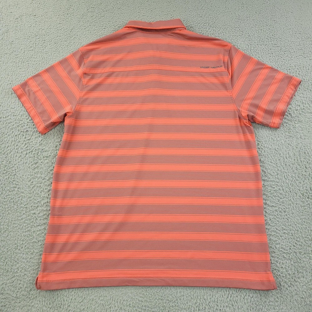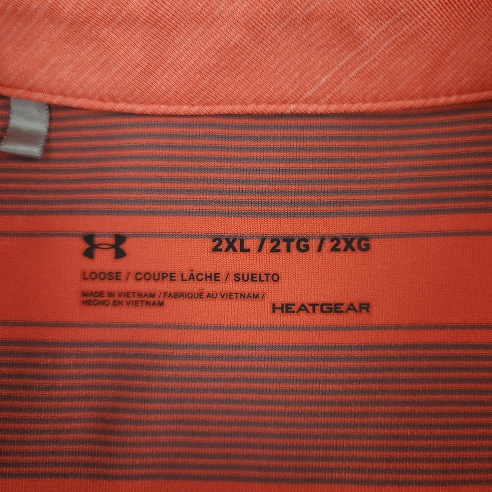 Under Armour HeatGear Polo Shirt Mens 2XL Orange Stripe Golf Performance Stretch Brand: Under Armour Style: Mens short sleeve performance golf polo shirt with three-button front placket and self-fabric collar. Color/Pattern: Orange base with thin horizontal gray stripes. Size on tag: Mens 2XL with loose, relaxed fit. Material: Polyester HeatGear performance fabric that is lightweight and moisture wicking. Details: Under Armour logo at left chest, Under Armour wordmark at upper back, tagless printed neck label for comfort, straight hem. Made in Vietnam, ideal for warm weather golf or athletic wear. Measurements are included in the photos, compare measurements with your item to ensure proper fit. Items are added daily click here to Visit My Store Combined shipping for US customers is 1.99 for each additional item Items are cleaned per eBay standards & policies