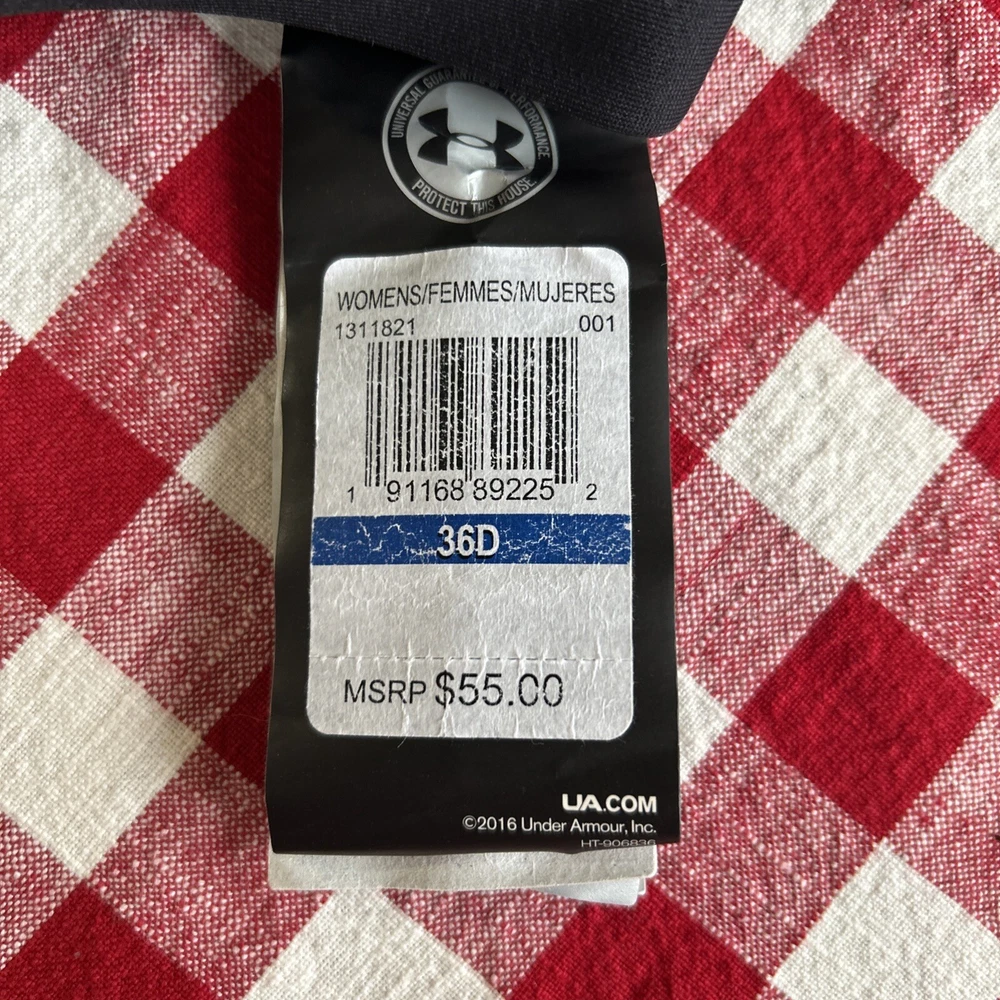NWT. This is a high-support Under Armour Sports Bra in black, featuring a solid pattern with a crossback strap design for activewear use. The bra is size 36D with a wireless underwire type, full cup coverage, and hook & eye closure. Made from a blended fabric, it is machine washable and suitable for regular wear. The brand is Under Armour, ensuring quality and performance for women engaged in various physical activities.
