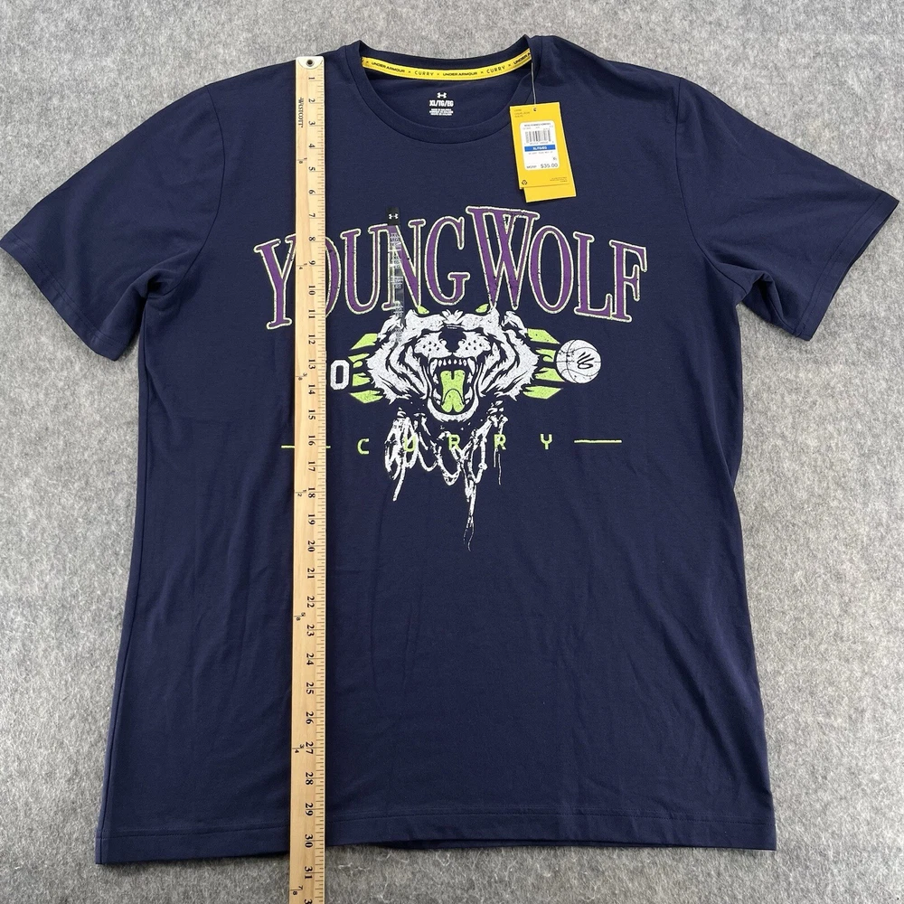 Department: Men Neckline: Crew Neck Pattern: Solid Closure: Pullover Product Line: Under Armour Curry Brand Size: XL Brand: Under armour Performance/Activity: Basketball, Bodybuilding, CrossFit, Cross Training, Cycling, Gym & Training, Running & Jogging, Walking Character: Steph Curry Type: T-Shirt Occasion: Activewear Sleeve Length: Short Sleeve Color: Blue Fit: Regular Size Type: Regular Theme: Wolf