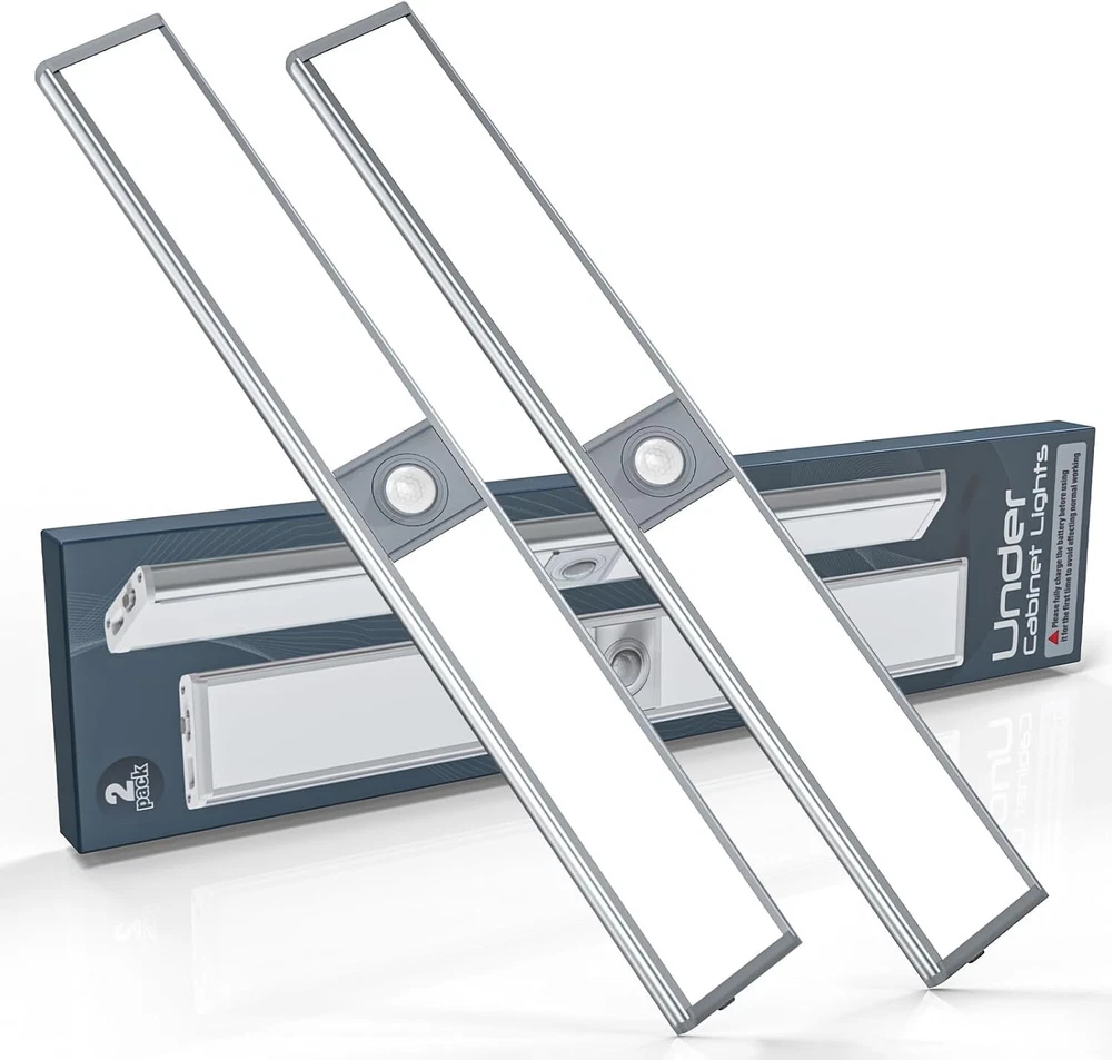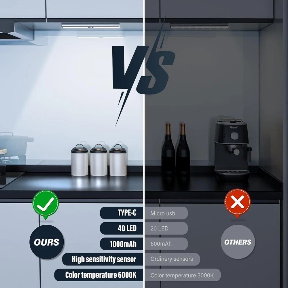 BRAND NEW Soft and Bright Light: With LED lamp beads and a diffuse light design, our 12 inch Cabinet Lights produce softer, brighter, and more uniform light Wide Sensing Range: Our Cabinet Lights feature a high-sensitivity motion sensor that can detect all objects within 10 feet and 120° from the center of the sensor. Any minor movement will immediately turn on the lights, making them convenient and energy-efficient Multiple Sensing Modes: To suit different scenarios, we offer two sensing modes: auto mode, lighting mode Please read the instructions carefully before use to ensure optimal performance. At the same time, we equipped the cabinet lights with the latest type-C charging interface Long-Lasting Battery: Our Cabinet Lights have a large battery capacity that can continuously light up for up to 6 hours on the highest brightness settings. They can also be used for over two months in induction mode, making them ideal for long-term use Non-destructive installation: Our Cabinet Lights can be attached to any steel metal surface. You can also install them anywhere you want using the included metal sheet, without damaging your cabinets or walls