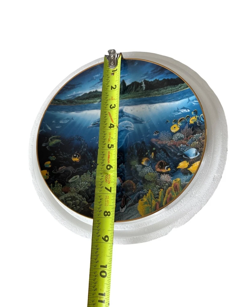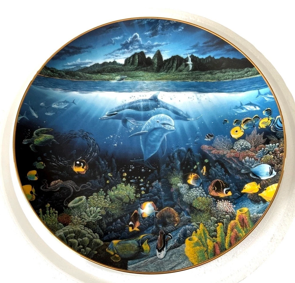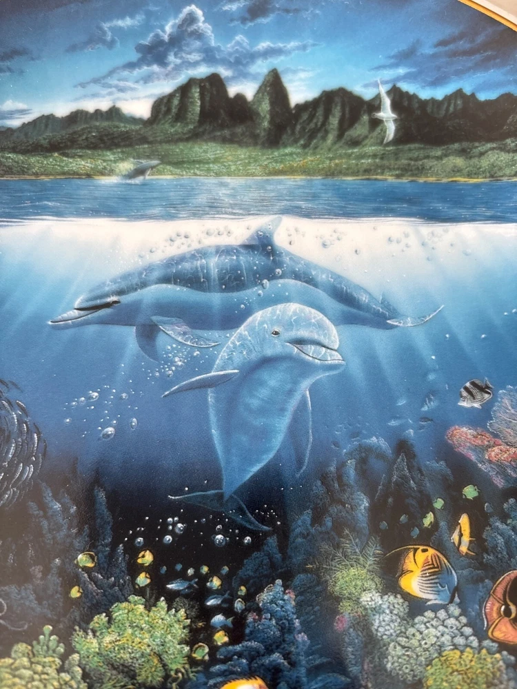 This exquisite porcelain plate features the stunning artwork of Robert Lyn Nelson, capturing the serene beauty of marine life. Part of a limited edition, this collector's piece is a testament to craftsmanship and artistry. It's a timeless addition to any fine art collection. • Diameter: 10.5 inches • Material: 23K gold rim • Limited edition of 75 firings • For decorative use only • Includes certificate of authenticity Condition: Pre-Owned Like New Like new condition with certificates. NO Major damages "Power Selling Mom Consignment"
