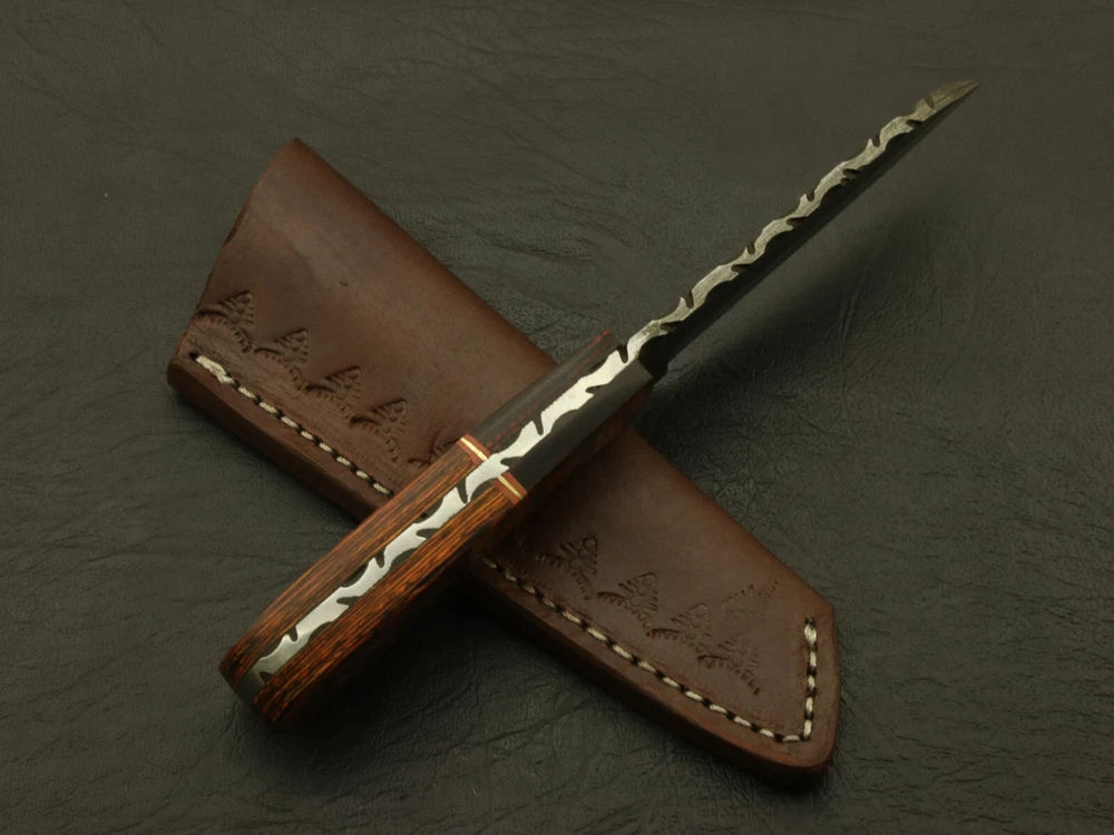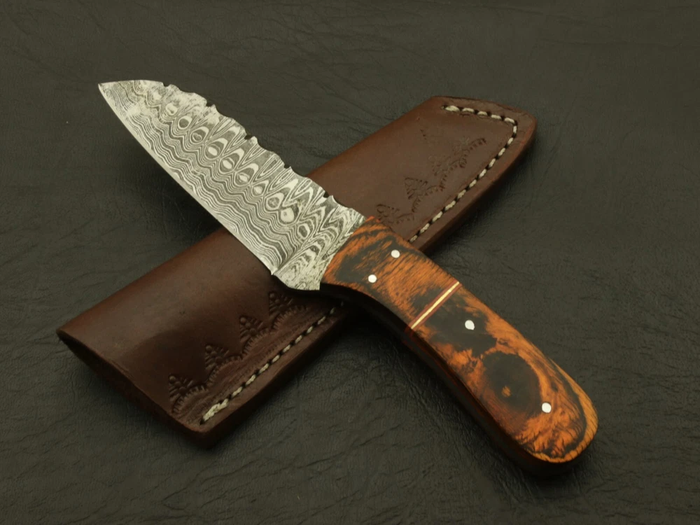 Classy Custom Handmade Classical pattern Damascus Steel Hunting/skinning Knife If you’re looking for a fixed blade knife that will be a reliable companion, look no further! This knife epitomizes the bold. The main qualities that make it great: sturdiness, sharpness, and looks. The ergonomic design is easy to hold and carry with the included leather sheath. Great for survivalists, tactical personnel, outdoors-men or anyone who appreciates fine craftsmanship and an amazing blade. The blade is Damascus steel, Cutting edged, and classical sharp. It's sturdy enough to last through even the harshest conditions. The handle is beautifully polished, with real rose wood & pakka wood . Designed to feel comfortable and natural in the hand. Even in different conditions, you'll feel confident that the knife will stay firmly within your grasp. Included with the knife is a genuine leather It's brand · Overall Length: 7” · Blade Length: 3.5” · Handle Length: 3.5” Handle is made of rose wood & pakka wood Care Instructions: Keep the blade dry after each cleaning. Warning: Take care when removing product from packaging. Keep fingers clear of blades. Store away from children. Complimentary gift messages *Gift wrapping service available for minimal additional fee ADD ONS: *Custom orders for 10 or more pieces. You can choose & submit your own handle or design. LIFETIME WARRANTY No premium knife is complete without a lifetime warranty; our masterpiece knife is fully covered for life, We do sell wholesale, please contact us for special discounts on bulk orders. FEEDBACK POLICY: YOUR FEEDBACK IS VERY IMPORTANT FOR US, IF THEIR IS ANY KIND OF PROBLEM PLEASE GIVE US OPPORTUNITY TO SORT THE ISSUE