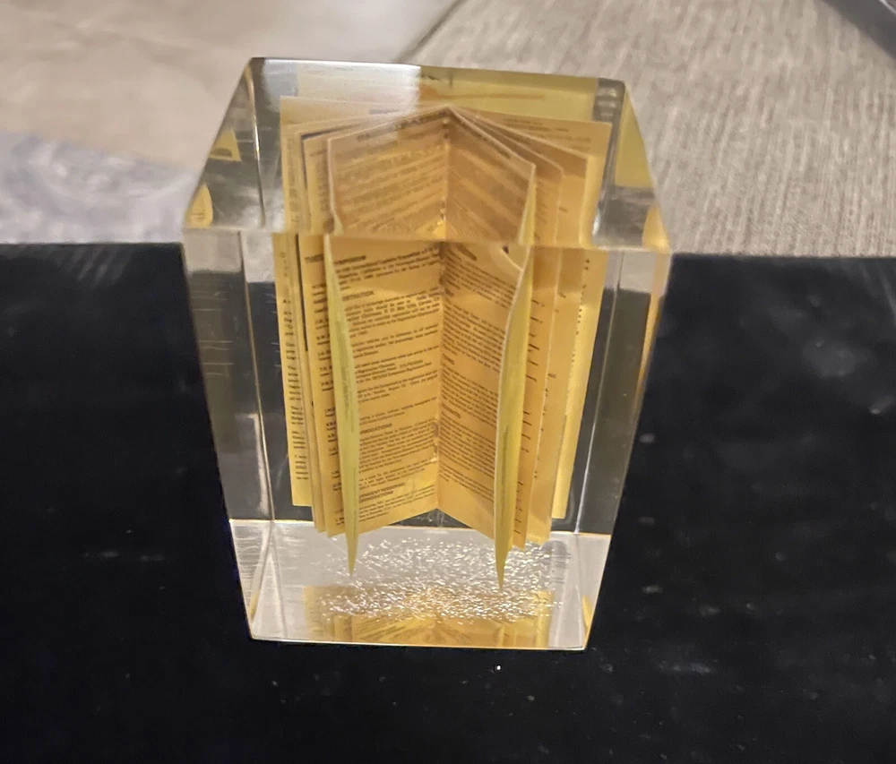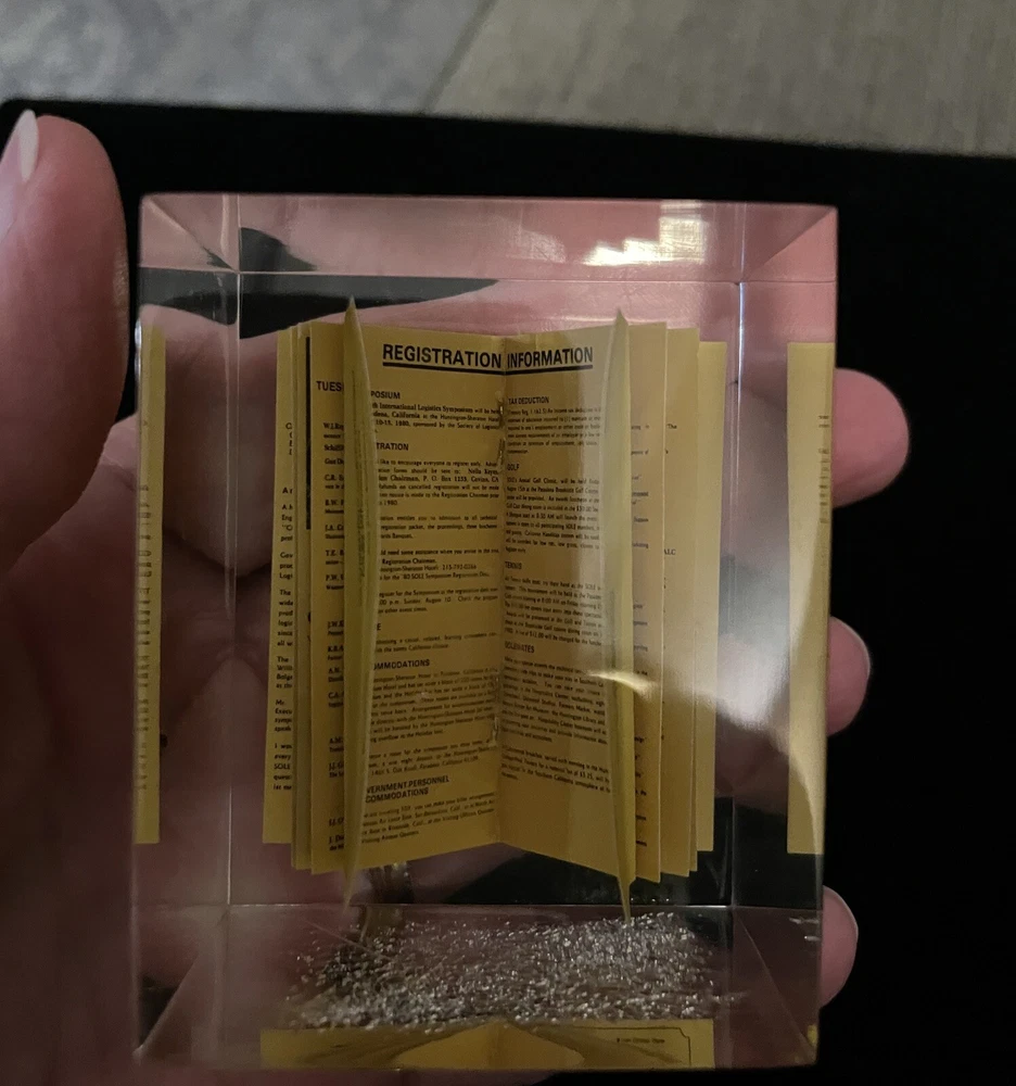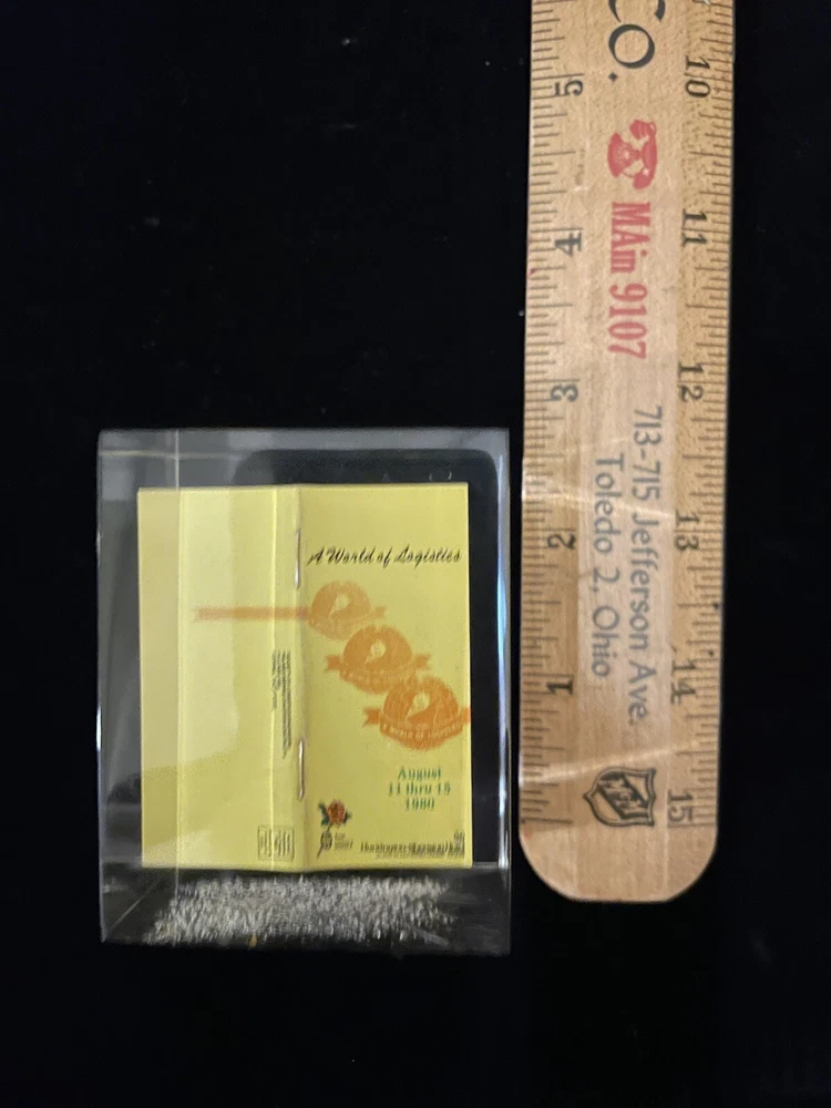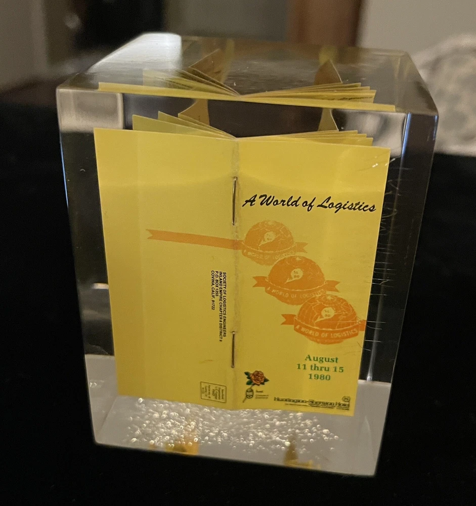 This unique vintage paperweight from 1980 features a miniature of "A World of Logistics" registration form, August 11 - 15, 1980, and is made of high-quality acrylic material. Measuring 2 1/2" x 2", it is a great addition to any collection of decorative collectibles. The paperweight is multicolored and has a unique design that would make it a standout piece in any collection. It is perfect for those interested in collecting odd paperweights. This item would make a great gift for collectors or anyone interested in fun vintage decor.