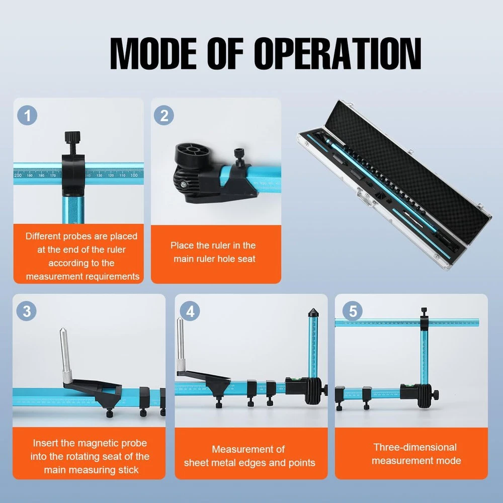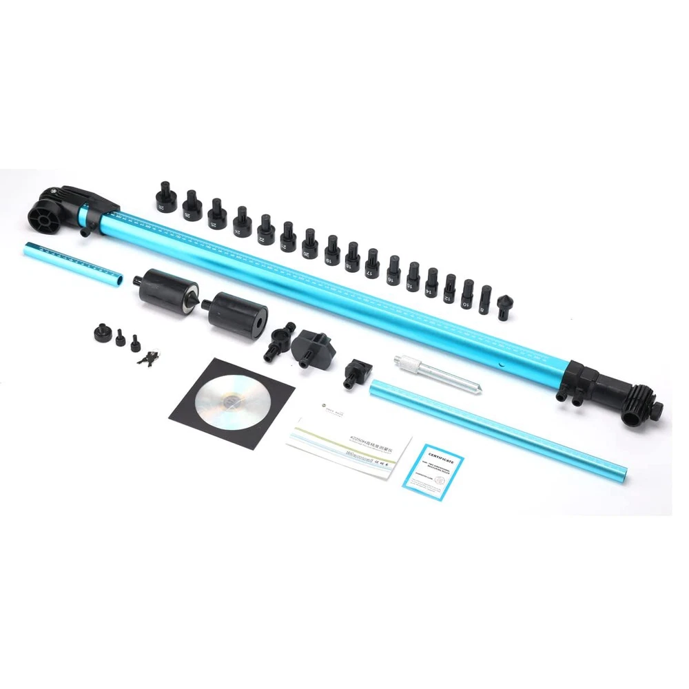 Features: 1. High precision, measurement error is less than 1mm. 2. Aluminum alloy material, high strength, small size, light weight, one person can complete measurement independently. 3. It can also be 3D measuring with the adapter connectors. Specification: Product size (with aluminum box): 102×20×12cm/ 40.15×7.87×4.72" Material: Aluminum alloy Color: Blue-black Measuring range, X axis: 200mm~2250mm/ 7.87-88.6" Y axis: 20mm~150mm (or 340mm)/ 0.8-5.9" OR 13.4" Z axis: 20mm~150mm (or 340mm)/ 0.8-5.9" OR 13.4" Package size: 104×20×10cm/ 41×7.87×3.9" Gross weight: 3.8kg Usage: 1. When measuring small size within 900mm,drawing measuring rule is not required. Use slide rule according to the position of the ranging point. The level (in the level of the level display) shows the measurement,read on the slider. 3. When measuring a size about 1800 mm, the inner rod that is stretched out and stretched is used, and measured according to the level displayed by the level. Read measurements on the slider holder. Pull the ruler smoothly during the measurement (in the level of the level display). 4. The vertical ruler is directly at the measuring point, up and down adjustable, and is screwed to the vertical position to maintain the level (in the level of the level display). Packing List: 1x Main scale 1x 20-150mm scale 1x 20-340mm scale 1x Screw thread probe 1x Magnetic probe 1x Magnetic probe and lengthen base 1x 3D adapter 1x Large positioning probe 1x Longitudinal positioning probe 1x Small positioning probe 1x Size Nut Probe 1x CD, English manual