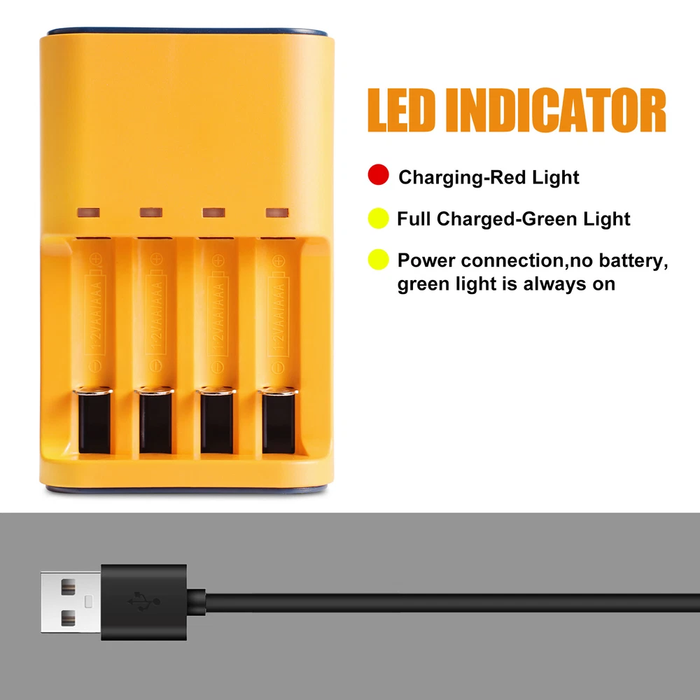 Universal Smart Battery Charger 4-Slot for AA AAA 1.2V Rechargeable Batteries Features: 1. 【Smart Rechargeable AA Battery Charger】 AA AAA battery charger 4 bay for Ni-MH Ni-CD rechargeable batteries can charge any quantity in any slot. Besides, you can also mix charge AA and AAA batteries, as long as they are Ni-MH or Ni-CD batteries. 2.【Safety Protection】 Comes with special charge and discharge management circuit. With multiple security protection settings, battery charger aa can effectively prevent reverse, short circuit, overcharge, over discharge, over-current damage to the battery, which makes users using the product without any safety concern. 3.【LED Indicators Charging Display】 This aa aaa battery charger with Red/Green led light display, And the aa rechargeable battery charger will display the status of each rechargeable battery when you insert a battery to charge, the light will turn solid red, only on the port(s) containing the battery, to indicate the battery is charging. The light turns solid green when charging is complete. 4.【USB AA Battery Charger】 USB Powered Universal Intelligent Battery Charger, allows for on the go worldwide portability.the USB charging line can be connected to USB socket, car charger, computer, phone adapter, other USB output equipment to charge. 5. Note: Products with electrical plugs are designed for use in the US. Outlets and voltage differ internationally and this product may require an adapter or converter for use in your destination. Please check compatibility before purchasing. Specification: 1. LED state the charging statues: Power connection, no battery, Green light is always on. Charging - Red light Full charged- Green light 2. Compatible: Can both charge AA and AAA Ni-MH Ni-Cd rechargeable batteries (Do not charge alkaline or Lithium batteries) 3. Input and Output: Input: DC 5V 1A, Worldwide voltage Output: DC 1.2V 200mA, faster for charging 4. Individual fast-charging,LED indicator light, Easy to use AA/AAA/ Ni-MH Ni-CD rechargeable batteries,Perfect Fit 6. Can charge any number of batteries at the same time, independent charging channels 7. Safety Charging, Offer over-voltage over-current protection, short-circuit protection, over-charge protection, over-heat protection, Good Protection Package Included 1 x USB Smart Battery Charger 4 Bay for AA AAA Battery 1 x USB Cable On Feb 10, 2025 at 01:58:41 PST, seller added the following information: