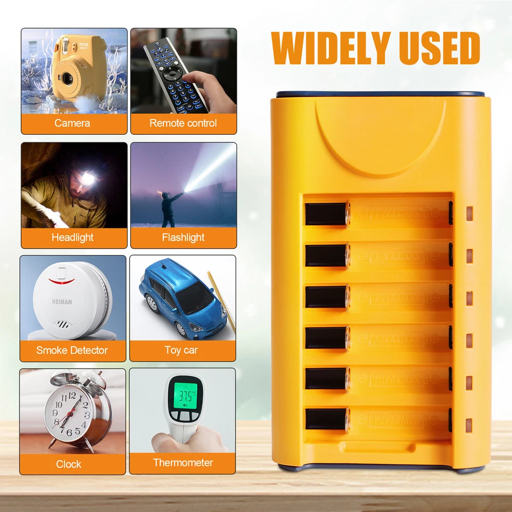 Universal USB Battery Charger 6-Slot Fast Charger for AA Rechargeable Batteries Features: 1. 【Smart Rechargeable AA Battery Charger】 AA AAA battery charger 6 bay for Ni-MH Ni-CD rechargeable batteries can charge any quantity in any slot. Single, double or triple ones can be charged, and not necessary to put them in neighboring slots. Besides, you can also mix charge AA and AAA batteries, as long as they are Ni-MH or Ni-CD batteries. 2.【Safety Protection】 Comes with special charge and discharge management circuit. With multiple security protection settings, battery charger aa can effectively prevent reverse, short circuit, overcharge, over discharge, over-current damage to the battery, which makes users using the product without any safety concern. 3.【LED Indicators Charging Display】 This aa aaa battery charger with Red/Green led light display, And the aa rechargeable battery charger will display the status of each rechargeable battery when you insert a battery to charge, the light will turn solid red, only on the port(s) containing the battery, to indicate the battery is charging. The light turns solid green when charging is complete. 4.【USB AA Battery Charger】 USB Powered Universal Intelligent Battery Charger, allows for on the go worldwide portability.the USB charging line can be connected to USB socket, car charger, computer, phone adapter, other USB output equipment to charge. 5. Note: Products with electrical plugs are designed for use in the US. Outlets and voltage differ internationally and this product may require an adapter or converter for use in your destination. Please check compatibility before purchasing. Specification: 1. LED state the charging statues: Power connection, no battery, Green light is always on. Charging - Red light Full charged- Green light 2. Compatible: Can both charge AA and AAA Ni-MH Ni-Cd rechargeable batteries (Do not charge alkaline or Lithium batteries) 3. Input and Output: Input: DC 5V 1A, Worldwide voltage Output: DC 1.2V 200mA, faster for charging 4. Individual fast-charging,LED indicator light, Easy to use AA/AAA/ Ni-MH Ni-CD rechargeable batteries,Perfect Fit 6. Can charge any number of batteries at the same time, independent charging channels 7. Safety Charging, Offer over-voltage over-current protection, short-circuit protection, over-charge protection, over-heat protection, Good Protection Package Included 1 x Smart Battery Charger 6-Slot 1 x USB Cable On Feb 9, 2025 at 23:44:00 PST, seller added the following information: