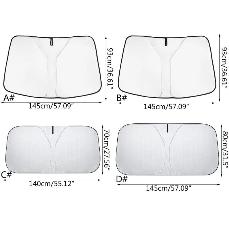 Features: Fits perfectly to most sedans and Size SUVs. Find your vehicle in the size chart. High-quality reflective polyester- material blocks heat & sun. Keeps your vehicle cool and protects against damage caused by hot sunlight. Quick and easy to install, and quick and easy to fold and store away. Reflective aluminum foil combine with bubble material make the cooling effect is more significant. Protect instrument desk, steering wheel and chairs, Specifications: Material:Polyester Type For Car,For SUV Size:Approx.145x93cm/57''x36.6'' ,140x70cm/55.1''x27.5'' (For Car),145x80cm/57''x31.5'' (For SUV) Package Includes: 1x Windshield Sunshade note: Please allow 1mm errors due to manual measurement. Due to the difference between different monitors, the picture may not reflect the actual color of the item.
