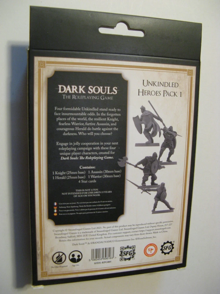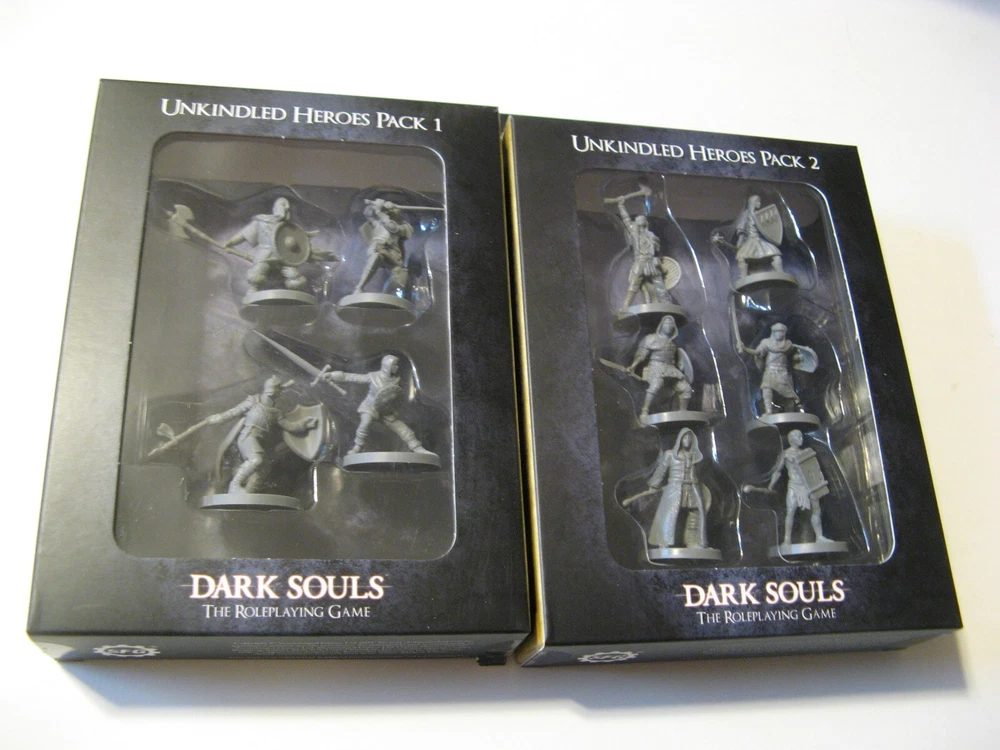Here are Unkindled Heroes Pack 1 (Steamforged Games, SFDS-RPG005) and Unkindled Heroes Pack 2 (SFDS-RPG007) for Dark Souls, The Roleplaying Game. Pack 1 includes 4 figures - knight, herald, assassin, warrior - and 4 stat cards. Pack 2 includes 6 figures - pyromancer, cleric, thief, sorcerer, mercenary, deprived - and 6 stat cards. Both are brand new and sealed. Shipping cost will be determined by the shipping calculator . Thanks for looking!