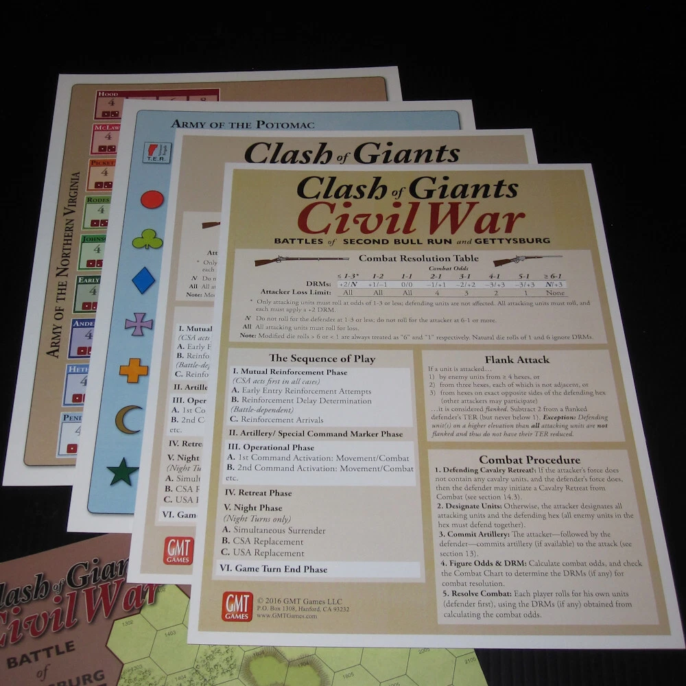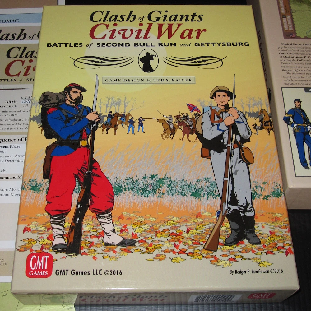 Unpunched GMT Games ***CLASH OF GIANTS: CIVIL WAR*** 2016 Battle of Gettysburg Second Bull Run Wargame 1603 Complete with all game components in excellent (near mint) condition. Box is in excellent condition. Includes: box double sided game map 4x charts/player aid cards 2x unpunched counter sheets 2x d6 dice storage bags 2x rules booklets Free USPS ground advantage shipping in the USA; thanks for looking!