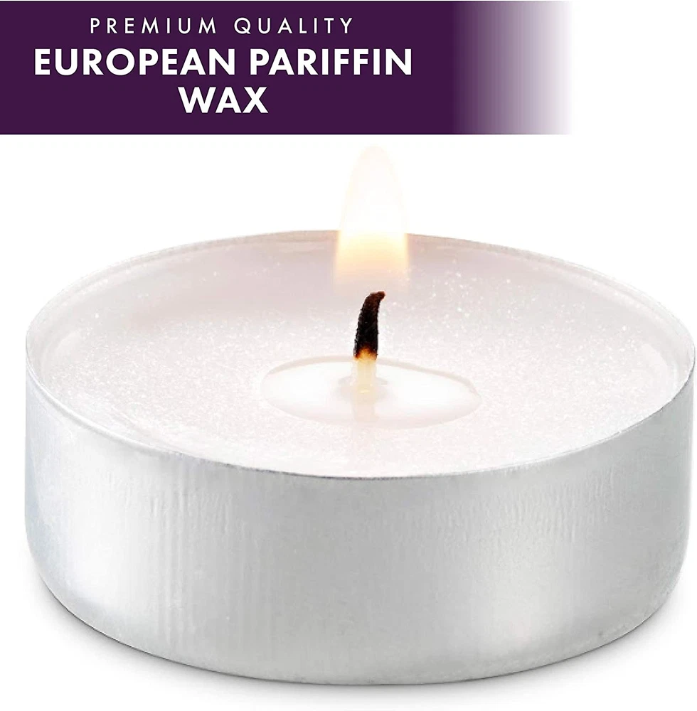 · HANDY PREMIUM TEA LIGHTS CANDLES IN BULK: The 1,000 tea candles are compact yet generous in size (1.5” in diameter & 0.65” in height). These tealight candles are not only pretty & useful, they’re also very economical – perfect for big events like weddings! · EXTRA LONG-LASTING BURN TIME: Our tealights ensure a long-lasting burn for up to 4 continuous hours. The romantic candles’ 100% cotton wicks improve the burning process; you’ll enjoy a smokeless flame that flickers less than others. · PERFECT FOR ROMANTIC NIGHTS: Explore the useful nature of our tea lights! They’re great for Valentine’s day, weddings, anniversaries, home décor, Christmas holidays, pool parties, DIY crafts, church, emergency, survival & candles. · SUPERIOR QUALITY EUROPEAN WAX: These mini candles are made of superior, non-flaky pressed paraffin wax from Europe and come in durable aluminum tins that keep the dripless wax contained, protecting your nice furniture from stains. · A COZY AND WELCOMING AMBIANCE: Upgrade your home décor with our tea lights, featuring a flame that gives off the perfect amount of light – for romantic dinners indoors or outdoors, bedroom, bathroom, guest rooms, traveling & more. Product Description