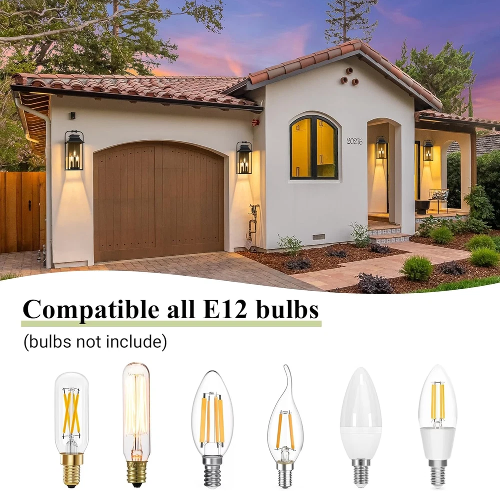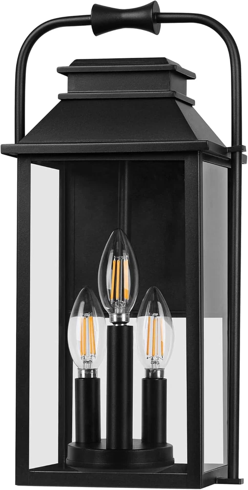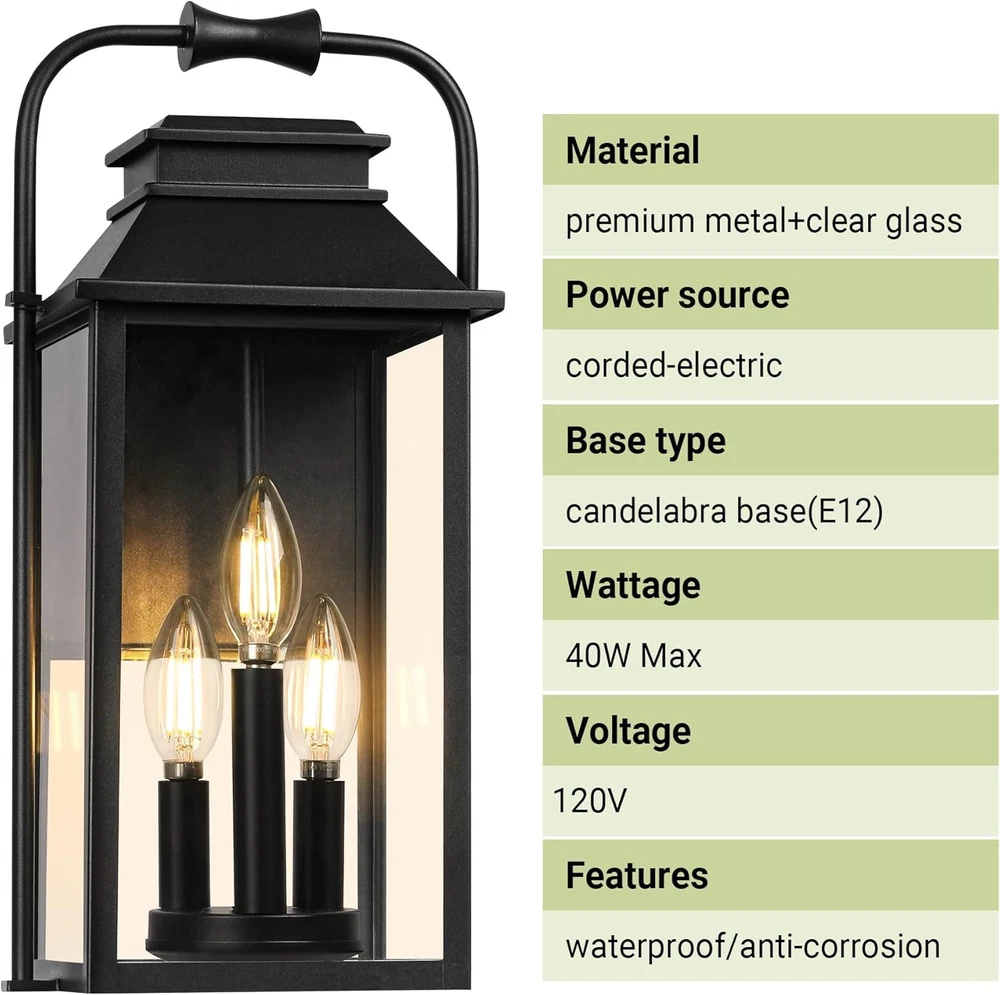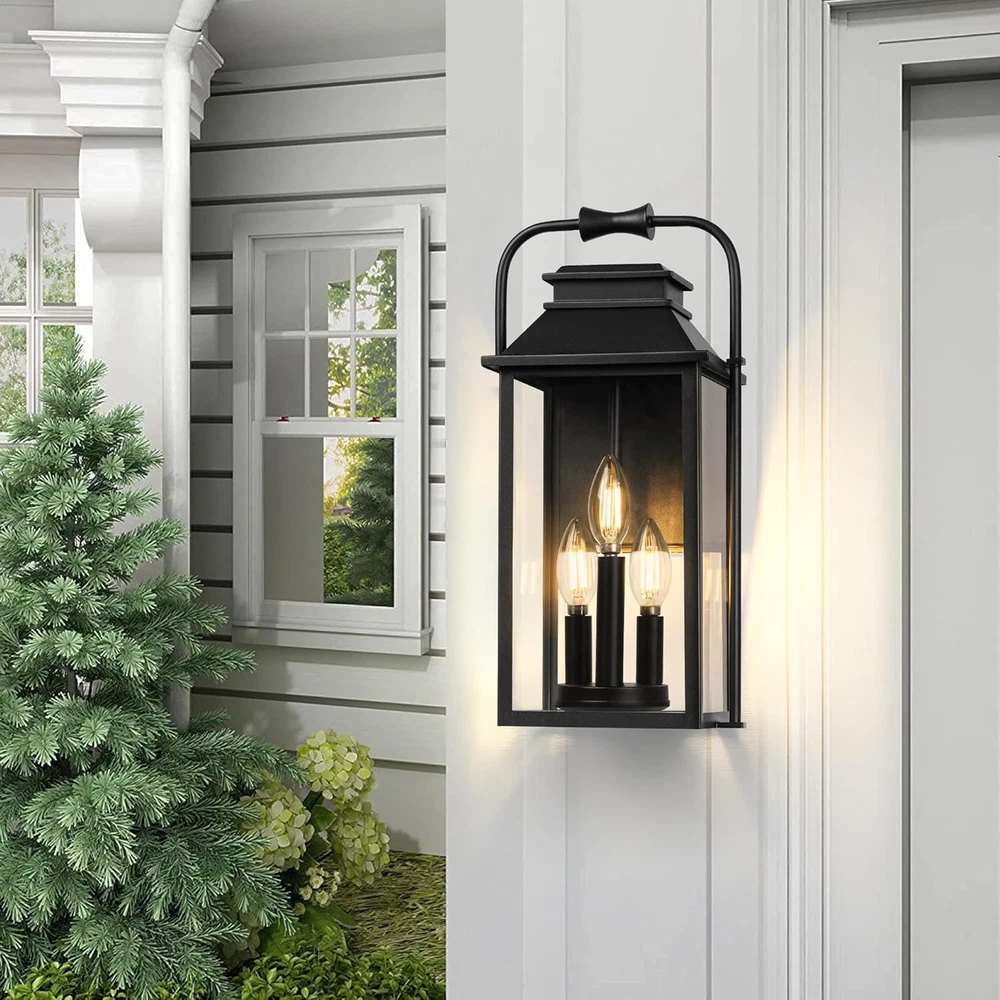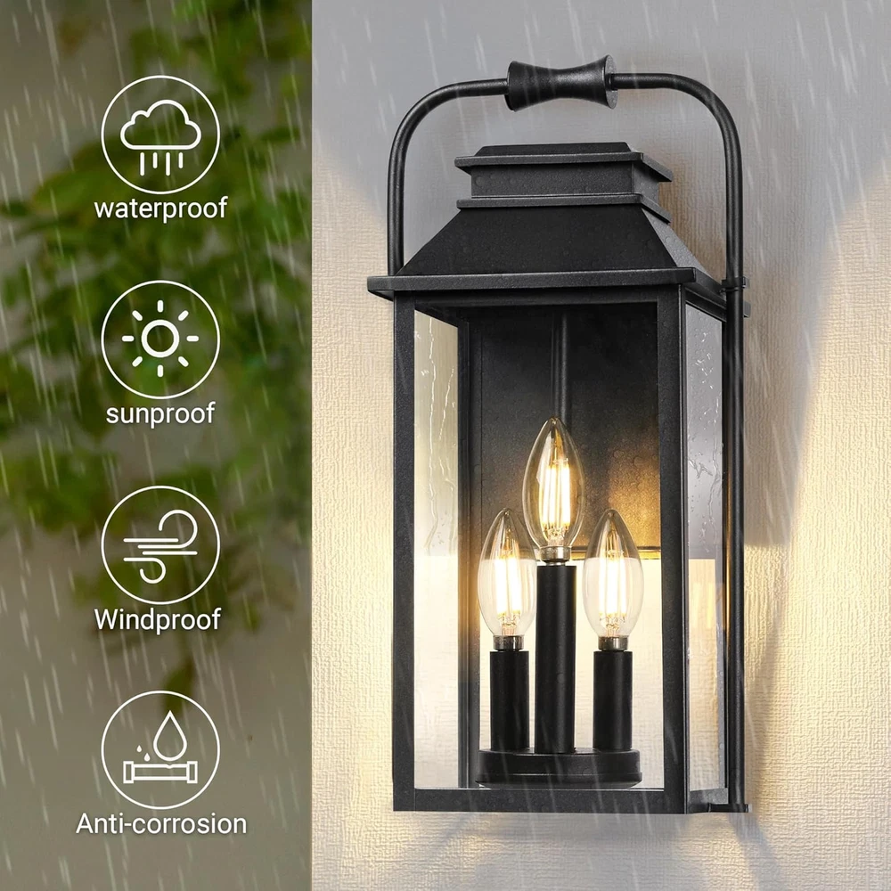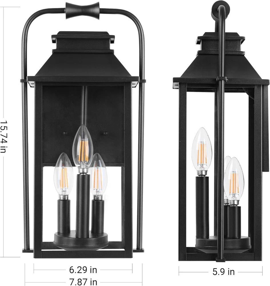 Classic Creative Aesthetic Design: The main color of this wall lamp is black. The exterior lighting fixture is crafted from metal in a tall and rectangular silhouette featuring a tapered top and unique curved top handle design. The porch light uses three lights to illuminate through the glass. Front porch lantern has a simple and versatile appearance and is suitable for farmhouses, gardens, and outdoor decoration. It's open at the side for easy light cleaning and bulb replacement, shining the road to welcome you back home! Large Size & E12 Bulb Compatibility: The height of the outdoor wall lamp is 15.8 feet, and the large-size wall lamp meets the lighting needs of a large space. The black wall sconce does not include a bulb, the wall sconce base is compatible with all E12 bulbs (up to 40W) including LED, CFL, incandescent, dimmable bulbs, and more. All Weather-resistant Durability: The external metal structure ensures that the sconce wall lighting is waterproof and corrosion-resistant. The porch light work normally on rainy days, snowy days, or typhoons. Outdoor patio lighting suits various outdoor environments, including gardens, corridors, terraces, and parking lots. As a multifunctional wall light, it can decorate your outdoors or serve as a welcome light to welcome you home! Effortless Installation & Muti-Aspects Charm: The included mounting parts allow for easy installation of exterior luminaires, whether decorating a terrace or entrance, and the black exterior adds elegance to your house. Elevate your outside ambiance with this stylish and functional lighting masterpiece. Product Description Large Outdoor Wall Lantern 3-Light Classic pioneer aesthetics design, finished with a solid matte black frame and clear glass, the outside wall lamp gives a simple yet classy look. These contemporary wall lanterns with minimalist designs can essentially go with any decor. A new traditional contemporary look with cast aluminum construction ensures durability, our outdoor wall light fixture featuring with waterproof and anti-corrosion, all Weather-resistant and durability. Modern exterior wall light is an excellent addition to any indoor or outdoor space. It is perfect for installing in garages, porches, patios, and any other indoor or outdoor areas. 1 1 Exterior Wall Light 2 2 Large Porch Light 3 3 Details of Fixture