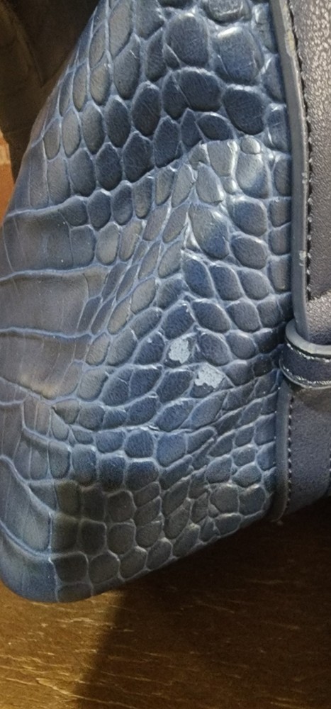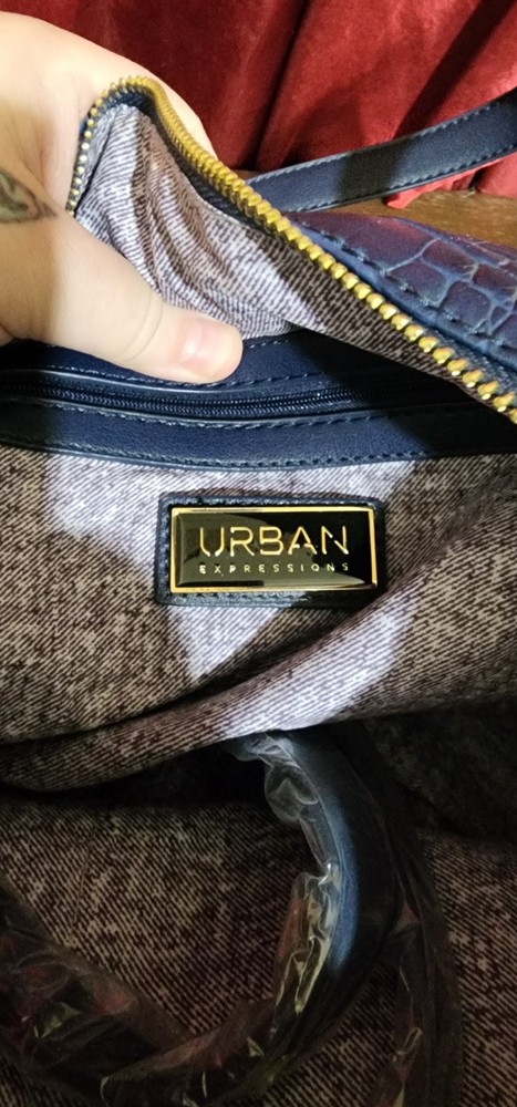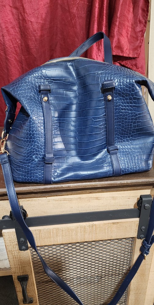 This Urban Expressions tote purse is designed for women in a stylish blue color. It features a crocodile texture and is made from vegan materials. This spacious handbag offers plenty of room for everyday essentials and is in excellent used condition.