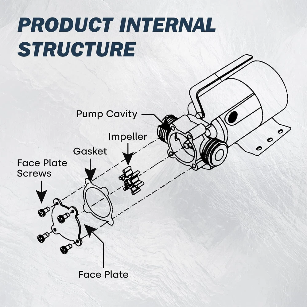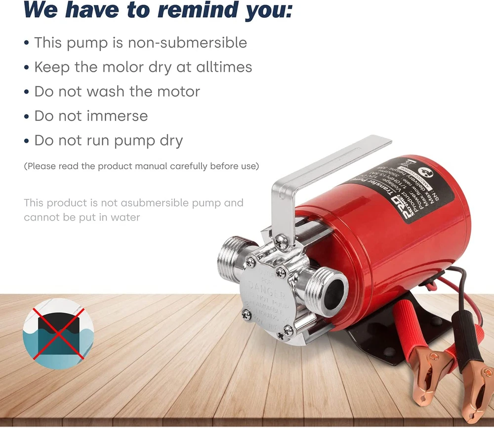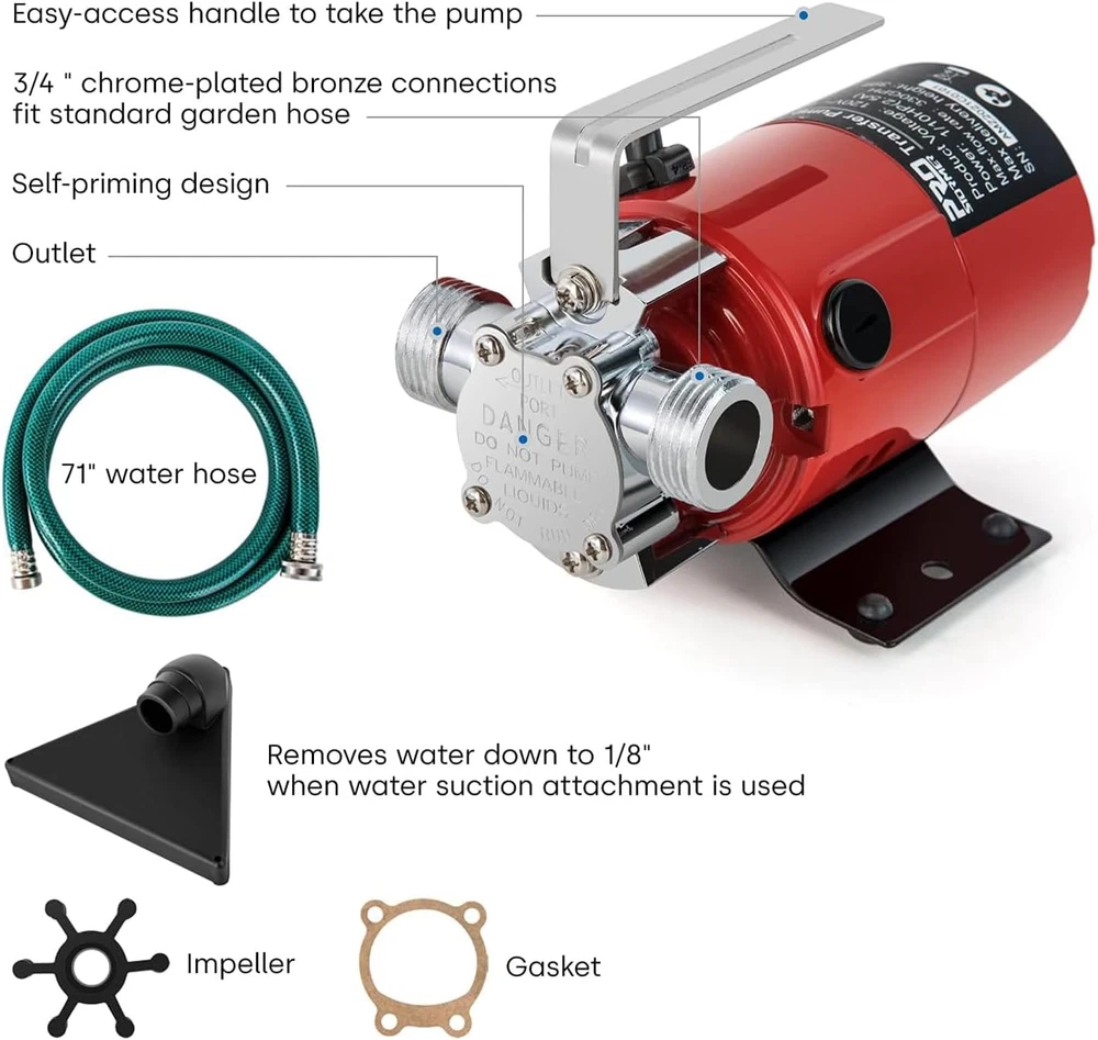 PROSTORMER 1/10HP DC Utility Pump Water Transfer Pump Kindly Tip 1: Please read and understand the entire manual before attempting to assemble,operate or install the product Kindly Tip 2: This pump is non-sumbersible. Keep the motor dry at all times. Do not wash the motor. Do not immerse 0.1HP Power: This Utility Pump has 0.1HP power, and it is up to 350 gallons per hour, and its maximum lift up to 35 feet DC Transfer Pump: Red color wire to positive (+) battery terminal;Black color wire to negative (-) battery terminal Easy to Carry and Use: This pump is small and has a handle, which is very easy to carry, so can be used in a small space Good Drainage Effect: Suitable for Pool, Pond, Garden, Flooded Cellar, Aquarium, Irrigation and other places Product Package: 1 x PROSTORMER Utility Pump; 1 x 71'' Water Hose; 1 x Water Suction Attachment; 1 x Impeller; 1 x Gasket Product Description The Prostormer Utility Pump is a 1/10HP DC multi-purpose water transfer pump, it can transfer up to 350 Gallons per hour. So it is ideal for everyday household water transfer requirements. And it comes with 1.8m water hose. WARM TIPS:Before running the pump, please fill small amount of water to the water pipe at inlet end to prevent the water transfer pump idling. Handle Design Equipped with a handle for easy transport, and the weight this pump is light, easy to carry. Standard Connectors It is the 3/4 " chrome-plated bronze connectionsfit standard garden hose. Please be careful not to interchange the water outlet with the water inlet. Water Hose & Suction Attachment It comes with a 71'' water hose and a suction attachment, which can removes water down to 1/8". You need to prepare another water hose with a matching interface to absorb water. Other Accessories The water transfer pump also has 1 impeller and 1 Gasket.