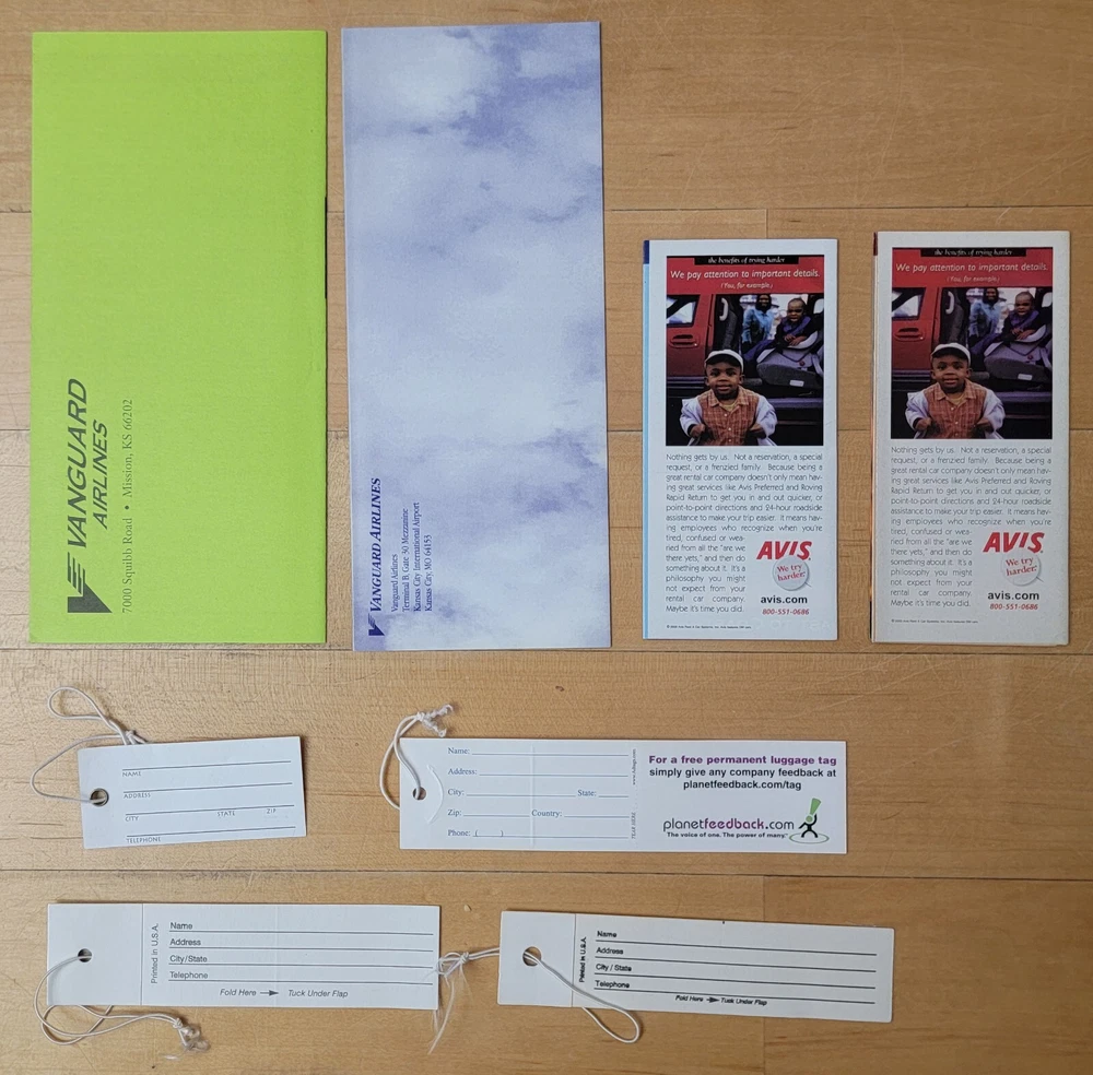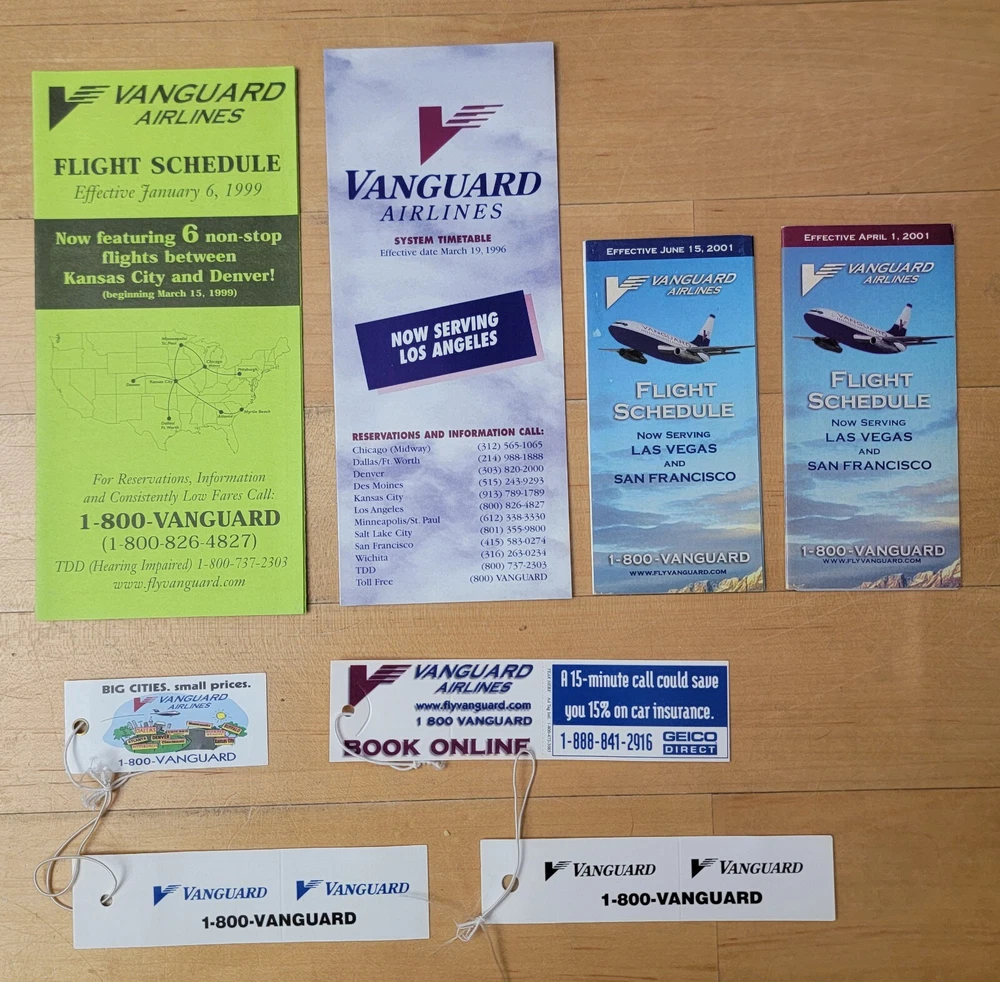 VANGUARD AIRLINES MEMORABILIA LOT 8 ITEMS USED - Very good condition. Some wear from storage . System Timetable - 6 January 1999 System Tiemtable - 19 March 1996 Pocket System Tiemtable - 15 Jne 2001 Pocket System Timetable - 1 April 2001 Baggage Name Tag - Undated Baggage Name Tag - Undated Baggage Name Tag - Undated Baggage Name Tag - Undated I will combine shipping for customers. Prefer Paypal from International customers. International Customers if you do not want sturdy padding, the shipping can be cheaper with International First Class Mail. Please inquire or send email when bidding. If the purchase is made wait for invice with updated shipping. Any damage to item enroute without the padding is responsibility of the buyer. PLEASE, WAIT FOR ME TO INVOICE ESPECIALLY WHEN PURCHASING MORE THAN ONE ITEM AND I WILL COMBINE YOUR AUCTIONS TO SAVE SHIPPING. INTERNATIONAL CUSTOMERS - I CAN SHIP IN LETTER ENVELOPE, BUT WILL NOT HAVE ANY TRACKING NUMBER. IF YOU WANT SHIPPED FIRST CLASS LETTER PLEASE LET ME KNOW SO I CAN INVOICE TO SAVE ON POSTAGE BEFORE PAYING. NOTICE: ITEMS SHIPPED PRIORITY MAIL TO HAWAII, ALAKSA, AND PUERTO RICO MAY INCURE ADDITIONAL CHARGES INTERNATIONAL SHIPPING: Due to the dramatic increase in International shipping charges, I will continue to ship International but please be aware if I have to put something in envelope to keep from bending the higher charges will apply. I will try to keep international shipping as reasonable as possible. If you do not want padding to keep from damage please email me and international charges will be recalculated.