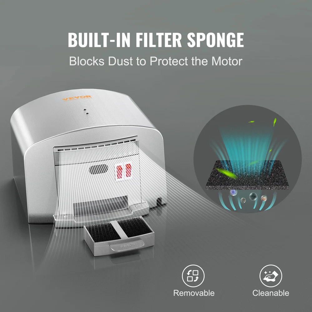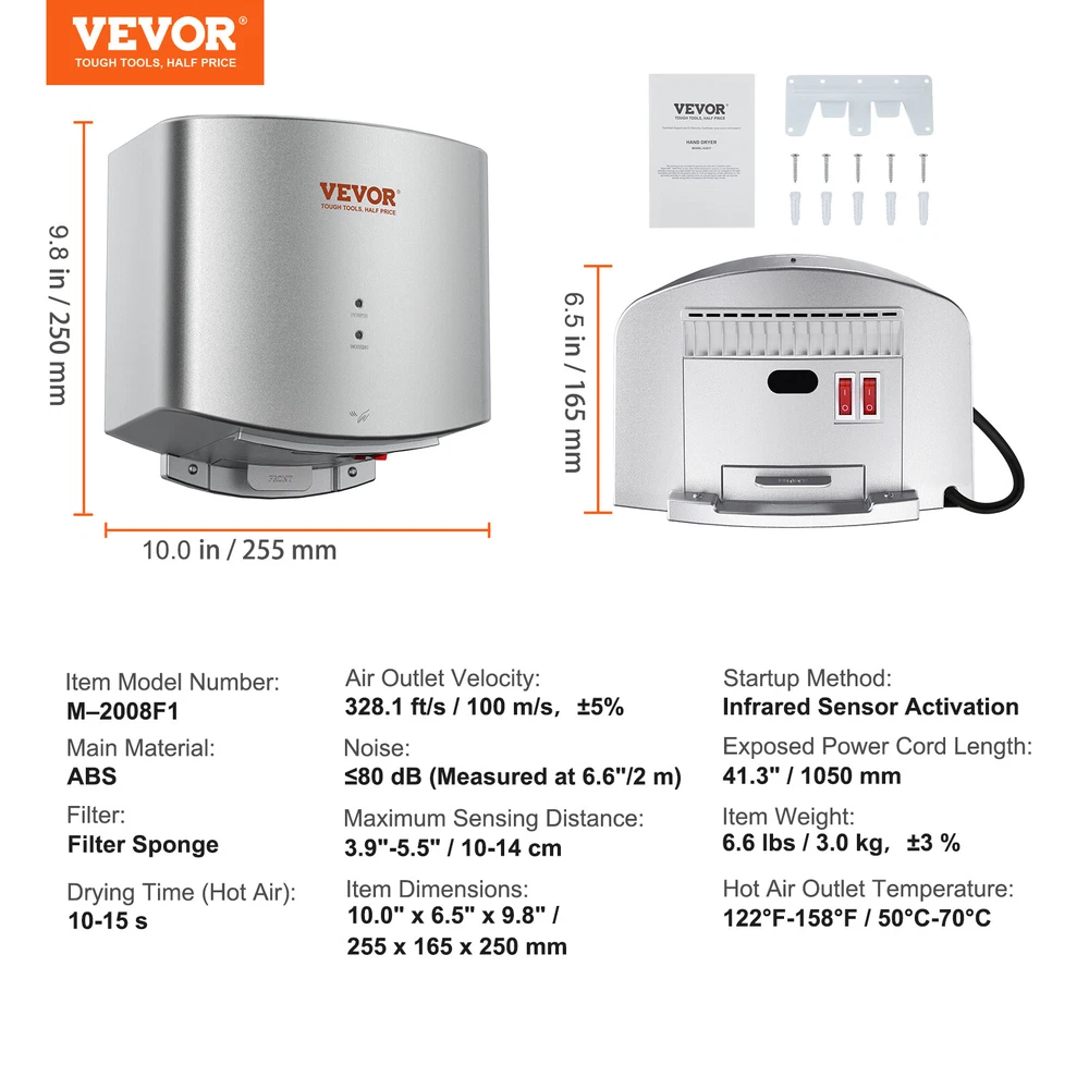 Document Product Description User-Friendly and Clean Hand Drying The wall-mounted ABS hand dryer offers an efficient and environmentally friendly hand drying solution for your bathroom or commercial kitchen, reducing paper usage. With a sensing range of 3.9"-5.5" / 10-14 cm, it ensures cleanliness and convenience. The smooth ABS material is fingerprint-resistant and easy to clean, making it suitable for use in large family bathrooms and kitchens. It helps reduce paper waste and promotes eco-friendliness. You can switch to warm air on the side of the dryer, completing hand drying in just 7-10 seconds, eliminating the need for long waits. The warm air temperature ranges from 122°F-158°F / 50°C-70°C, providing a comfortable and cozy feeling for your hands. The wall-mounted ABS hand dryer features a fully automatic infrared sensor. Simply hold your hands within 3.9"-5.5" / 10-14 cm, and it will quickly activate, making it user-friendly for people of all ages. The ABS hand dryer includes a removable filter that filters out dust and pet hair from the air, ensuring clean airflow. If you notice reduced airflow, simply clean the filter 1-2 times to maintain optimal performance. Features & Details ABS Wall-Mounted Hand Dryer:This wall-mounted hand dryer is crafted from durable ABS material, boasting a sleek and fingerprint-resistant design. It is corrosion-resistant and can withstand daily wear and tear, making it an excellent choice for both home and commercial bathrooms and kitchens. Efficient and Quick Hand Drying:Dries hands in 10-15 seconds with powerful 28,000 RPM motor and high-speed airflow. Switch between hot and cold air with a button for comfortable drying at 122°F-158°F / 50°C-70°C. Quiet operation (≤80 dB at 6.6" / 2 m) doesn't disrupt conversations. Fully Automatic Infrared Sensing:This ABS hand dryer features an automatic infrared sensing system that is quick and responsive, effectively preventing cross-contamination from bacteria. It has a sensing range of 3.9"-5.5" / 10-14 cm, activating when hands are extended and stopping when hands are removed, eliminating intermittent airflow. Removable Filter:The built-in filter in this ABS hand dryer helps filter out dust from the humid bathroom air, delivering clean air to your hands and reducing wear on the internal motor, thus protecting it. If you notice reduced airflow, simply remove the filter and shake off the dust, with no need for washing. Easy Installation:This wall-mounted ABS hand dryer supports direct plug-in installation and can be easily mounted on ceramic or concrete walls using the included hooks, screws, and expansion anchors. SHIPPING ABOUT US PAYMENT RETURNS CONTACT WARRANTY Welcome to our eBay store. As a leading and emerging company in manufacturer and exporting business, we are specialized in Business and Industrial Products, Sporting Goods, Pet Products, Home and Garden products for more than 10 years. We believe that it is our vision and mission to provide innovative products with best service and competitive price to satisfy you. Our goal is to make sure that you can find exactly what you are looking for and make it easy for you to place your orders. We accept PayPal payment,PayPal Credit,Credit card or debit card and so on. Payment should be completed within 4 (Four) days of auction closing. Or unpaid dispute will be filed for closing auction. We will leave a positive feedback immediately after payment is received. We appreciate a positive feedback as much as you do. If for some reason there is any issue with the purchase, please contact us prior to leaving feedback, we will be glad to work together and provide a satisfying solution. Please be aware that PO Box cannot receive items, please DO NOT fill in the PO Box address. DELIVERY DAYS: 3-7 BUSINESS DAYS 3 BUSINESS DAYS SHIPPING OUT SHIP FROM CA & TX & NJ & GA & NC &OR WAREHOUSE California Warehouse: City of Industry, CA Texas Warehouse : Houston, TX New Jersey Warehouse : Perth Amboy, NJ New York State Warehouse: Perth Amboy, NJ Georgia Warehouse: Austell,GA North Carolina Warehouse: Grove NC Oregon Warehouse: AIRPORT WAY Portland,OR All of our items are backed with a 30-day return policy. We ensure all our items are new and in excellent condition prior to shipping. In case you receive the item that is not to the standards above, please contact us via e-Bay messages. All returns must be in new original condition as received and should be shipped with delivery confirmation Please note that all returns must be pre-approved by us. Unauthorized returns will not be accepted. If you need to return, please check twice to confirm the item not work and contact our customer service representative, let us know the detailed problem and send us some pictures for confirmation. We ONLY accept returns with original package. Please make sure that item has NO man-made sabotage. Used items will not be accepted for return. Email Customer Support: 9:00am-2:00am PST Sunday-Friday All emails will be responded to within 12-24 hours This item comes with 12 months Warranty from the date of customers purchased it. Special circumstances will be listed clearly in the listing. If your item has been damaged in transit or become faulty in warranty period, please email us with pictures or video to show the problem. Please do check everything carefully after you received the parcel, any the damage except DOA (Dead-On-Arrival) would not be covered if it's your fault. Replacement products are provided with the same warranty as the returned products. VEVOR is a leading brand that specializes in equipment and tools. Along with thousands of motivated employees, VEVOR is dedicated to providing our customers with tough equipment & tools at incredibly low prices. Today, VEVOR's products are sold in more than 200 countries and regions with 10 million plus members worldwide. User-Friendly and Clean Hand Drying The wall-mounted ABS hand dryer offers an efficient and environmentally friendly hand 