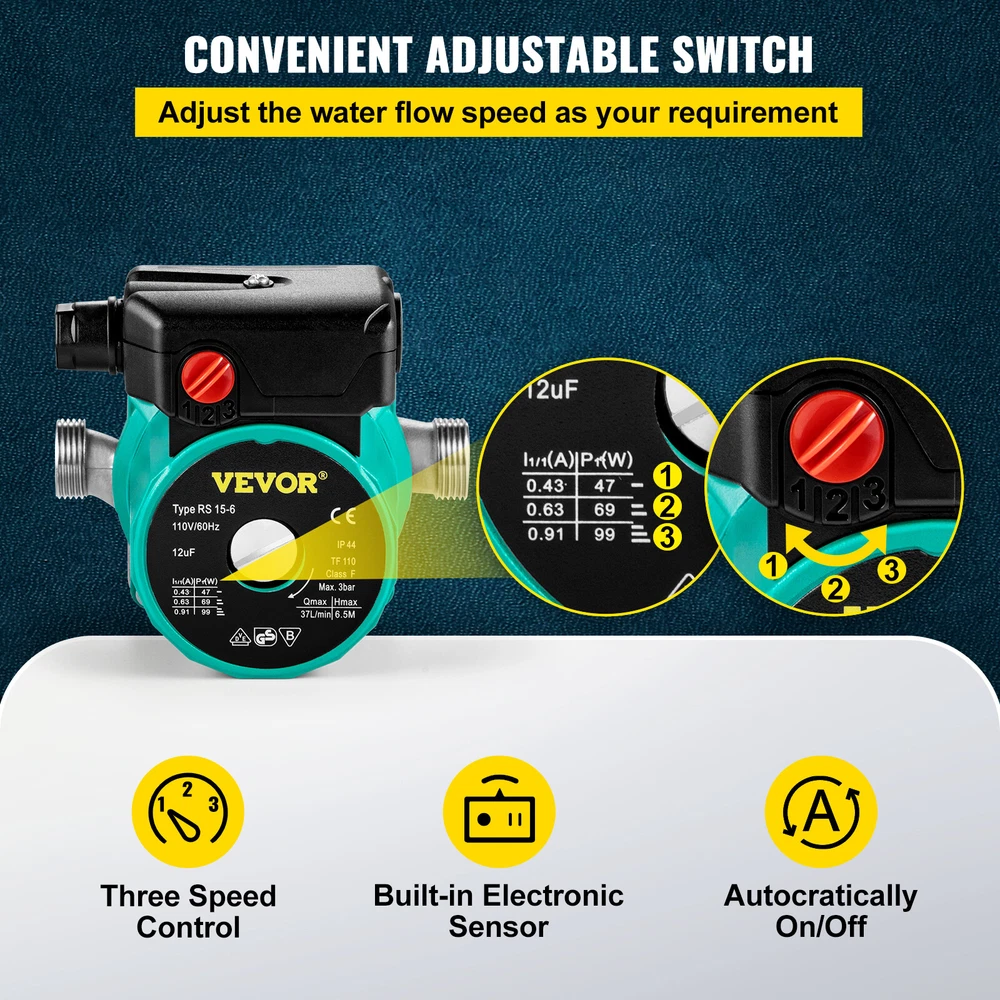 Document Product Description 93W Recirculating Pump Brass Fittings & 3-Speed Control & Auto-start This water circulator pump is made of a premium stainless steel pump head and aluminum pump housing, features high power efficiency, low energy consumption, ample water flow, low noise running, and easy installation. Convenient for daily use, perfect for family water heating systems, such as remote villas, cabins, etc. Note: Never let water outlet facing downward, or the valve will be plugged up. Stainless Steel Material Adjustable Speed Switch Large Flow & Quiet Running Easy Installation Tough Equipment & Tools, Pay Less VEVOR is a leading brand that specializes in equipment and tools. Along with thousands of motivated employees, VEVOR is dedicated to providing our customers with tough equipment & tools at incredibly low prices. Today, VEVOR's products are sold in more than 200 countries and regions with 10 million plus members worldwide. Why Choose VEVOR? Premium Tough Quality Incredibly Low Prices Fast & Secure Delivery 30-Day Free Returns 24/7 Attentive Service Key Features Heavy-duty Material Our recirculating pump is made of stainless steel head, aluminum housing, and PES impeller and is also equipped with brass fittings and a water stop. As a result, rust-proof, waterproof, corrosion-proof, and leakages-proof can last for years. Boost Water Flow Powerful flow with 5.28/7.66/9.5 GPM and the highest head lift can reach 13/16/20 ft. The maximum pressure of this water circulator pump is 10 Bar(145Psi). High efficient and large flow but low energy consumption. Three-speed Control The circulator pump features a speed switch. Power ranges from 46W to 93W. More convenient efficient to use the pump. Quiet Operation This circulating pump for hot water boasts a powerful motor for stable performance and low noise. The average noise level is only 25dB, enabling you to enjoy the pump without disturbing your life. Effortless to Install The recirculating hot water pump is easy to install on appliances and industrial electric or gas water equipment. However, you need to keep the pump shaft horizontally after installation. Various Application The recirculating pump for water heater is a convenient water pressure boosting pump used in the water heating system, such as solar water heater, electric water heater, domestic water pipelines, etc. Specifications Model: VV-BXG-RS15 6SB Power: 93/67/46W Voltage: 110V/60HZ Body Color: Green/Silver Pump Head: Stainless Steel Pump Housing: Aluminum Impeller Material: PES Shaft Material: Ceramic Bearing Material: Carbon Noise Level: 25dB Inlet/Outlet Dia.: NPT 3/4" /1.9 cm Max. Flow Rate: 10.5/7.4/5.3 Gpm(40/28/20 L/min) Max. Head Lift: 20/16.5/10ft (6/5/3 m) Rated Pressure: 0.6 Bar / 8.7 Psi Max. Pressure: 10 Bar/ 145 Psi Cable Length: 4 ft / 1.25 m Liquid temperature:32~212℉/0~100℃ Ambient temperature: 32~104℉/0~40℃ Mounting Position: Shaft Horizontal Protection Level: IP44 Insulation Class: F Product Size: 5.1x4.6x4.7 in / 13x11.7x12 cm Package Content 1 x Recirculating Pump 2 x Brass Fittings 2 x Rubber Gaskets 1 x Water-stop(3.28ft) 1 x Instruction Manual Features & Details Stainless Steel Material: Our recirculating pump is constructed with a heavy-duty stainless steel pump head, aluminum pump housing, and PES impeller, rust-proof, waterproof. Brass fittings and water-stop will come with the pump for corrosion-proof and leakage-proof. Note: Brass adapter diameter 3/4 NPT to 1/2NPT. Large Flow & Quiet Running: Powerful circulator pump has max. 40 L/min water flow, max. 10 bar pressure and max. 20 ft head lift. In addition, super silent running property(about 25dB) can provide you with a quiet pump: high performance but low noise. Adjustable Speed Switch: This water circulator pump features a three-power control switch in 46/67/93W. It is convenient for you to adjust the flow rate as your different requirements. Easy Installation: Our circulating pump for hot water can be used directly to drinking water pipelines with a wrench, fitting with an NPT 3/4" inlet/outlet hose. The water taste of lubricating oil will disappear after 3 to 5 times of use. The shaft of the pump should be kept horizontal after installation. Wide Application: The recirculating hot water pump is suitable for many applications, such as city buildings, suburban villas, houses, water and pressurized with industrial equipment, air conditioning, boilers, solar circulating system, water heater system and so on. People Who Bought This Item Also Bought VEVOR Sand Filter Above Ground with 3/4HP Pool Pump 3000GPH Flow 14" 6-Way Valve VEVOR Swimming Pool Pump 2 HP Filter Pump 90 GPM w/Strainer Above Ground VEVOR Deep Well Pump 4" 1.5HP Submersible Pump Max 390' Head w/ 131 ft Cable VEVOR 12V Water Pressure Diaphragm Pump Self-Priming Pump 55 PSI 3.5 GPM Boat RV VEVOR 1.5HP Swimming Pool Pump Motor w/Strainer Generic Above Ground 1100W VEVOR Hot Water Circulation Pump Circulator Pump 120W 110V NPT3/4" Automatically VEVOR 12V Water Pressure Diaphragm Pump Self-Priming Pump 70 PSI 5.5 GPM Boat RV VEVOR Swimming Pool Pump 2HP 2-Speed Filter Pump w/Strainer for Above Ground VEVOR Swimming Pool Pump 1.5 HP 88 GPM w/ Strainer Filter Pump In/Above Ground VEVOR 1/2HP 4" Deep Well Pump Submersible Stainless Steel 164FT 25.5GPM 110V VEVOR Swimming Pool Pump 1-1.5HP 2-Speed w/Strainer Filter Pump Above Ground VEVOR NPT 3/4" Hot Water Circulation Pump 93/67/46W Domestic Recirculating Pump VEVOR 110V Water Pressure Diaphragm Pump Self-Priming Pump 45 PSI 3.3GPM Boat RV VEVOR Shallow Well Jet Pump 0.75 HP 18.5 GPM w/Pressure Switch Stainless Steel VEVOR 1HP 4” Deep Well Pump 37GPM Submersible Pump 207ft Stainless Steel 230V SHIPPING ABOUT US PAYMENT RETURNS CONTACT WARRANTY Welcome to our eBay store. As a leading and emerging company in manufacturer and exporting business, we are specialized in Business and Industrial Products, Sporting Goods, Pet Products, Home and Garden products for more than 10 years. W