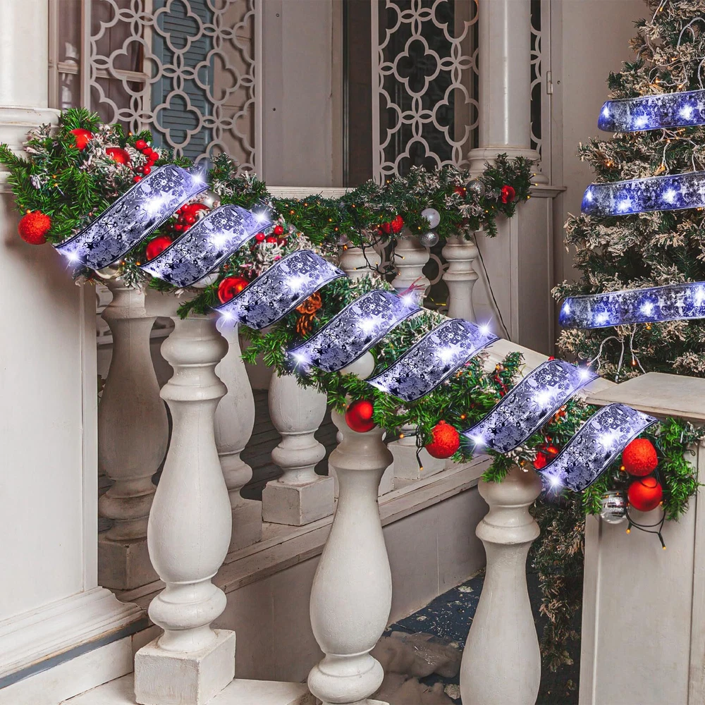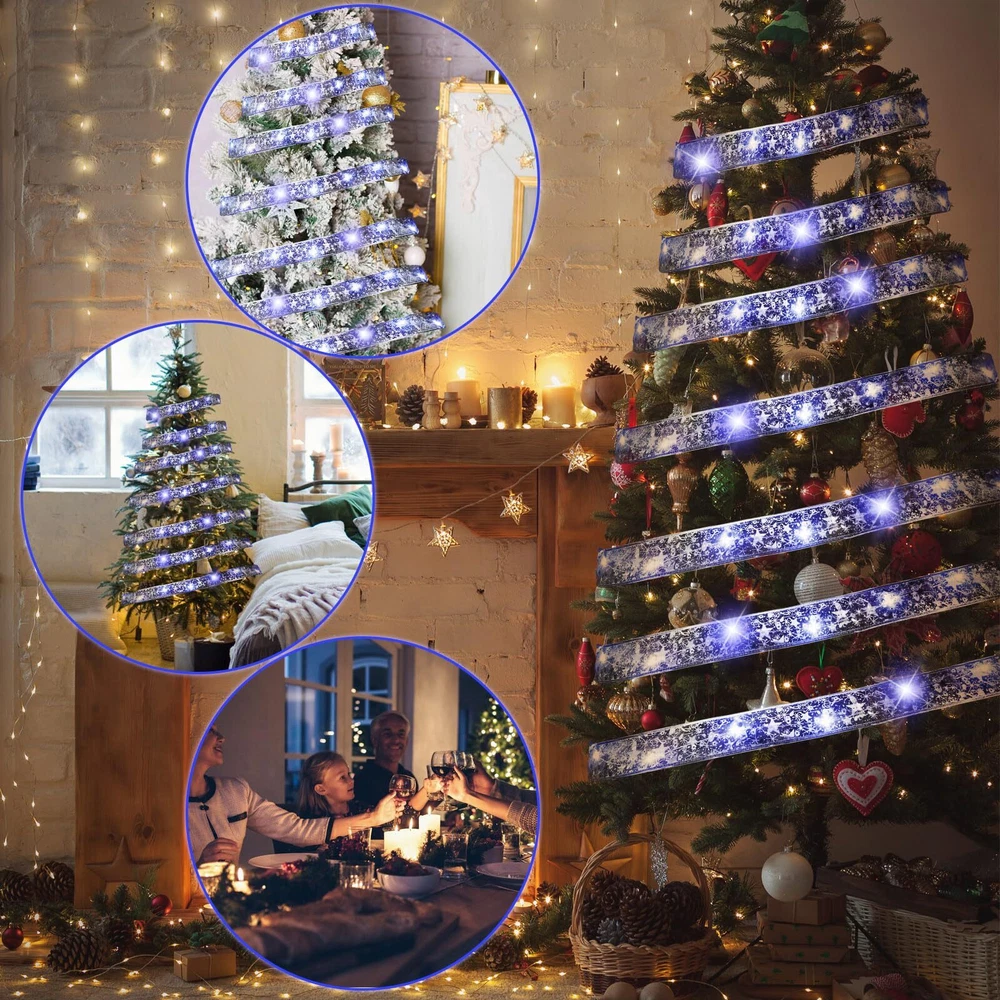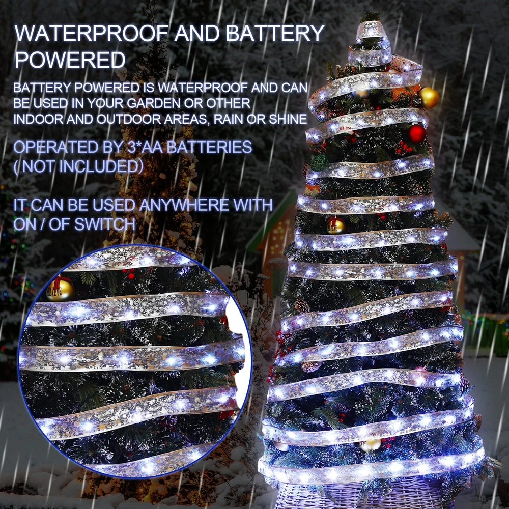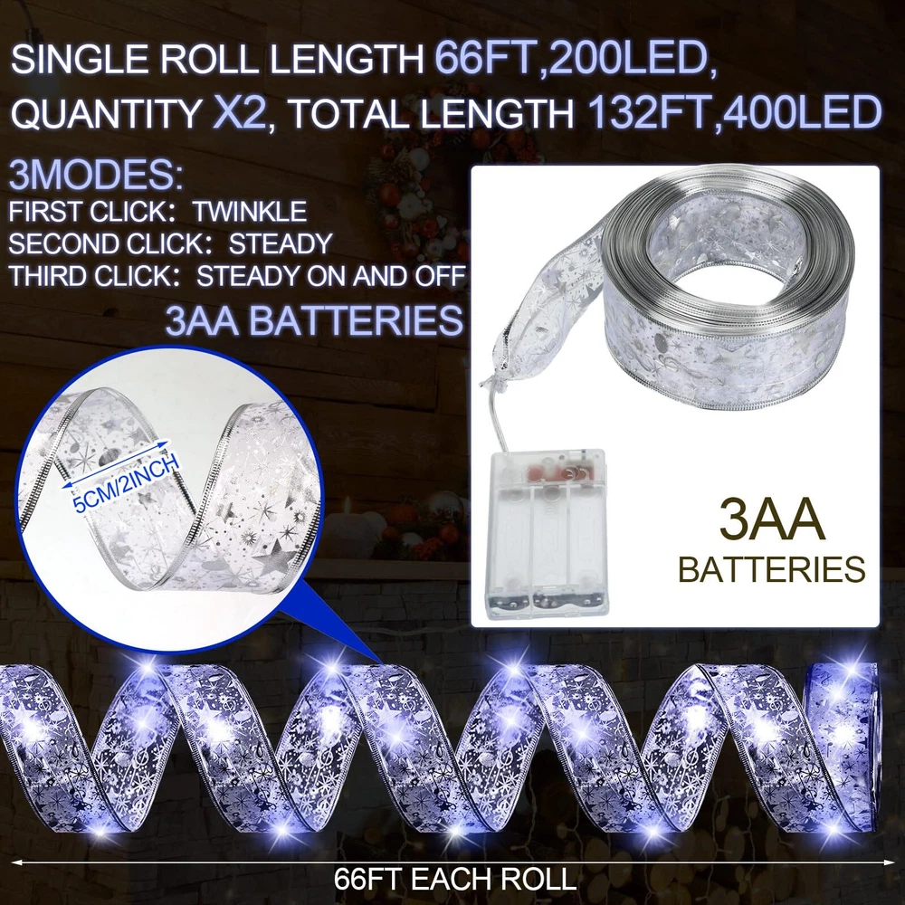 Features: The LED fairy lights are reliable and durable, making them a nice lighting solution for both indoor and outdoor holiday decorations. Each of the Christmas battery LED light measures approximately 66 ft x 2 inch/ 20 m x 5 cm. The long and wide design maximizes its coverage, transforming your home into a festive spectacle in no time Specifications: Material: quality copper wire Color: as shown picture Size: about 66 ft x 2 inch/ 20 m x 5 cm each Package includes: 2 x Christmas tree ribbon lights Notes: The light is powered by 3 AA batteries (not included). Manual measurement, please allow slight errors on size. The color may exist a slight difference due to different screen displays. Package Includes: you will get 2 pcs Christmas tree ribbon lights, each has 200 LED lights, which means twice the shine for your decorations; You can string these lights around your Christmas tree or hang them in your living room to add ambiance and a shining glow Reliable Material: crafted from quality copper wire, these Christmas tree fairy lights are designed to ensure durability and long usage; They also adopt double sided embroidery and tight knitting technology, exquisite and delicate Battery Powered: our Christmas lights are battery operated, powered by 3 AA batteries (not included), without worrying about whether there is a plug or socket nearby; There are 3 modes to choose from: flashing, steady on and close Nice Christmas Gift: these battery operated string lights are an ideal Christmas gift for your friends and family; Their ease of use and wider application make them a delightful gift that can illuminate and accentuate your loved ones' holiday decor Wide Application: these LED ribbon lights can be applied to decorate your Christmas trees, patios, gardens, staircases, rooms, bedrooms, living rooms, hallways, weddings, party places, etc