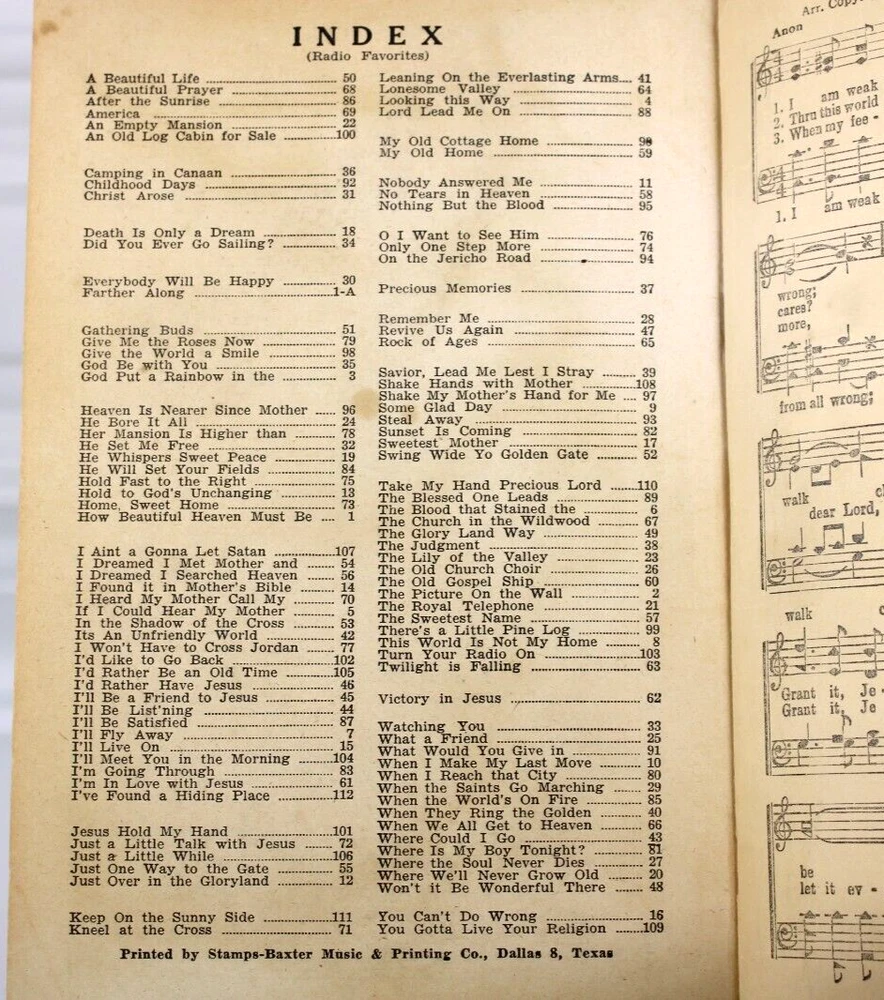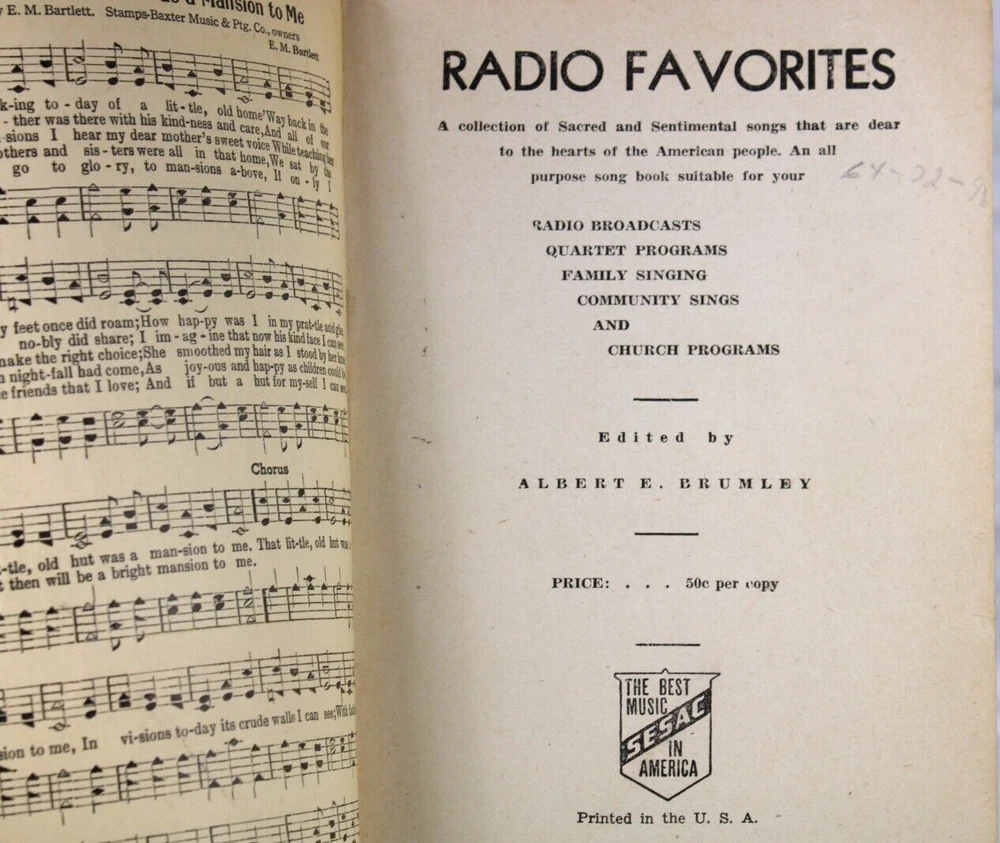 VINTAGE 1946 ALBERT E BRUMLEYS BOOK OF RADIO FAVORITES SC CHRISTIAN SHEET MUSIC VINTAGE FROM 1946 ITS ALBERT E BRUMLEYS BOOK OF RADIO FAVORITES OVER 100 PAGES WITH FOUR PART HARMONY ARRANGEMENTS OVER 100 CHRISTIAN SONGS MOSTLY FROM THE 1920'S AND 1930'S PAPERBACK BOOK DATED 1946 GREAT PIECE OF HISTORY AND A NICE COLLECTORS ITEM ✨✨✨ BOOK IS IN GOOD CONDITION ALL PAGES INTACT AS WELL AS THE BINDING, THE STAPLES ARE SECURE. THE BACK OF BOOK HAS SOME WRITING TWO OTHER PAGES HAVE A FEW MINOR PENCIL MARKS THE BACK OF BOOK HAS A FEW MINOR STAIN SPOTS THE BOOK IS IN OVERALL NICE CONDITION AND INTACT FOR AN ALMOST 80 YEAR OLD PAPERBACK NONE OF THE PAGES HAVE ANY TEARS. WOULD MAKE A GREAT GIFT ADD TO YOUR LIBRARY Will ship to you with great care. Will ship to the United States and Protectorates via USPS International shipments will ship via Ebay's Global Shipping Program (GSP) International packages will ship within one business day to eBay's GSP. eBay's GSP will then ship the package internationally. Handling and Shipping times may vary with GSP. Brought to you by The VinKris Collection