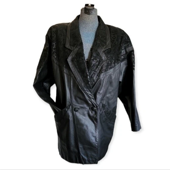 This leather coat is so cool! Vintage as anything, black leather with a paisley-floral style embossed detail around the yoke or shoulders. This does have shoulder pads. It's in very good condition with just a few light spots on one side (puctured)pictured. They are present but not easy to see. Please note that the fit is Oversozed, so the shoulders are bigger and the sleeves a bit shorter. Approximate measurements: Chest - 23" Length - 31" Sleeves - 19" Shoulders - 26" Around the hips area is about 21"