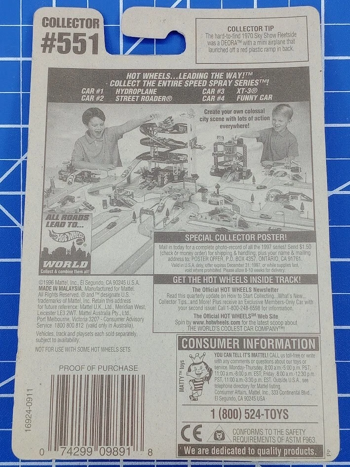 This vintage Hot Wheels diecast model car is a must-have for any collector or fan of cars. Made in 1994, this limited edition XT-3 model is part of the Hot Wheels Hot Trucks series and has a 1:64 scale. The black color and detailed design make it a standout addition to any collection. Recommended for ages 3 and up, this Hot Wheels car is perfect for both boys and girls. Its features include a limited edition design and it is made of high-quality diecast material. This model is from the Cars character family and is a great addition to any toy or hobby collection. VINTAGE 1996 HOT WHEELS XT-3 #551 SPEED SPRAY SERIES 3/4 NIP Diecast Model Car SKU#008560 Look closely at the pictures to see further details. PLEASE see photos for detailed condition!! PLEASE LOOK AT THE PHOTOS CAREFULLY BEFORE PURCHASING!! If you are purchasing more than one item from us and would like combined shipping, PLEASE request an adjusted invoice from us while still in the cart and BEFORE paying. eBay does not usually calculate combined shipping accurately and you might get overcharged. Please be aware that when we photograph items, we use lighting that will show the details well. Although we try to present the product as accurately as possible, the lighting may affect the overall look of the item by appearing lighter/darker or possibly a different hue than the actual item. Depending on the type of lighting you have in your home, there may be some differences between the photos and the actual item. If this is a concern of yours, please feel free to request additional photos made in natural lighting or ask for a more detailed description of the item PRIOR TO PURCHASE! PLEASE NOTE: We greatly appreciate your interest in our item for sale. We look forward to a pleasant, quick and satisfying transaction for everybody, so please note the following information before bidding. Thank you! ITEM DESCRIPTIONS: * We will try to describe items well and provide plenty of photos. Please review these carefully before bidding or purchasing. * Only the items pictured and described are what you will receive when purchased. * We will occasionally offer an item clearly marked "AS-IS". This means that we are not sure if it works because we are unable to test it for whatever reason. We will offer these at a discounted price then a similar "working" item. It is possible that these items will work fine, but it also is possible that these items are more useful for their parts. Please only bid on or purchase these items if you are well aware of this, as we will only provide refunds of actual item price (no shipping cost refunds) for these items. * If you have any questions that aren't addressed by the descriptions or photos, please feel free to ask before you bid. * There may be bends, dents or parts of the blister that have minor issues due to long term storage Or plastic that is failing apart, paint wear, marks from items own packaging. Such things will be pointed out under the description, please look closely at the pictures for further details. PLEASE see photos for detailed condition!! PLEASE LOOK AT THE PHOTOS CAREFULLY BEFORE PURCHASING!!
