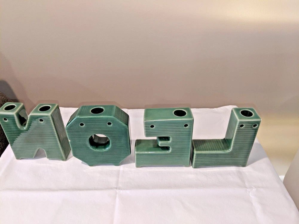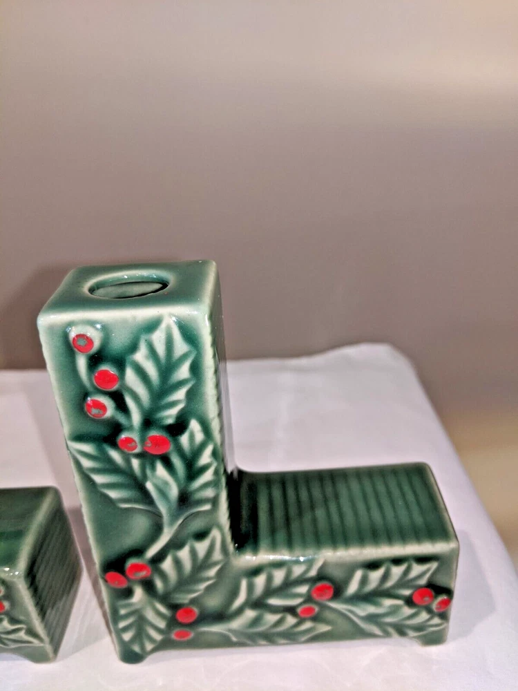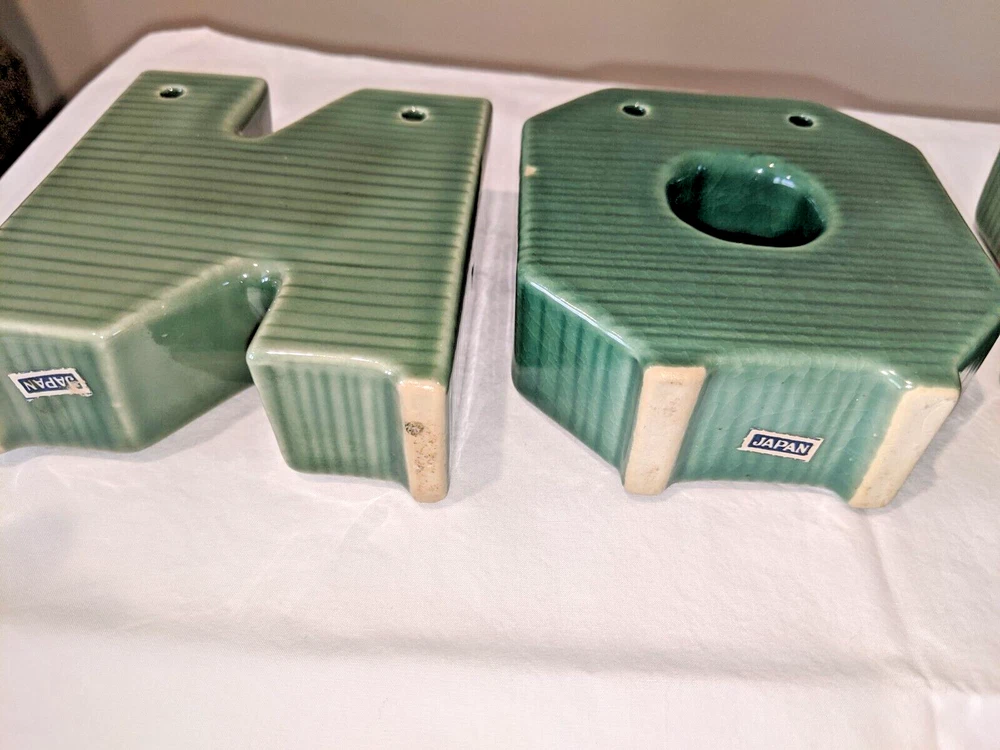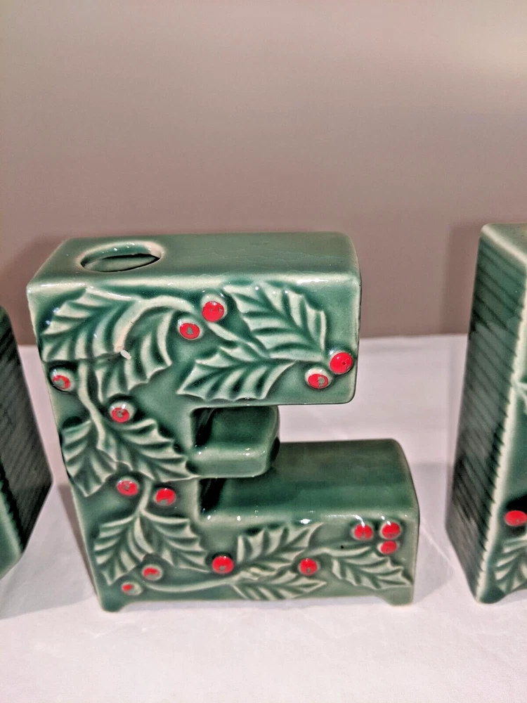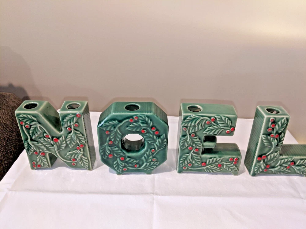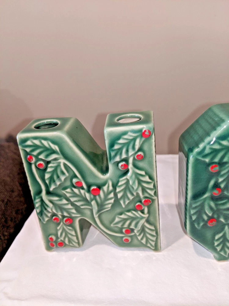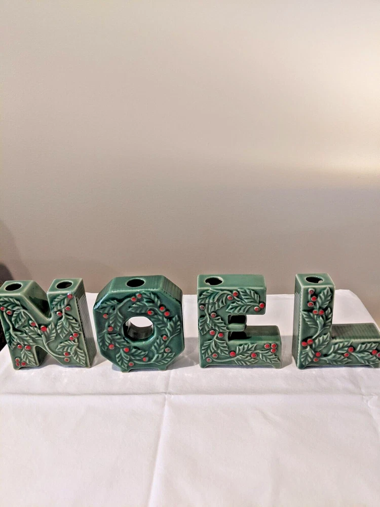 Vintage made in Japan 4 piece NOEL candle holders in holly design all pieces are in very good condition with NO chips or cracks stand 4" high have a spot for your candles or an opening on the back for hanging are all separate and can be spaced for your own greeting have the original Japan sticker on the bottom and come from a smoke free home. I do not ship outside the United States.