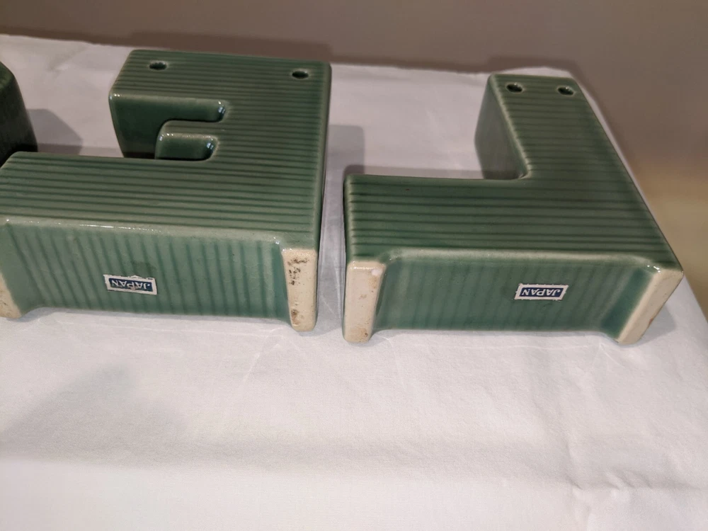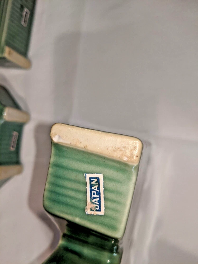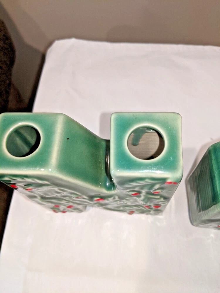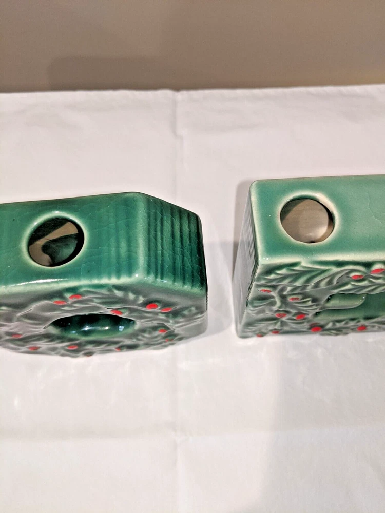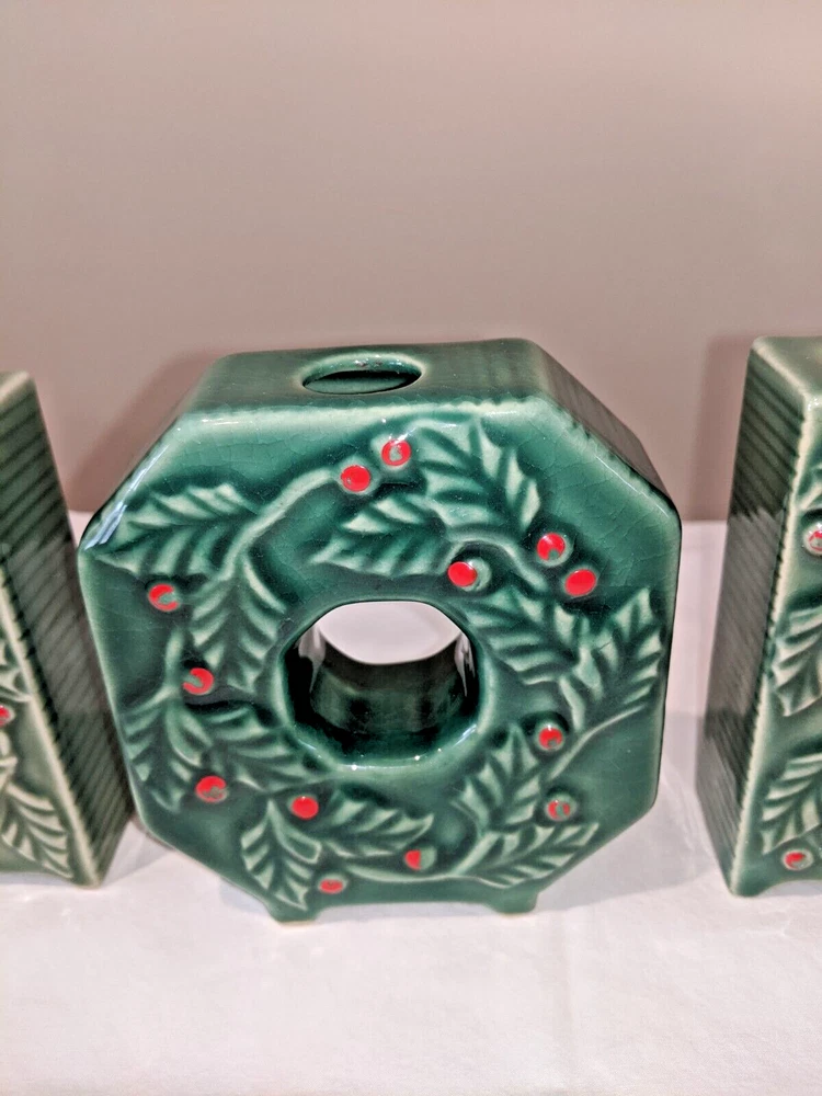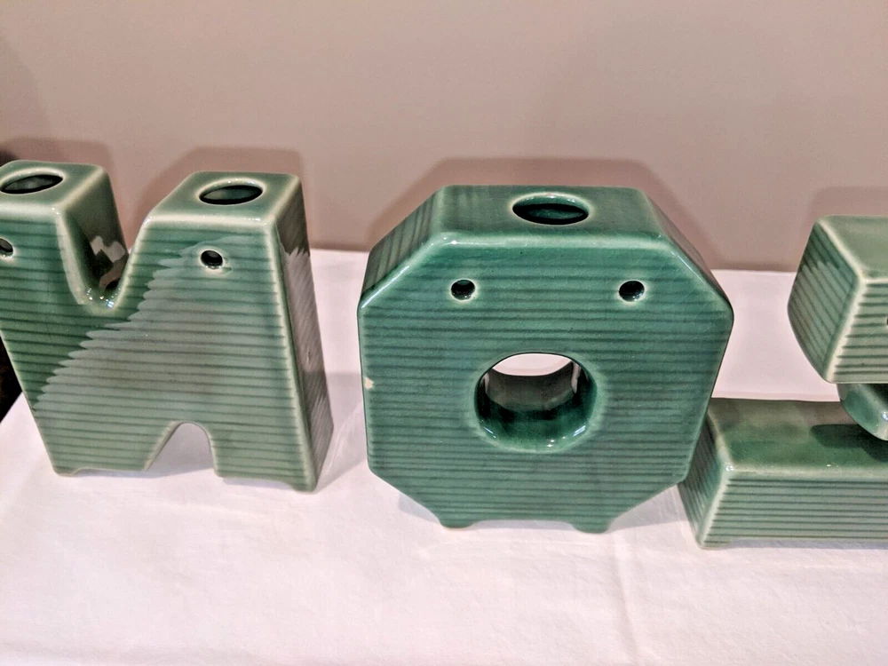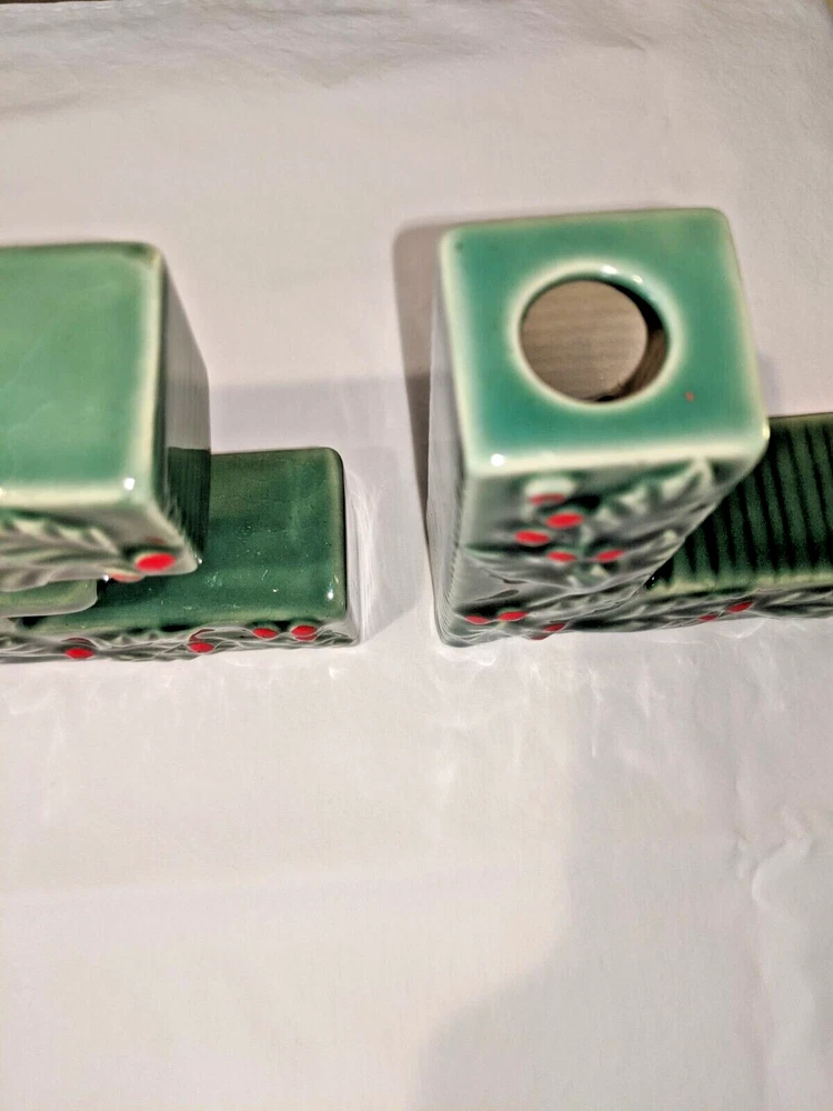 Vintage made in Japan 4 piece NOEL candle holders in holly design all pieces are in very good condition with NO chips or cracks stand 4" high have a spot for your candles or an opening on the back for hanging are all separate and can be spaced for your own greeting have the original Japan sticker on the bottom and come from a smoke free home. I do not ship outside the United States.