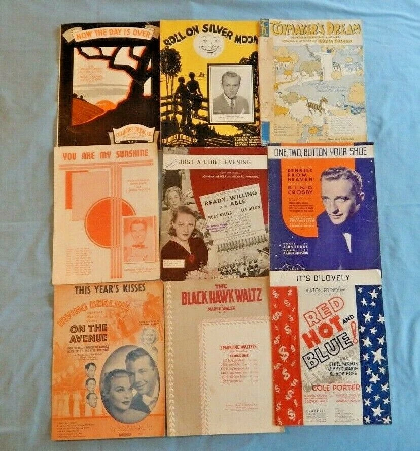This is a random selection of 9 pieces of vintage sheet music, mostly from the 1930's but may contain some more recent selections. Please examine the photos carefully, as this is exactly what you will receive. Feel free to ask any and all questions before bidding or buying. We are listing several lots from this collection, and will certainly combine shipping for other purchases. Buyer will pay the Actual Shipping Costs based on the Size, Weight and Destination of the Package. Thanks for Looking, and Good Luck! BS 07/12/21. Lot A.