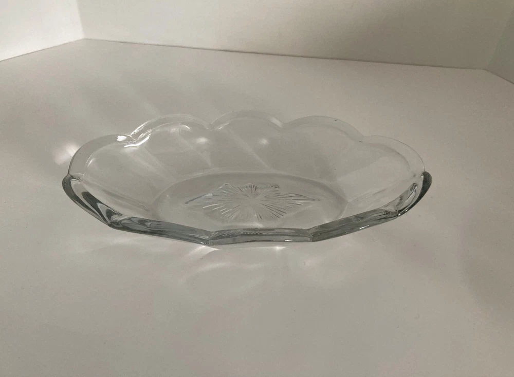 Vintage Clear Glass Oval Banana Split Dish or for Relish, Snacks, etc. Excellent condition – no chips or cracks Scalloped Rim – Starburst Design in Bottom 7 1/2” Long – 4” Wide – 1 ¼” Tall May be Depression Glass – it’s from a family member’s estate and she collected mostly Depression Era Glassware. Not sure of the pattern. Smoke free home – PPU if located in or near Howell, Michigan