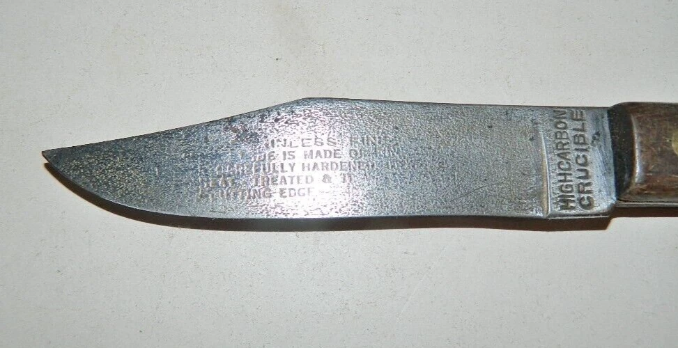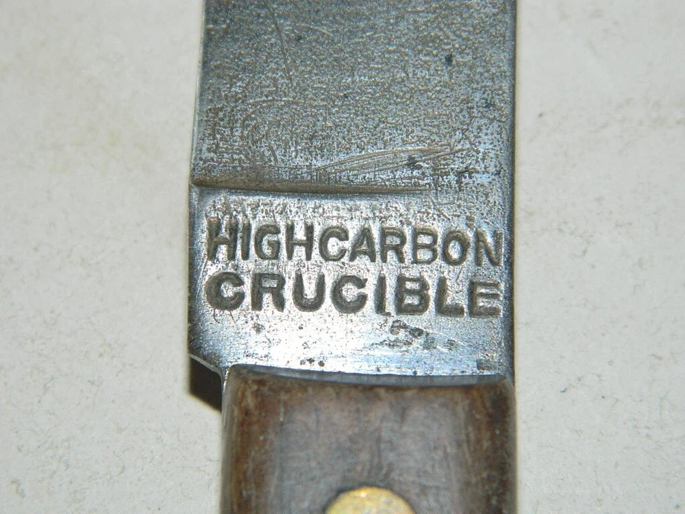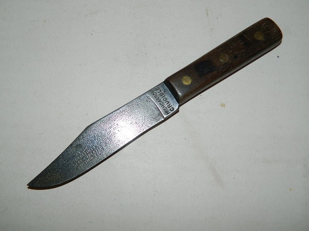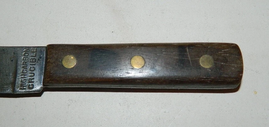 VINTAGE FIXED BLADE KITCHEN KNIFE HIGH CARBON CRUCIBLE Up for auction today is a real nice VINTAGE FIXED BLADE KITCHEN KNIFE – HIGH CARBON CRUCIBLE. The knife measures approx. 8” long with the blade measuring approx. 4-3/8” long. The knife is in real nice used condition with minor wear , including some light patina . (See photo for details). The photos show the item or items you are bidding on. This item comes a smoke free house. The buyer pays a fixed price for US postage or the calculated rate for international postage. I will combine shipping whenever possible but may require a slight increase in postage. Please take a look at my other items up for sale or auction. Thank-you for looking at my auction, happy bidding and good luck.