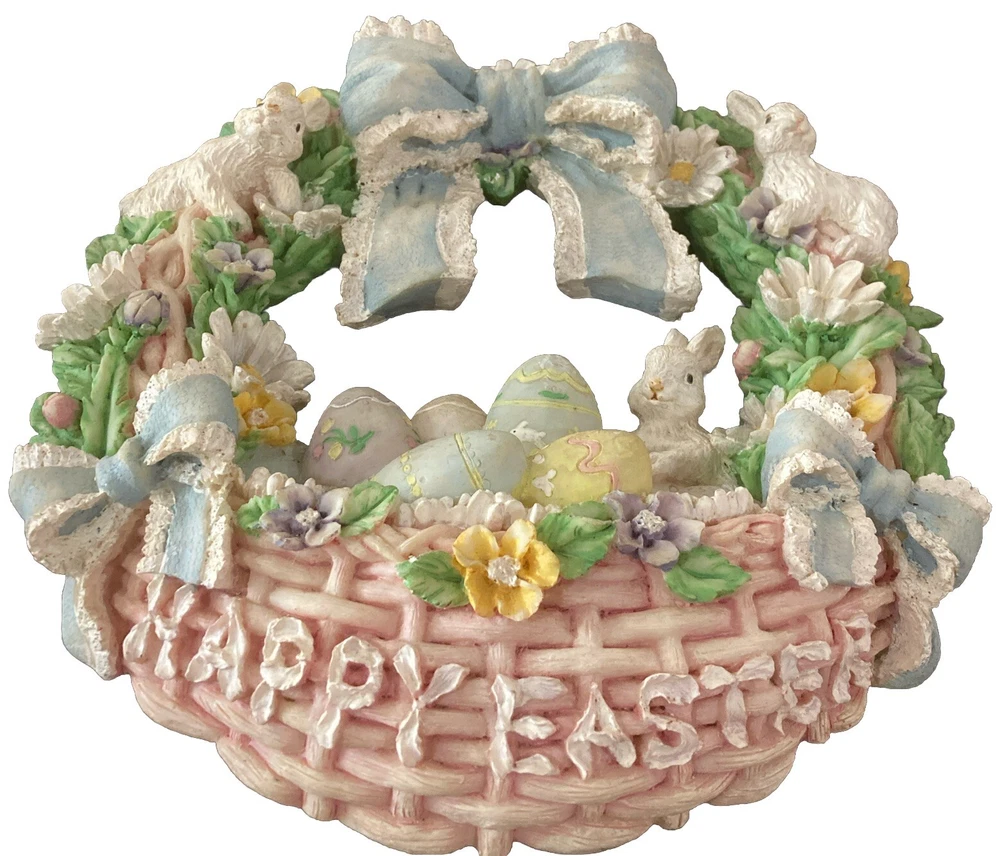 This vintage ceramic figurine from Spring brand features a hand-painted design of a colorful Easter wreath with flowers, bunnies, and eggs. Measuring 11.5 inches in length, it has a matte finish and is perfect for adding a festive touch to your Easter decor. Whether displayed on a mantel, shelf, or table, this medium-sized figurine is sure to bring joy to your home.