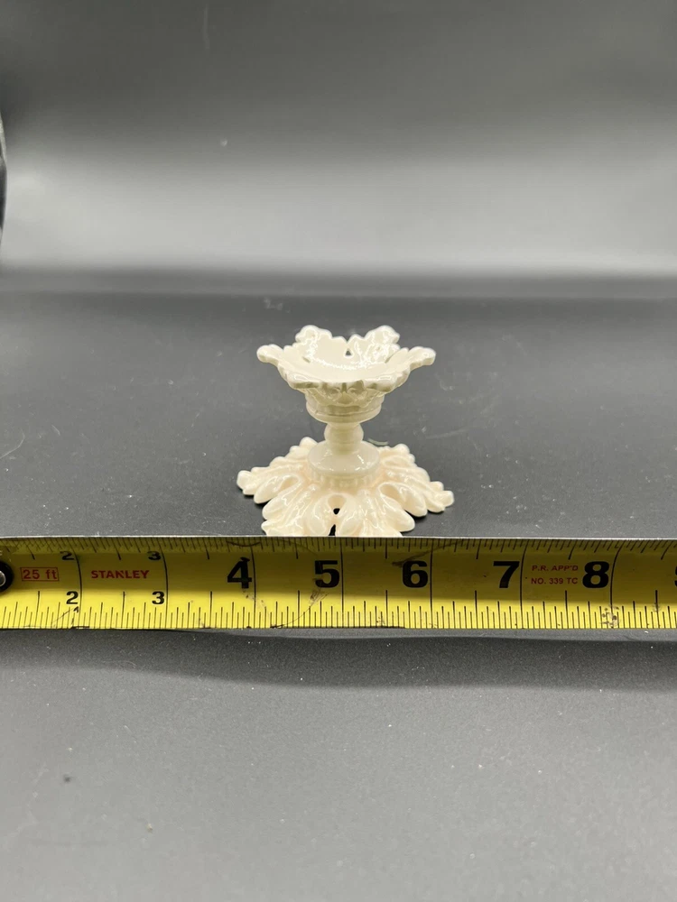 This is a vintage Lenox porcelain china candlestick in an ornate Victorian style. The candle holder is designed with a glossy ivory finish, featuring a luminous quality that adds elegance to any setting. Made in the United States, this single candlestick is adorned with Aquarius motifs and is a collectible piece suitable for all occasions. Perfect for adding a touch of sophistication to your decor, this Lenox candle holder is a timeless and exquisite addition to any home.
