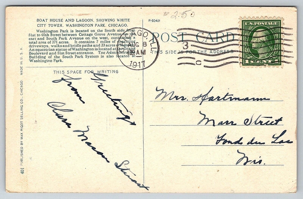 Antique: Yes Finish: Matte gtin13: DOES NOT APPLY Number of Items in Set: 1 Features: Divided Back, Stamp, Stamped, White Border, Original Genuine Antique Vintage Postcard Stamp: Yes Subject: Cities & Towns Occasion: Postcard Seller Notes: “Good Vintage Condition. See Pictures And Description Closely For Details.” Color: Multicolor Continent: North America City: Chicago Region: Illinois Time Period Manufactured: NA Franchise: Postcard Orientation: Horizontal Material: Paper Theme: Architecture, Cities & Towns, Community Life, Cultures & Ethnicities, Domestic & Family Life, Famous Places, Fashion, Historical Figures, Landscapes, Nautical, People, Roadside America, Seasons, Social History, Tourism, Transportation, Travel, Postcard, Antique, Vintage, Ephemera, Collectible, Memorabilia, Old, Retro, History, Card, Mail, Paper Original/Licensed Reprint: Original Postage Condition: Posted Year Manufactured: 1917 Brand/Publisher: MAX RIGOT SELLING COMPANY, CHICAGO, ILLINOIS Vintage: Yes Location: Chicago, Illinois USA Signed By: Sender Featured Person: People Character: Postcard Type: VINTAGE OLD ANTIQUE POSTCARD Country/Region of Manufacture: United States Size: Standard (5.5 x 3.5 in) UPC: DOES NOT APPLY Era: Divided Back (1907-1915) Country: United States Posted: Yes Signed: Yes Unit of Sale: Single Unit Artist: Postcard
