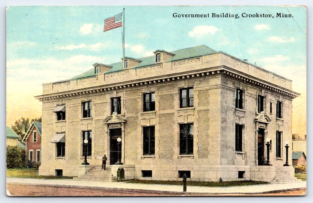 VINTAGE OLD ANTIQUE POSTCARD GOVERNMENT BUILDING USA FLAG CROOKSTON MINNESOTA