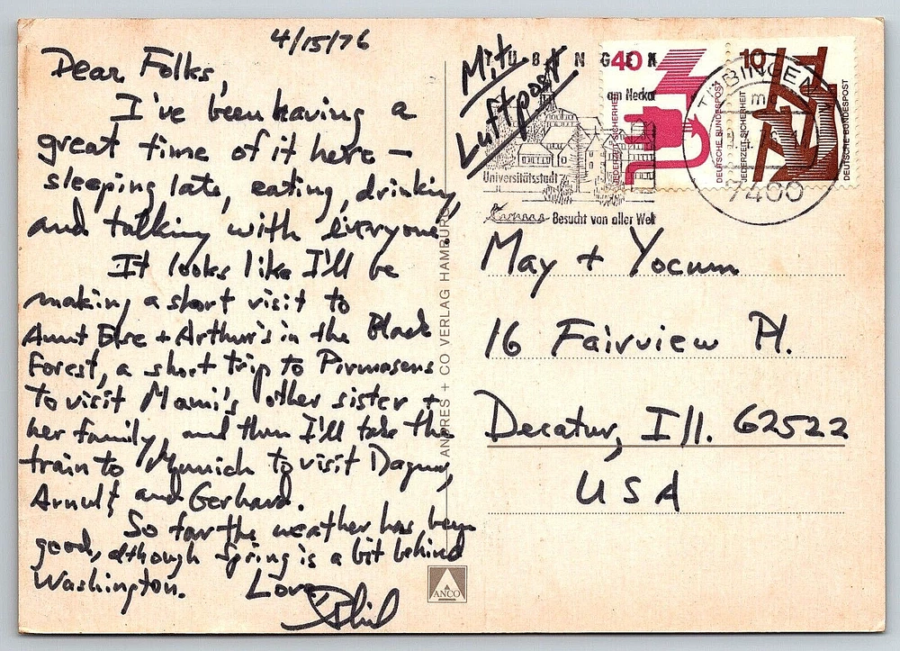 Postage Condition: Posted Subject: Cities & Towns Character: Postcard Signed By: Sender Color: Multicolor Vintage: Yes Signed: Yes Stamp: Yes Occasion: Postcard Artist: Postcard Featured Person: People Continent: Europe Franchise: Postcard Country: Germany Orientation: Vertical Unit of Sale: Single Unit Year Manufactured: 1976 UPC: DOES NOT APPLY Region: Reutlingen Brand/Publisher: ANDRES & CO. Seller Notes: “Good Vintage Condition. See Pictures And Description Closely For Details.” Features: Divided Back, Stamp, Stamped, Original Genuine Antique Vintage Postcard Era: Divided Back (1907-1915) Country/Region of Manufacture: Germany Finish: Glossy Location: Reutlingen, Germany Original/Licensed Reprint: Original gtin13: DOES NOT APPLY City: Reutlingen Posted: Yes Theme: Architecture, Cities & Towns, Community Life, Countries, Cultures & Ethnicities, Domestic & Family Life, Famous Places, Fashion, Greetings, Landscapes, People, Photographs, Seasons, Social History, Tourism, Transportation, Travel Size: Continental (6 x 4 in) Number of Items in Set: 1 Antique: Yes Material: Paper Type: VINTAGE OLD ANTIQUE POSTCARD Time Period Manufactured: 1970-1979