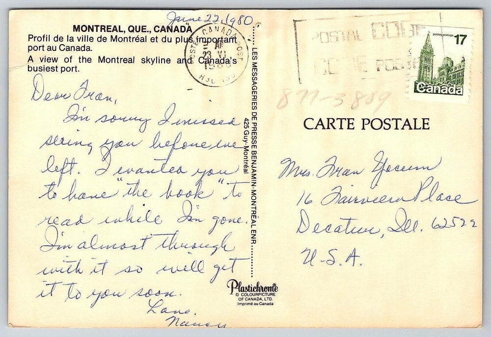gtin13: DOES NOT APPLY Number of Items in Set: 1 Location: Montreal, Canada Character: Postcard Antique: Yes Continent: North America Posted: Yes Unit of Sale: Single Unit Year Manufactured: 1980 Original/Licensed Reprint: Original Era: Divided Back (1907-1915) Featured Person: None Subject: Cities & Towns Material: Paper Country/Region of Manufacture: Canada Region: Ontario Franchise: Postcard City: Montreal Orientation: Horizontal Time Period Manufactured: 1980-1989 Signed By: Sender Artist: Postcard Finish: Glossy Color: Multicolor Signed: Yes Vintage: Yes Postage Condition: Posted Features: Divided Back, Stamp, Stamped, Original Genuine Antique Vintage Postcard Occasion: Postcard Stamp: Yes Seller Notes: “Good Vintage Condition. See Pictures And Description Closely For Details.” UPC: DOES NOT APPLY Country: Canada Theme: Architecture, Cities & Towns, Community Life, Domestic & Family Life, Famous Places, Historical Figures, Landscapes, Nautical, Photographs, Seasons, Social History, Technology, Tourism, Transportation, Travel, Postcard, Antique, Vintage, Ephemera, Collectible, Memorabilia, Old, Retro, History, Card, Mail, Paper Type: VINTAGE OLD ANTIQUE POSTCARD Size: Continental (6 x 4 in)