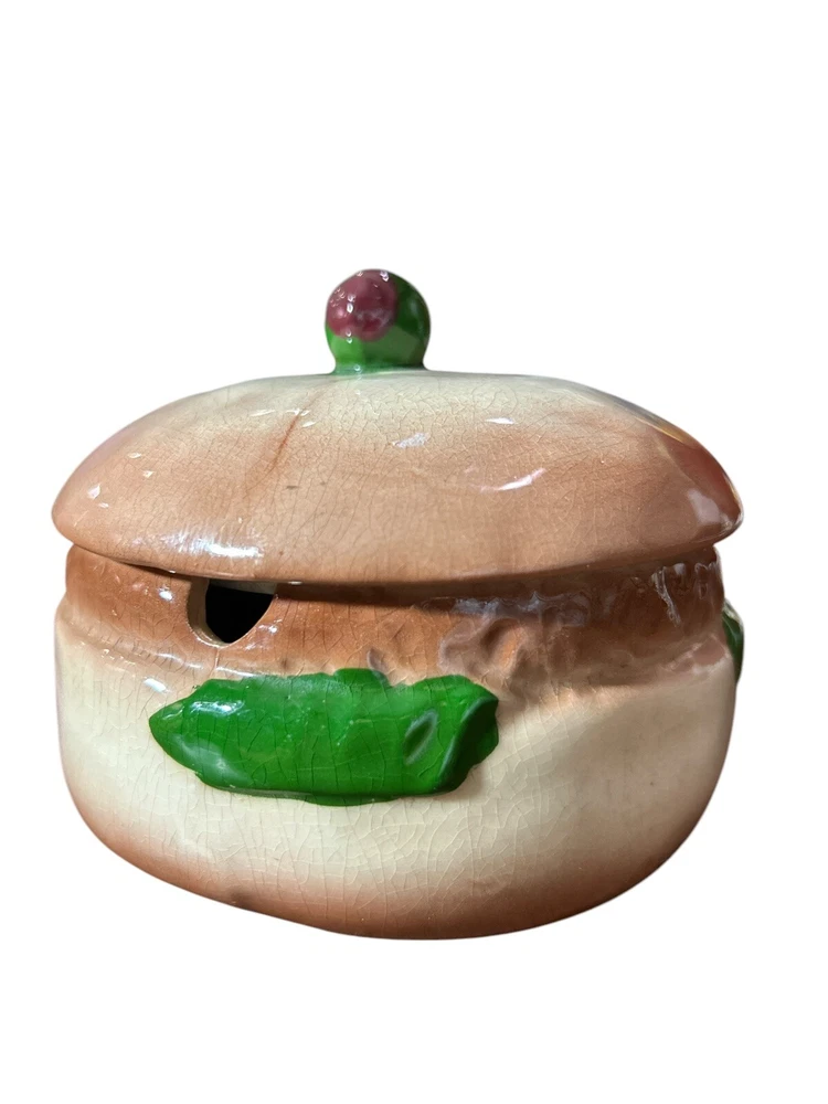 This vintage relish container is a unique addition to any kitchen or collection. Hand painted and made of ceramic, this covered dish features a round shape and a brown color with a hamburger pattern. The dish was manufactured in California in the 1950s and has a time period manufactured of 1950-1959. Measuring 3 1/2 inches in height, 4 1/2 inches in width, and 1 3/4 inches in depth, this dish has one compartment and weighs 1lb. The dish is antique and has a vintage look and feel. It is a perfect piece for those who love unique and one-of-a-kind items.