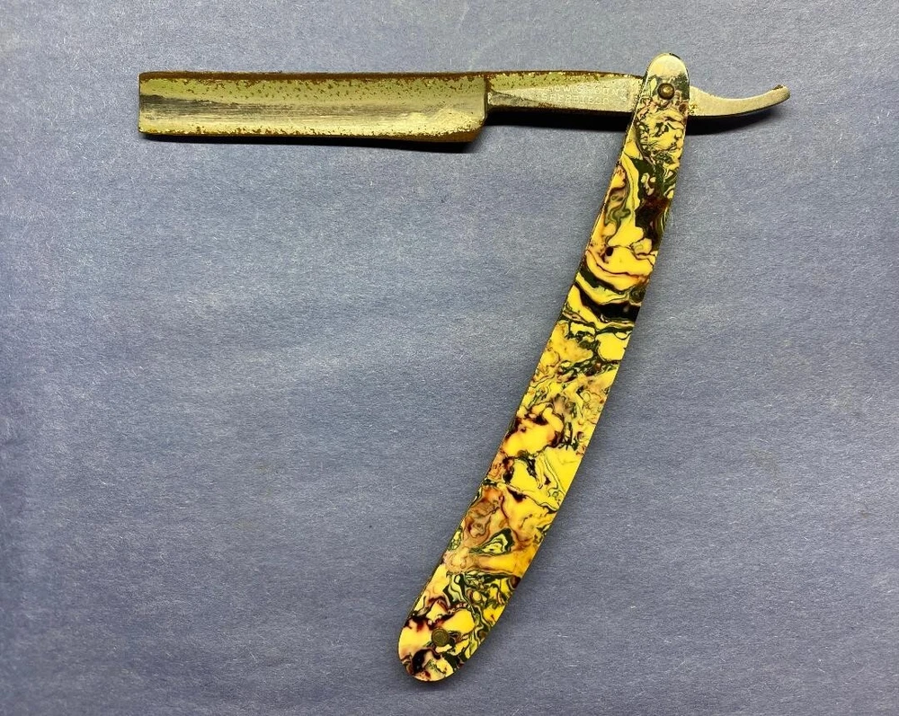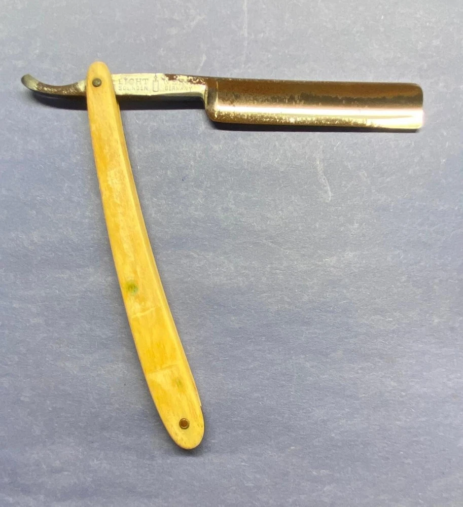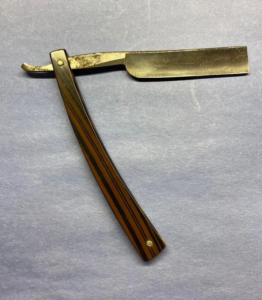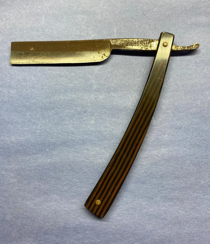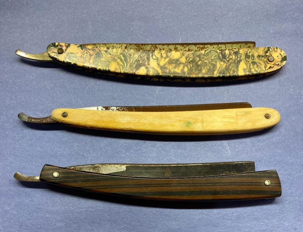 These 3 razors are in various conditions. "Extra Hollow Ground Sheffield" has nice scales with some rust on the blade. "Light Werk Solingen Germany Magnetic Blue Steel" has one good scale and one with an area of roughness along with some rust on the blade. "Royal Blue" has nice scales and some blade rust. Please see the photos for more details. Thanks for taking a look.