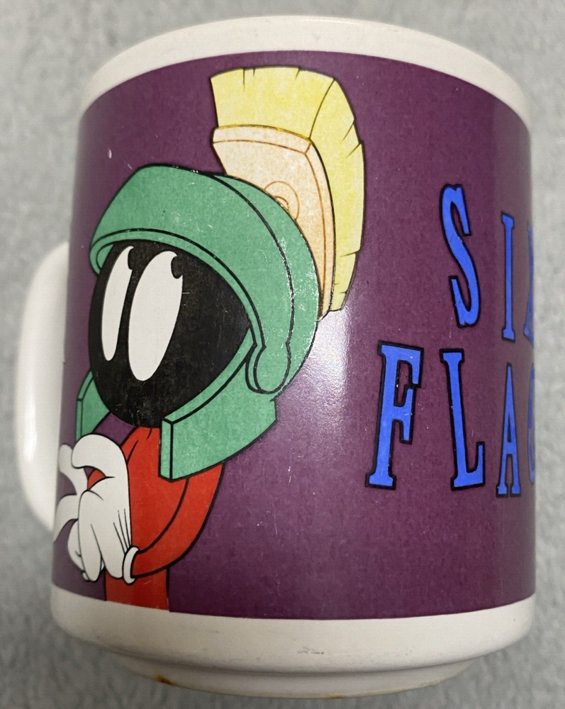 VTG 1994 Six Flags Park Marvin The Martian Graphic Coffee Cup Mug Looney Tunes Flaw - See minor chip on top rim shown in the photos for the actual item. Feel free to contact me with any questions. This vintage coffee mug features Marvin the Martian and Instant Martians from the Warner Bros franchise, perfect for fans of 90s cartoons and TV characters. The ceramic and porcelain mug has a multicolor design with a 3.2 inch diameter and is suitable for hot and cold beverages. With a height of 3.6 inches and width of 4.5 inches, it weighs 10.2 ounces and holds a service for one. The mug is decorated with a fun and fantasy theme, including cartoon and TV characters, animation, advertising, and film and TV elements. It is also microwave and dishwasher safe, has a convenient handle, and is from the Six Flags Park collection. This collectible item was manufactured in 1994 and is listed as vintage. It is perfect for all occasions and is sure to be a favorite for any coffee or tea lover. Shop our store with confidence as we offer 30-day returns on all purchases. Additionally you can save money by making multiple purchases to take advantage of our discount shipping policy. You will pay the highest shipping cost for a single item in your cart and $3 for each additional item.