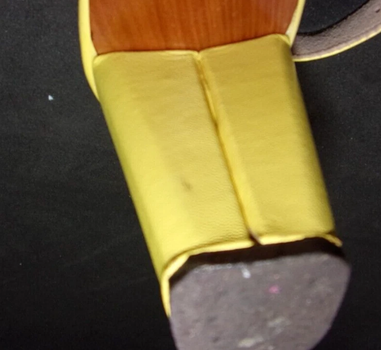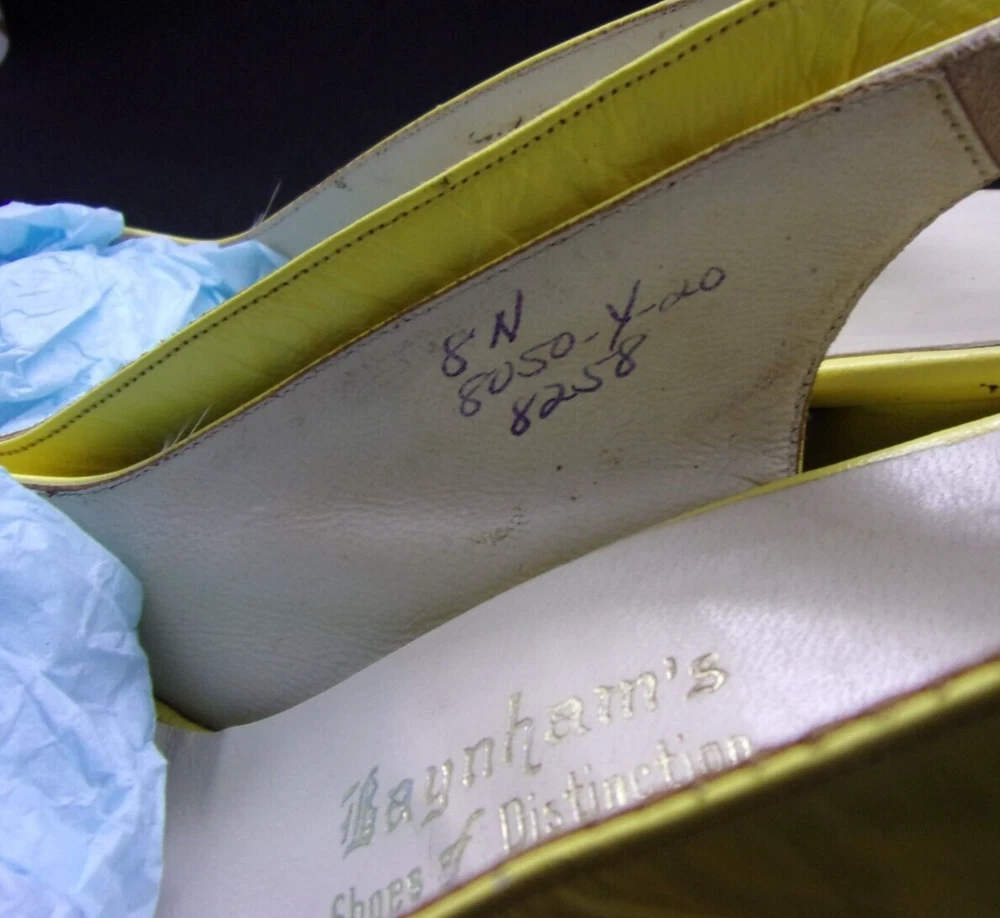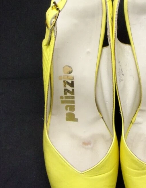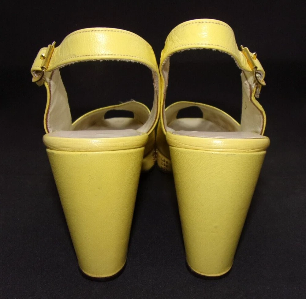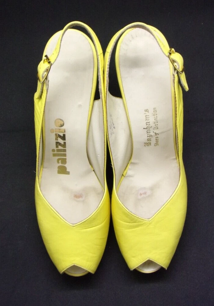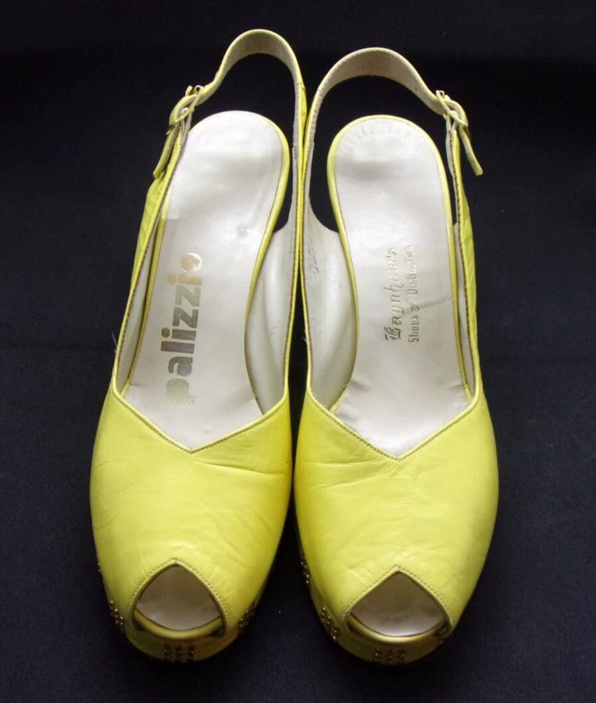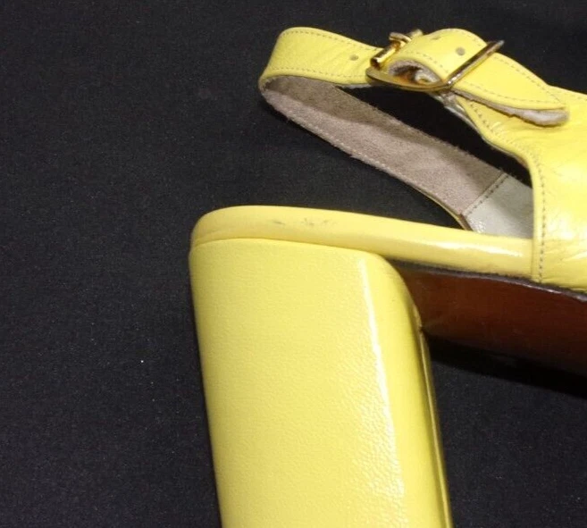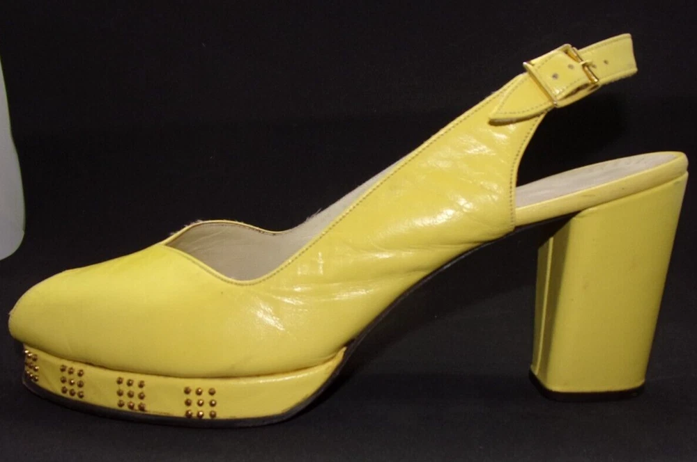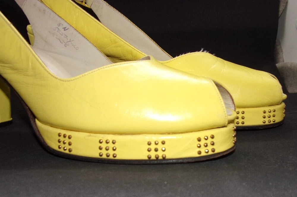 These vintage 1970's MOD, copy-off-the-40's, yellow open-toe platform, studded sling-back mules HAVE IT ALL! PLUS, they are in incredible condition for their age. These shoes are very well-made with yellow kid leather uppers which are supple and like new with no dry areas or cracking. The insoles are clean and unbroken with just a small amount of discoloration from wear. The buckles both work perfectly, the toes are not stretched out, and the heels and soles show very little wear. Every gold stud on the platform soles is intact without a single one missing. It appears that the shoes were only worn once, then put away and never worn again. There are a couple of tiny marks in the leather which I've shown in close-up in the last 2 photos, and they are hardly noticeable when the shoes are being worn. They measure: 10" from toe tip to heel, measured with a tape laid down flat on insole 3 1/4" heel 3 1/8" width This is the only pair on eBay like them! And they are a great size 8!