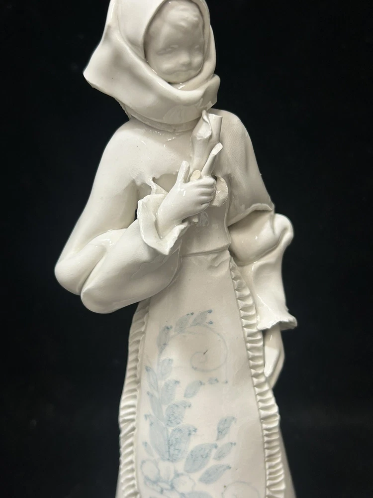 This beautiful sculpture by Fabio Mola depicts a Sardinian woman holding a flower, crafted from ceramic and porcelain in 1987. The intricate details showcase the rich Italian culture. Measuring 8 inches in height, this statue is a perfect addition to any art collection. The sculpture is signed by the artist and is a great representation of the people and cultures of Sardinia, Italy. This is a limited edition this is number 3 of 252 This appears to have a piece that has chipped off near the flower see photos