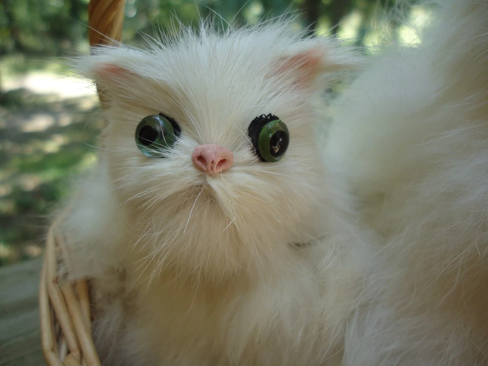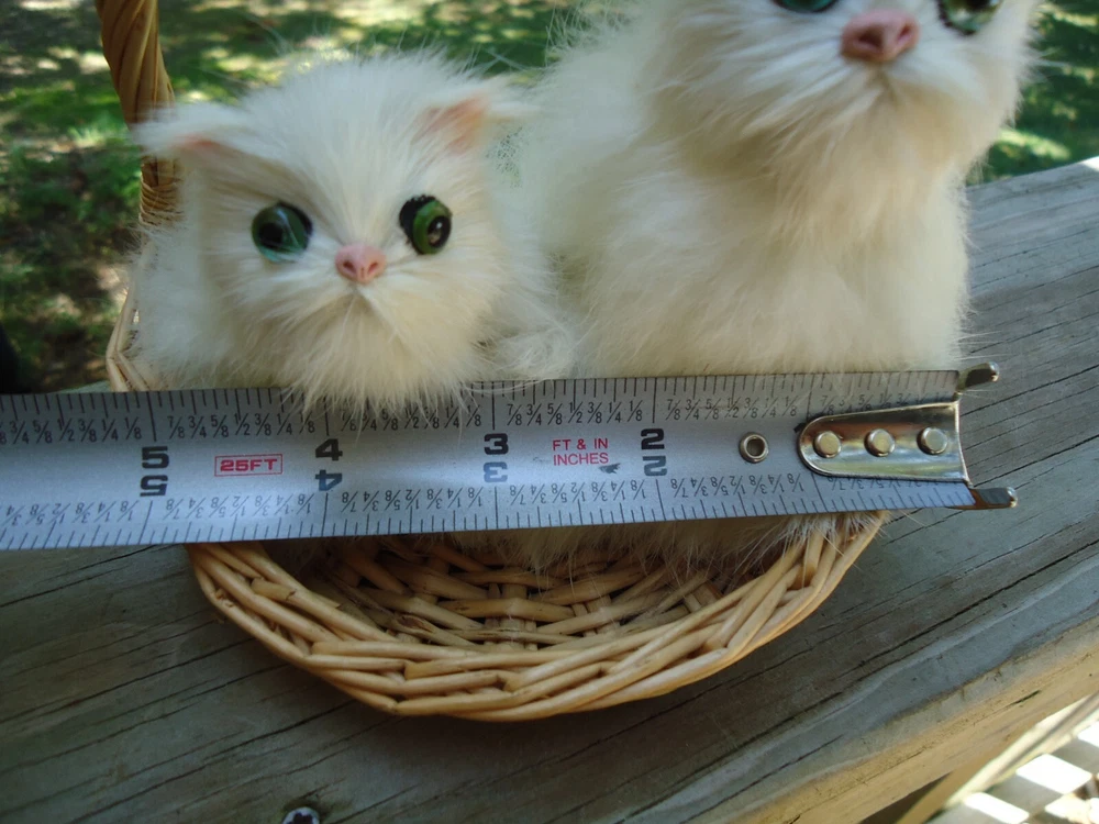 VTG Kittens Cats Wicker Basket Realistic Soft White Fur Glass Eyes Lifelike Mini