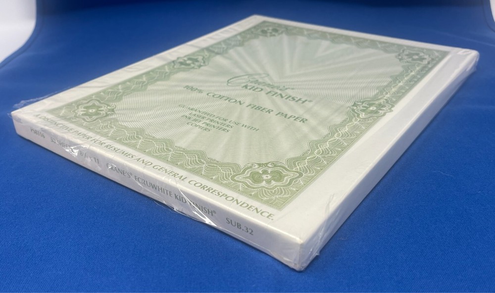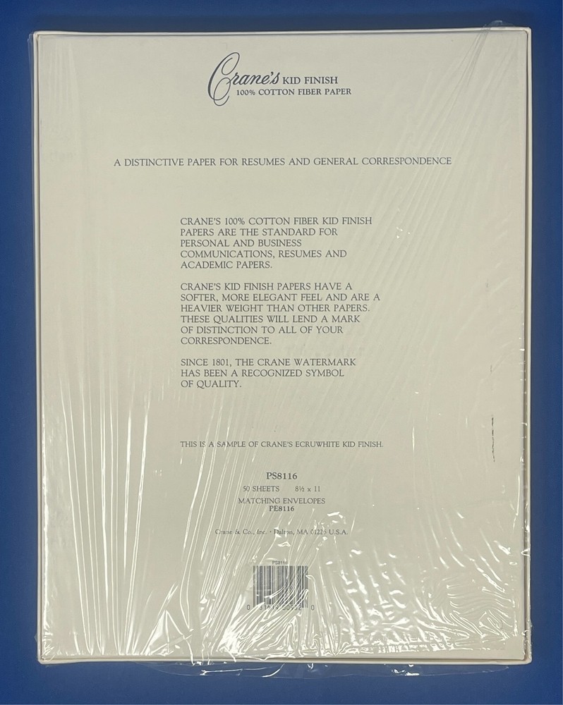 Vintage Crane & Co. Kid Finish 100% Cotton Fiber Paper (NO Envelopes, the back of the box simply states the matching envelope product number for reference) (A distinctive Paper for Resumes and General Correspondance) New Old Stock- Factory Sealed / Packaging (*NOTE that Plastic Shrink wrap is torn) Label Reads: PS8116 Size: 8-1/2 x 11 Kid Finish 100% Cotton Fiber Paper (50 Sheets) Box shows signs of handling and age wear, with a black spot on side of box & black scuff mark on back. The plastic wrap on the outside of the box is torn in several places (Please Zoom in on Photos), but Merchandise inside remains untouched. Item has been in a climate controlled storage room for 25 years, after the original owners closed their stationary store. I try my best to take good quality pictures so you can determine that the overall condition meets your requirements and expectations. Therefore, please zoom-in to review the condition of the product. I check each item before listing, and state in the description any flaws that I see. However, it is possible to make a mistake. If there is a problem with your purchase, please contact me, and I will try to resolve any issues you have. I strive for 100% customer satisfaction. Positive Reviews are very much appreciated! Return Policy: I accept returns within 15 days of purchase. Items must be returned in the same condition. Return shipping is the buyers responsibility. You will receive a refund for the actual cost of the item and the original postage fee only.